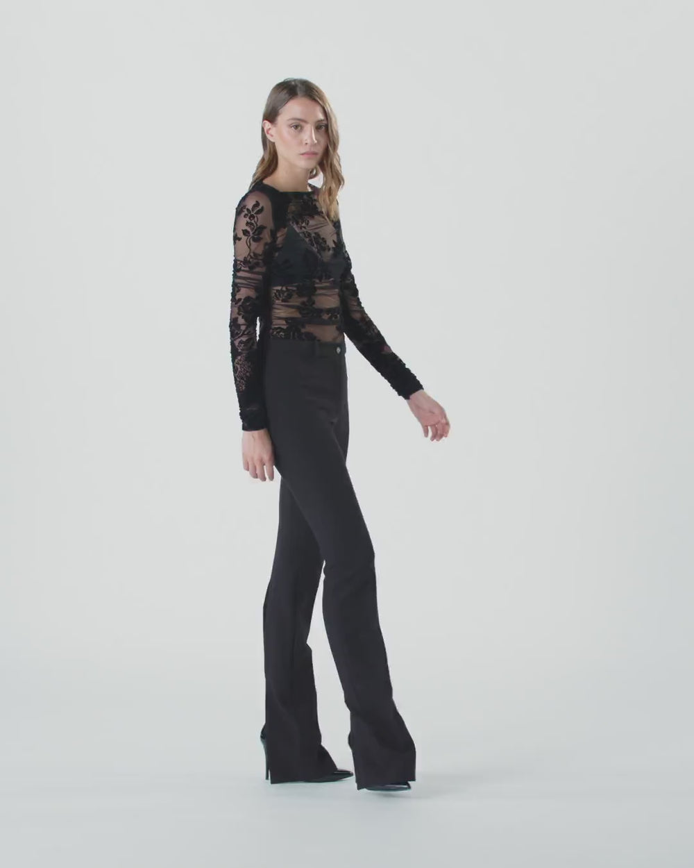 Maglia aderente a maniche lunghe realizzata in tulle trasparente e animata da una stampa flock: un design raffinato, ispirato ai motivi tapestry ma rinnovato da un twist moderno. Il tulle indemagliabile è un tessuto particolarmente resistente, che è stato sottoposto a uno speciale trattamento che consente alla maglia di non sfaldarsi in caso di rottura. L'effetto dévoré è ottenuto tramite una stampa flock che esalta il disegno floreale ricco di ramage e dettagli intricati, creando un gioco sofisticato che conferisce alla superficie profondità e una sensazione di tridimensionalità. Il contrasto tra la morbidezza della texture e la complessità del motivo floreale regala un impatto visivo e tattile di raffinata sensualità.