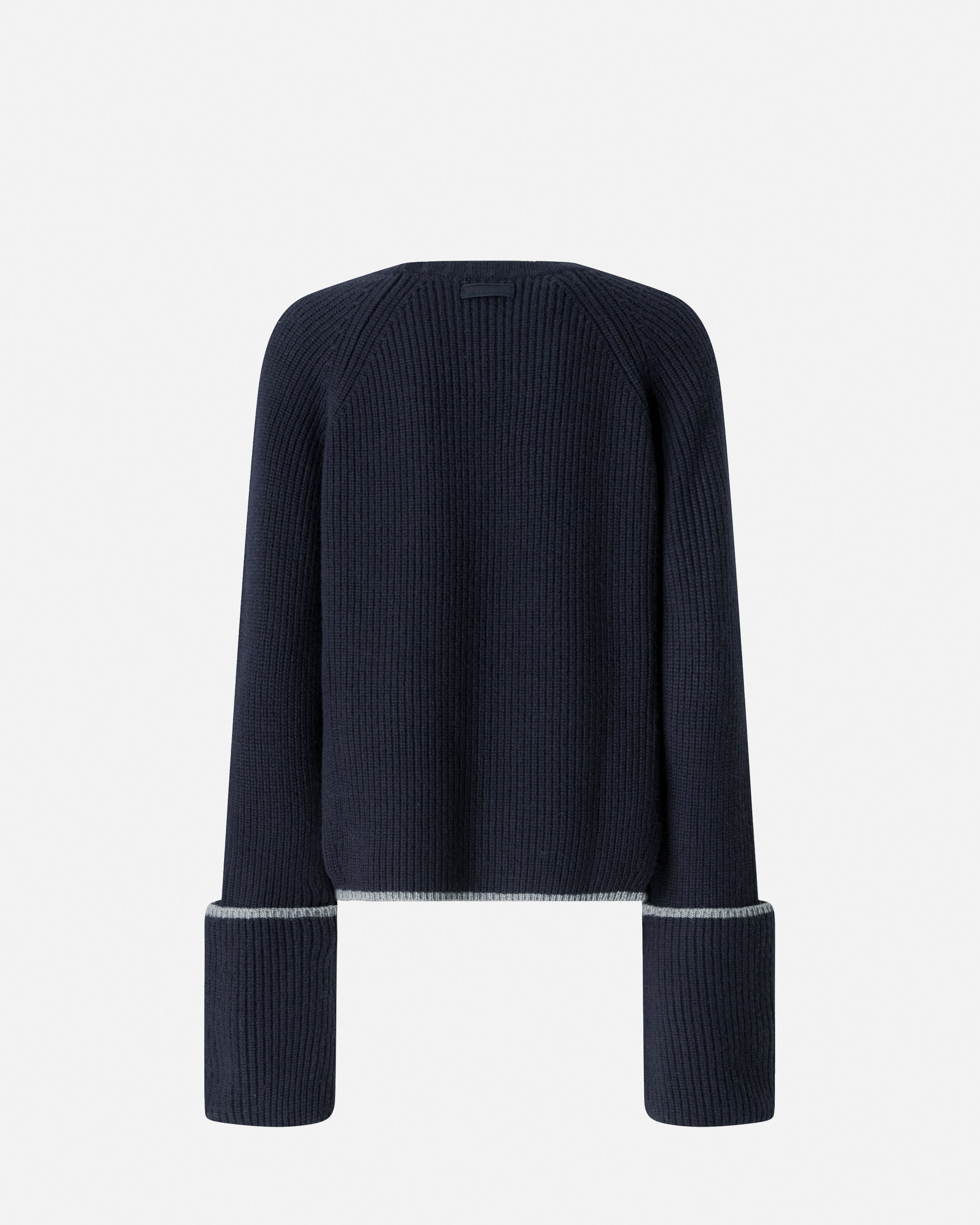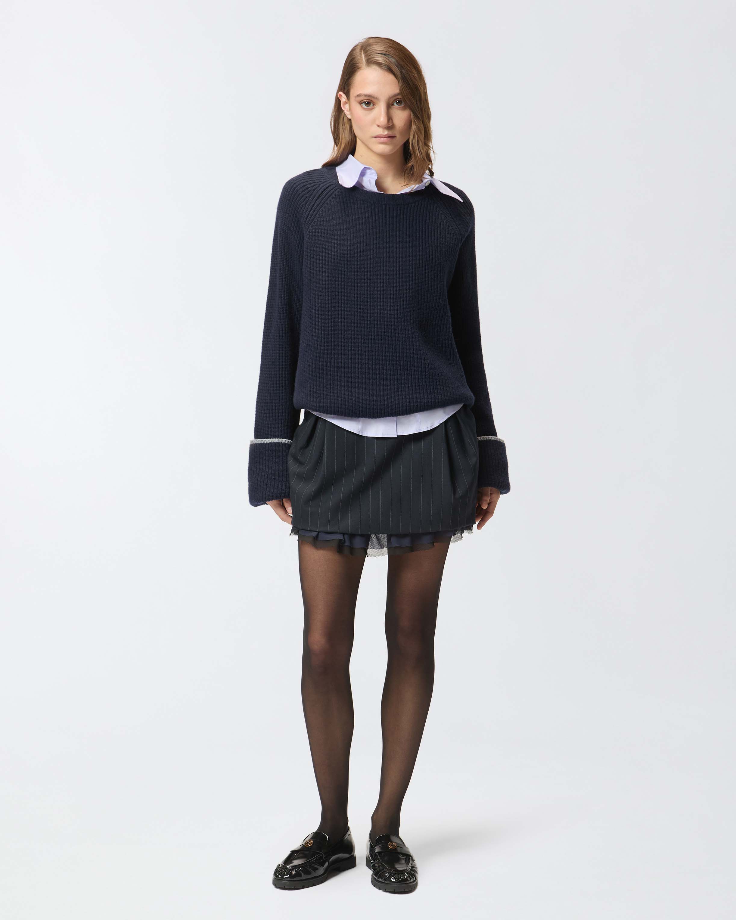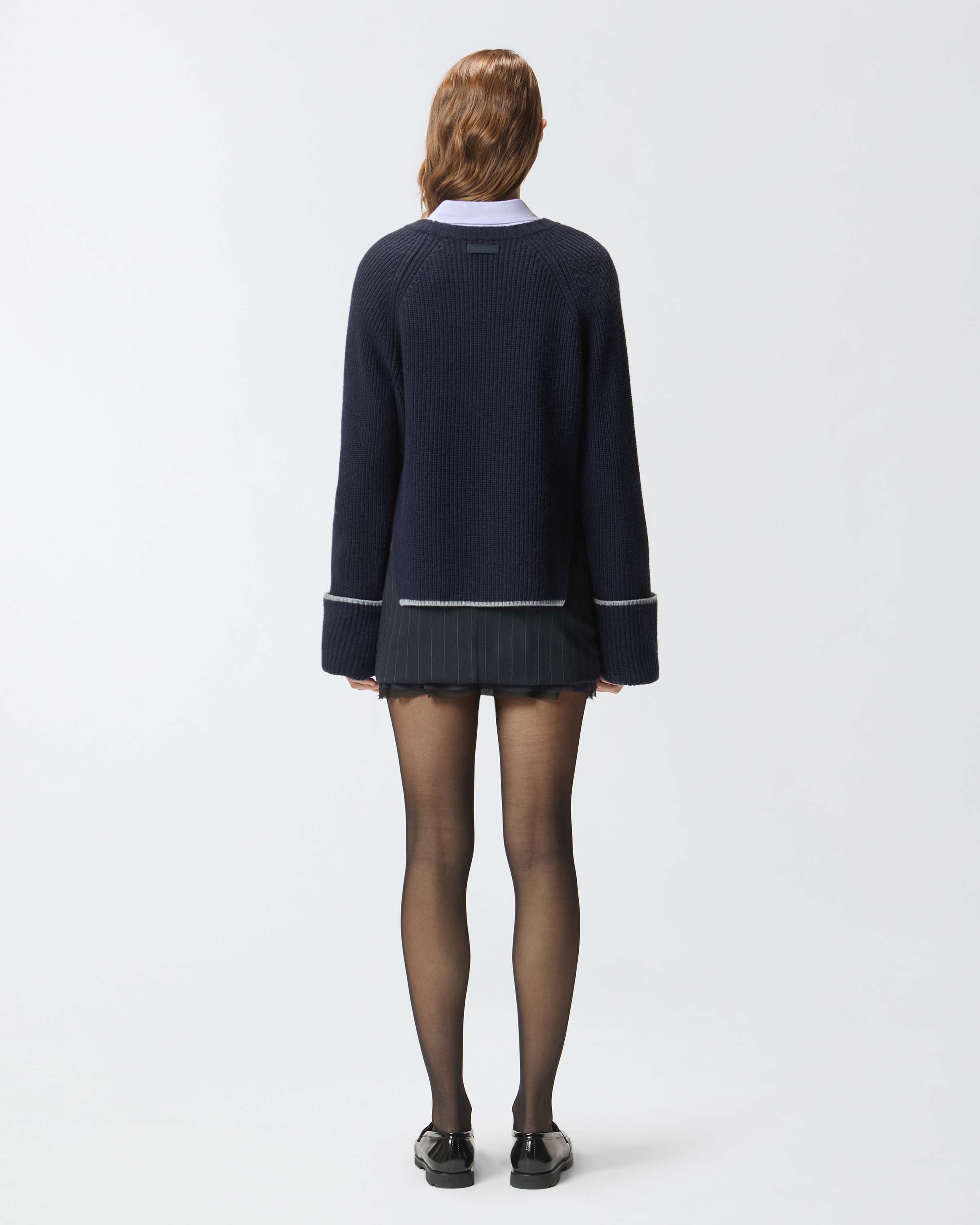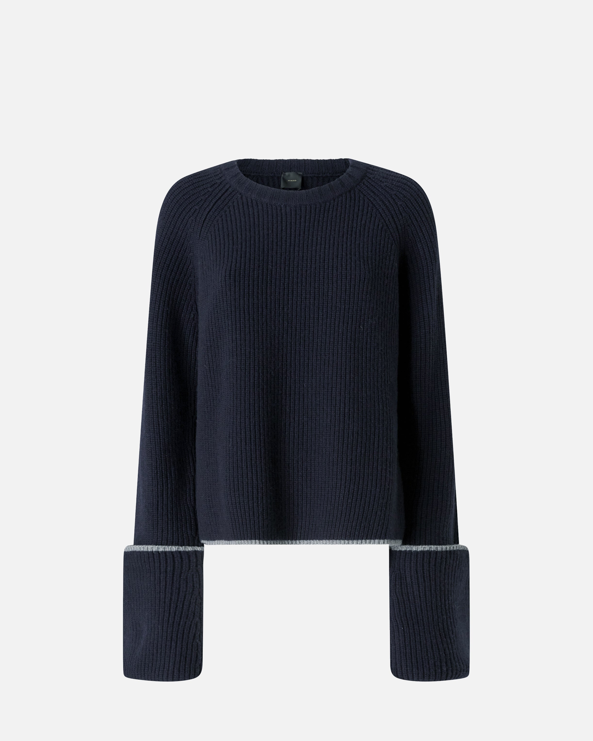 Maglione girocollo a maniche extralunghe in soffice misto lana merino e cashmere. Il filato a contrasto sull'orlo e sull'ampio risvolto dei polsini è un delicato tocco di classe. Il tutto è completato dall'etichetta tono su tono con logo lettering PINKO dietro al collo. Il capo è stato sottoposto a prove di finissaggio per ridurre al minimo la possibile formazione di pilling, garantendo una maggiore morbidezza e durabilità del tessuto. Questo maglione dal design essenziale diventerà un vero e proprio passe-partout per i tuoi outfit invernali.
