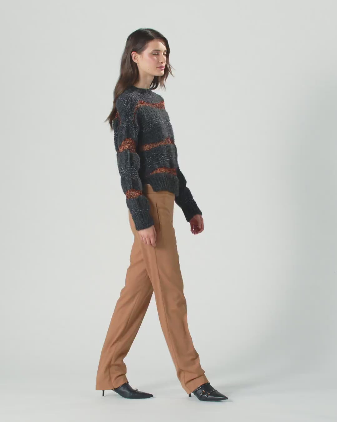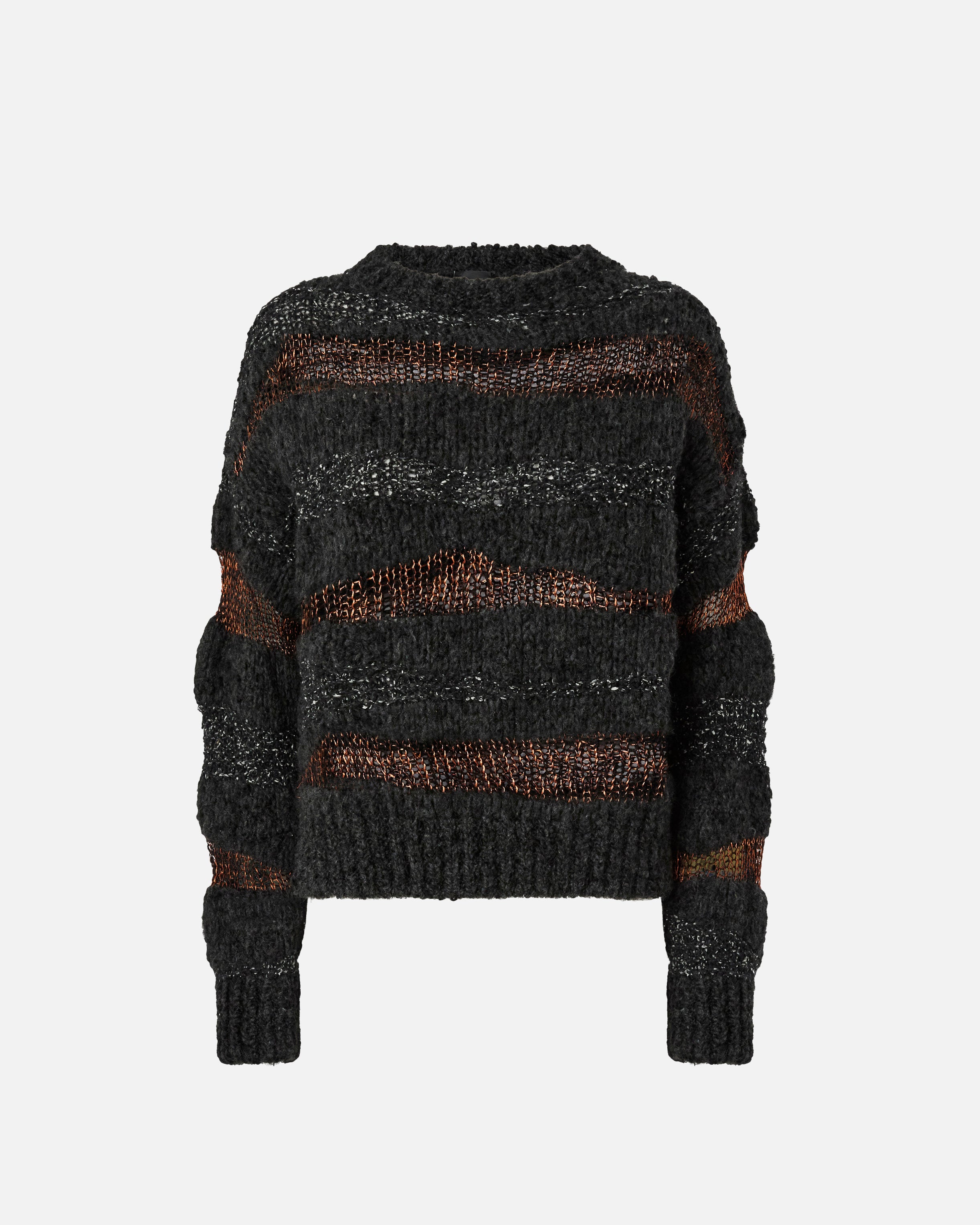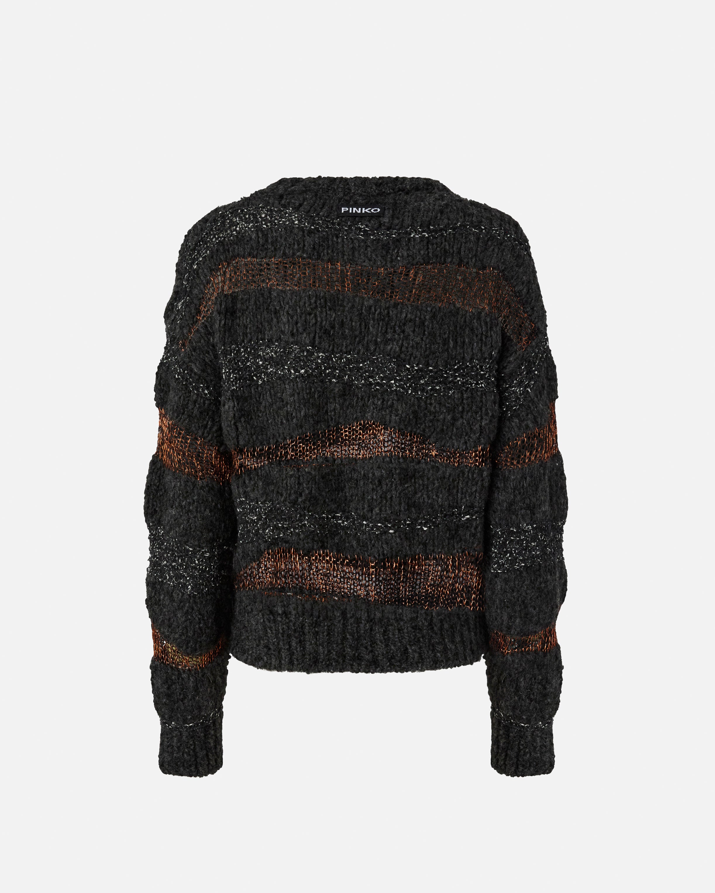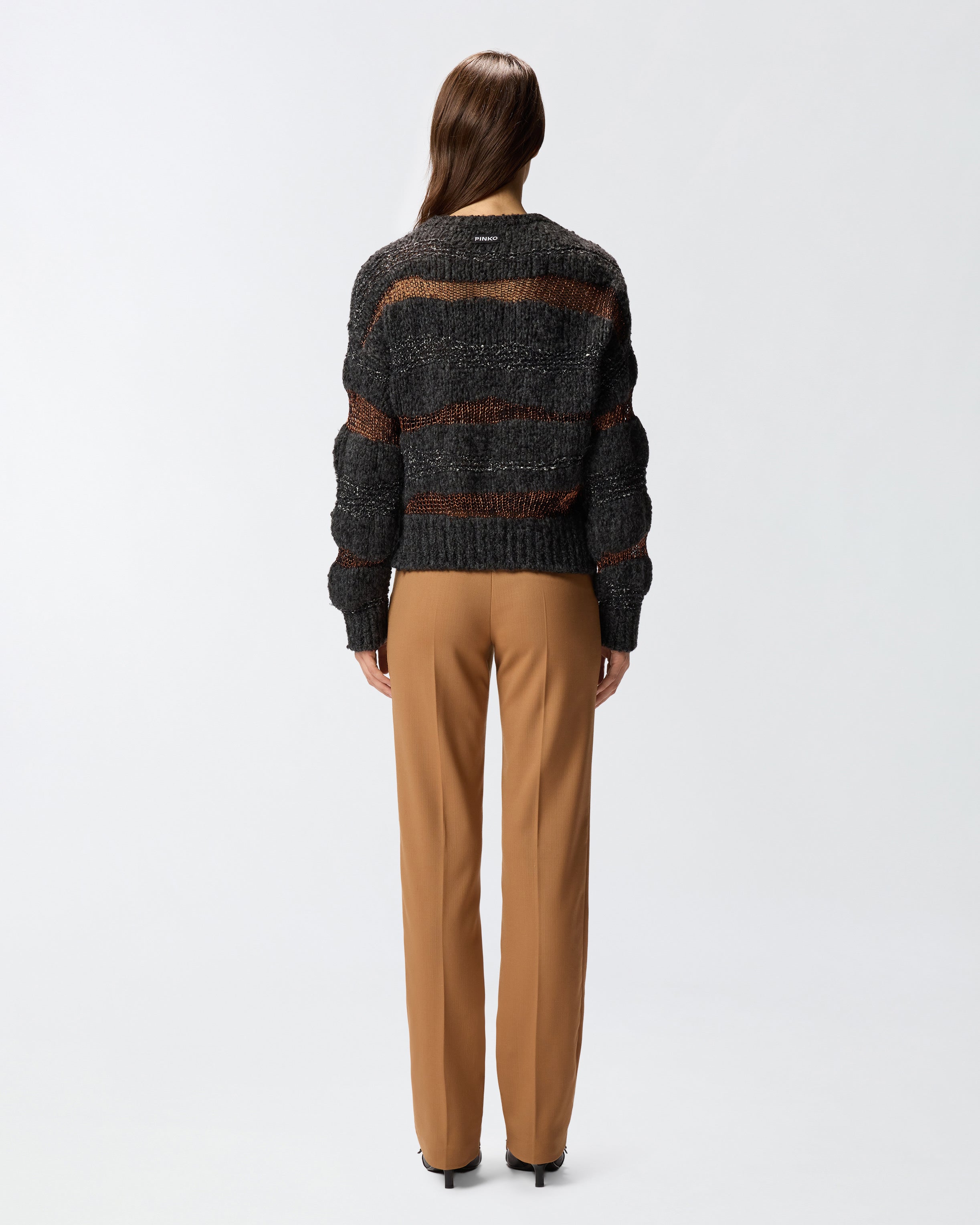 Maglione girocollo a maniche lunghe realizzato in morbido tessuto jacquard bottonato. Girocollo, orlo e polsini sono lavorati a coste, mentre il tocco finale è dato dall'etichetta tono su tono con logo lettering PINKO sul retro del design. Il capo è stato sottoposto a prove di finissaggio per ridurre al minimo la possibile formazione di pilling, garantendo una maggiore morbidezza e durabilità del tessuto. L'unicità del capo è data dal mix di punti e filati e dal motivo a strisce orizzontali con filo metallico. Non rinunciare allo stile neanche nelle giornate più fredde.