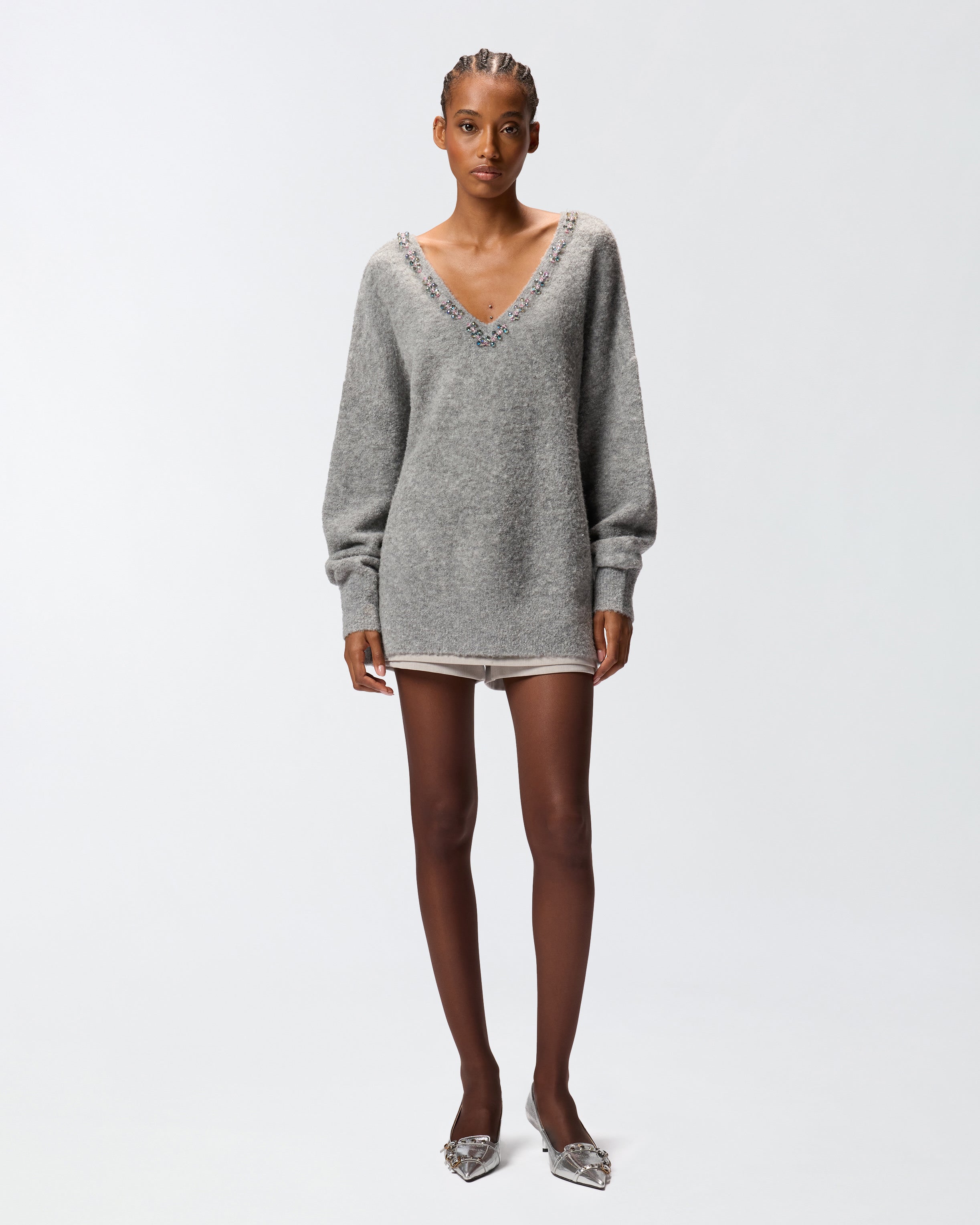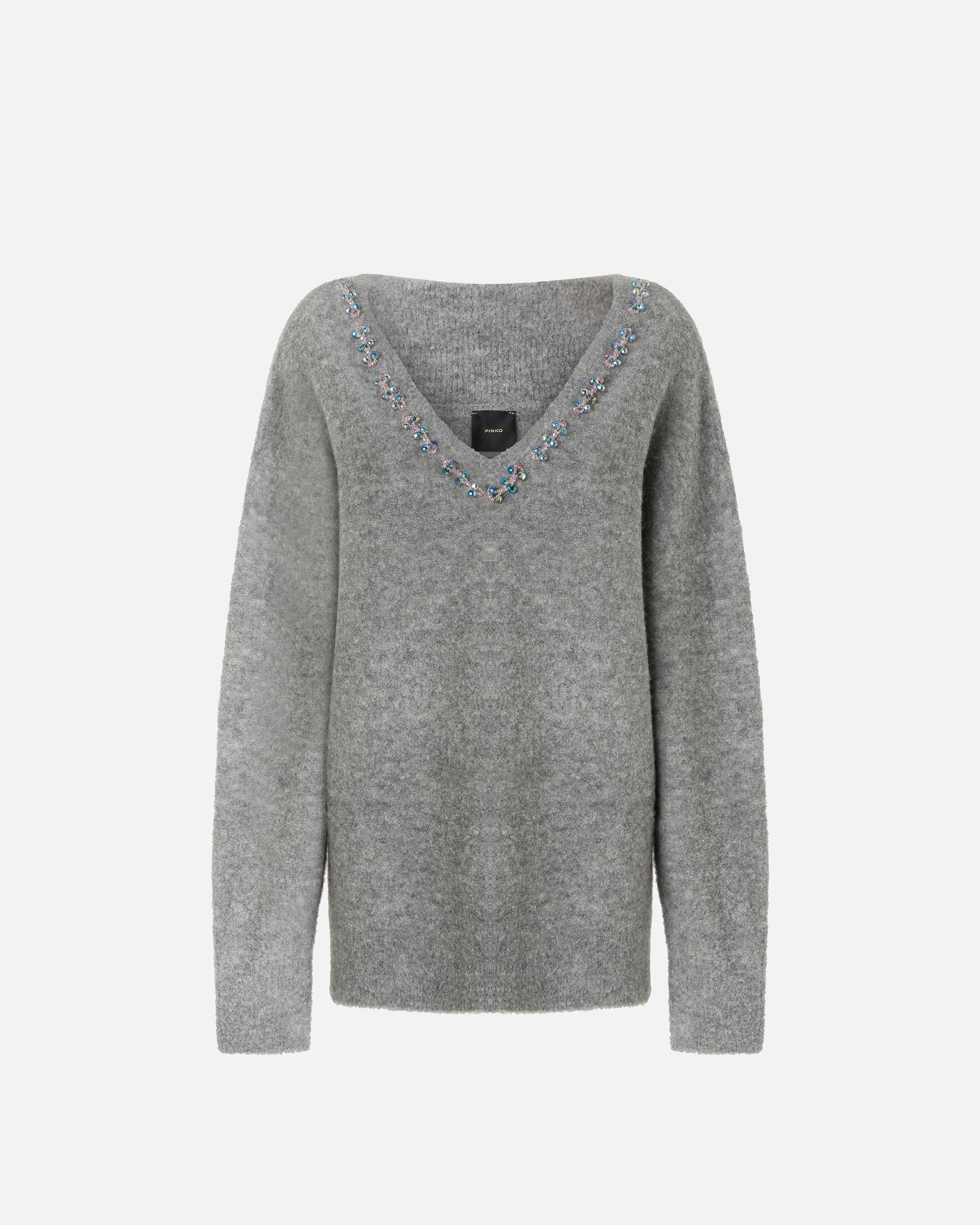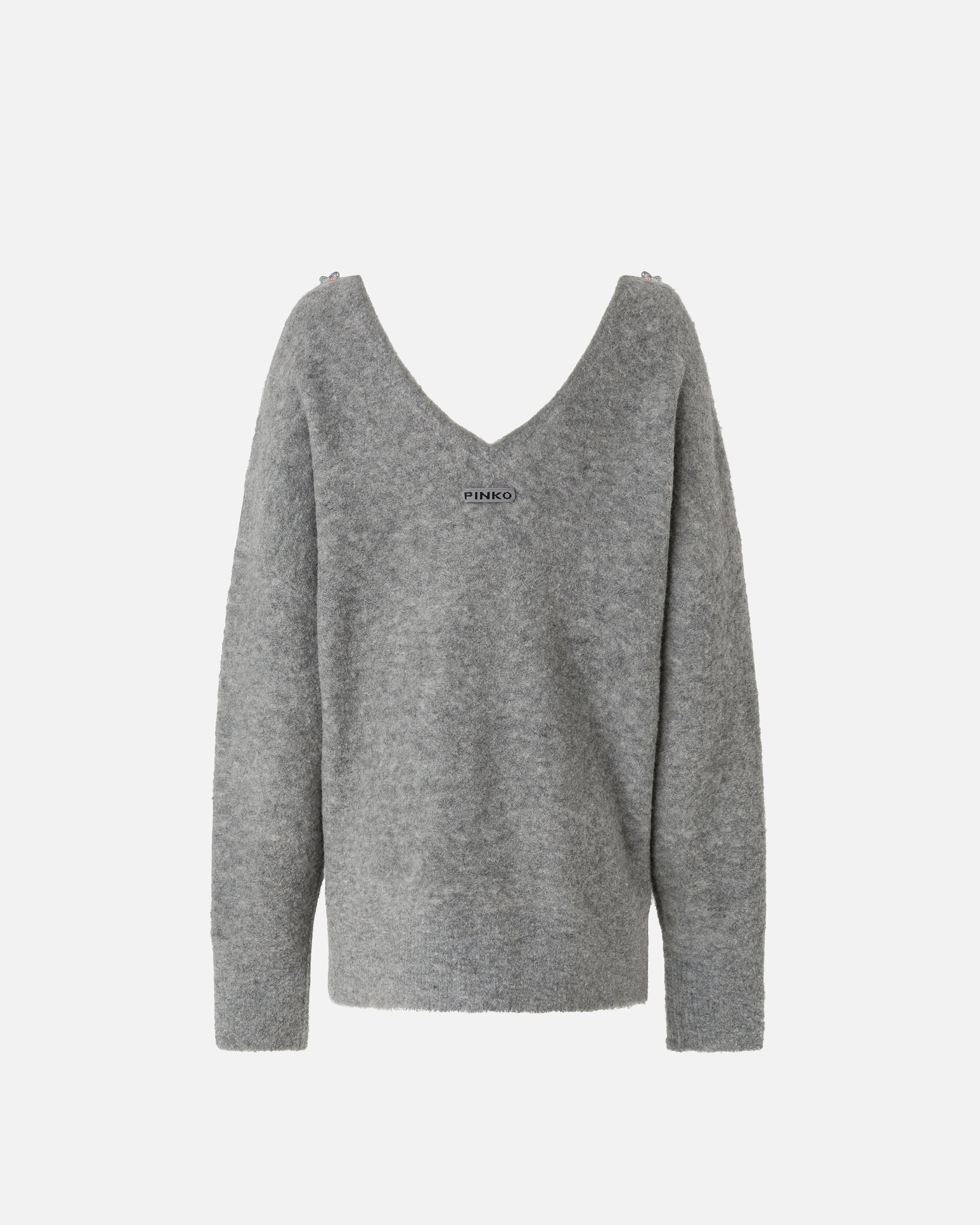Maglione confortevole a maniche lunghe con scollo a V, realizzato in morbida maglia di misto lana effetto bouclé. Il logo lettering PINKO tono su tono spicca sul retro, mentre lo scollo ampio è delineato da colorate perline gioiello per illuminare il look e impreziosire il tessuto. Il capo è stato sottoposto a prove di finissaggio per ridurre al minimo la possibile formazione di pilling, garantendo una maggiore morbidezza e durabilità del tessuto.