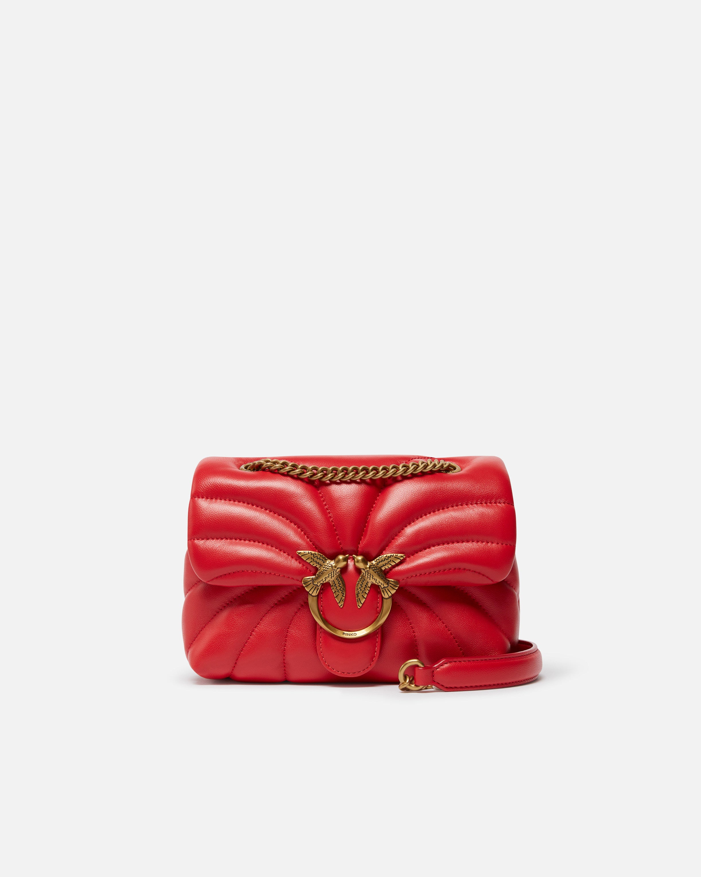 Borsa piccola morbida a tracolla Mini Love Bag Puff in nappa con trapuntatura Butterfly, che ricorda la caratteristica sagoma delle ali di farfalla. La tracolla a catena in metallo con spallaccio in nappa è scorrevole, e può essere doppiata per indossare la borsetta a spalla. La chiusura con patta è completata dall'iconica fibbia in metallo Love Birds Diamond Cut, galvanica antique gold. L'interno è foderato in microfibra scamosciata e comprende una pratica tramezza chiusa con zip e una tasca interna, per una migliore gestione dello spazio. Attiva la tua borsa PINKO: verifica l'autenticità del tuo prodotto e accedi all'esperienza personalizzata avvicinando il tuo smartphone al ricamo Love Birds che trovi sul retro della borsa!