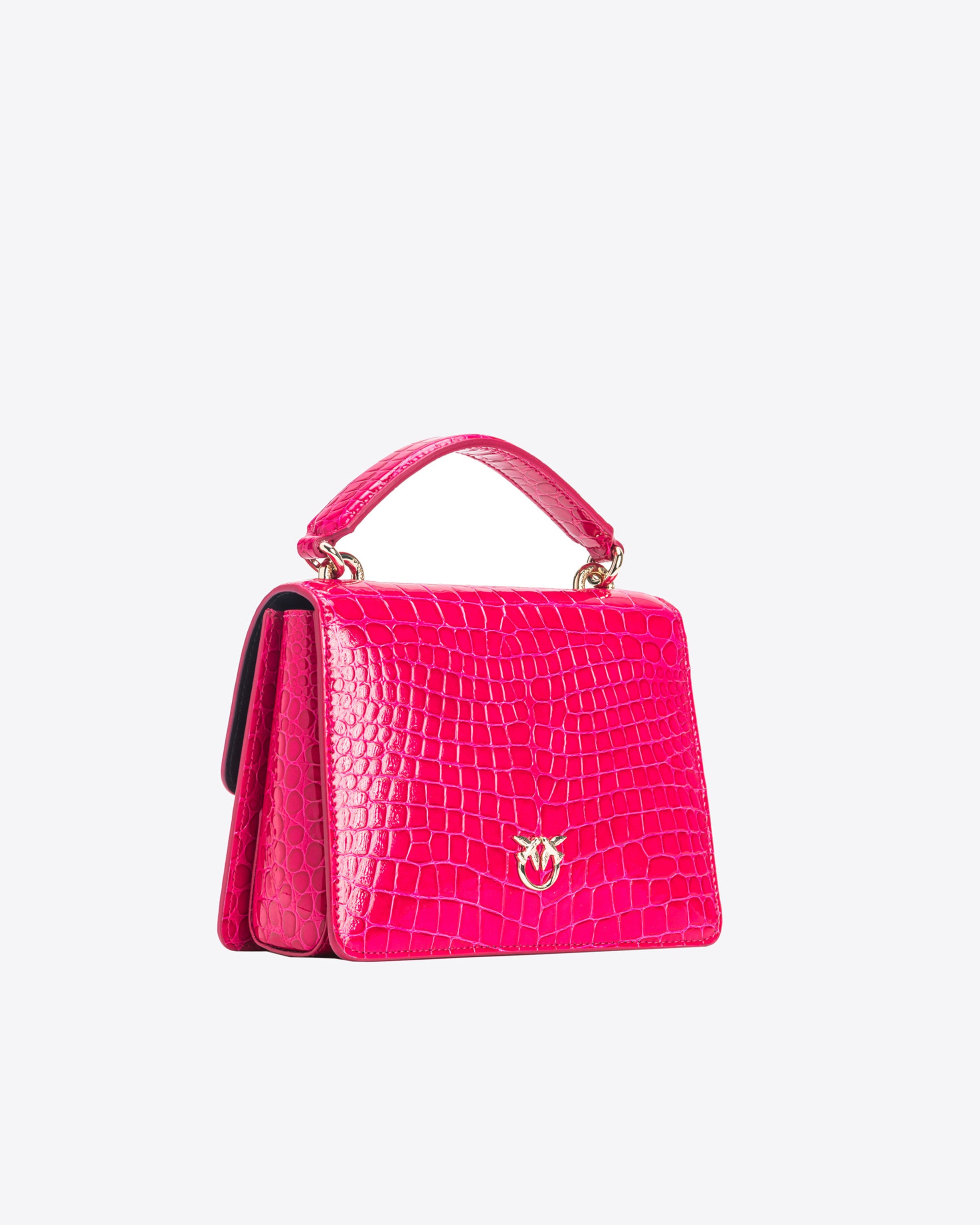 Mini Love Bag One Top Handle Light, dal design decostruito e leggero, in pelle stampa coccodrillo colorato dall'effetto particolarmente lucido. La chiusura è completata dall'iconica fibbia in metallo Love Birds Diamond Cut, galvanica light gold, impreziosita con pavé di pietre in tono colore. L'interno è foderato in tessuto e comprende tasca a parete con zip. Manico singolo top handle e tracolla a catena con spallaccio regolabile in pelle, rimovibile con piccoli moschettoni. La borsa fa parte della speciale capsule collection Limited Edition realizzata in tiratura limitata esclusivamente per PINKO Galleria. Utilizza lo speciale chip NFC per vivere una speciale experience dedicata alla borsa che hai acquistato!