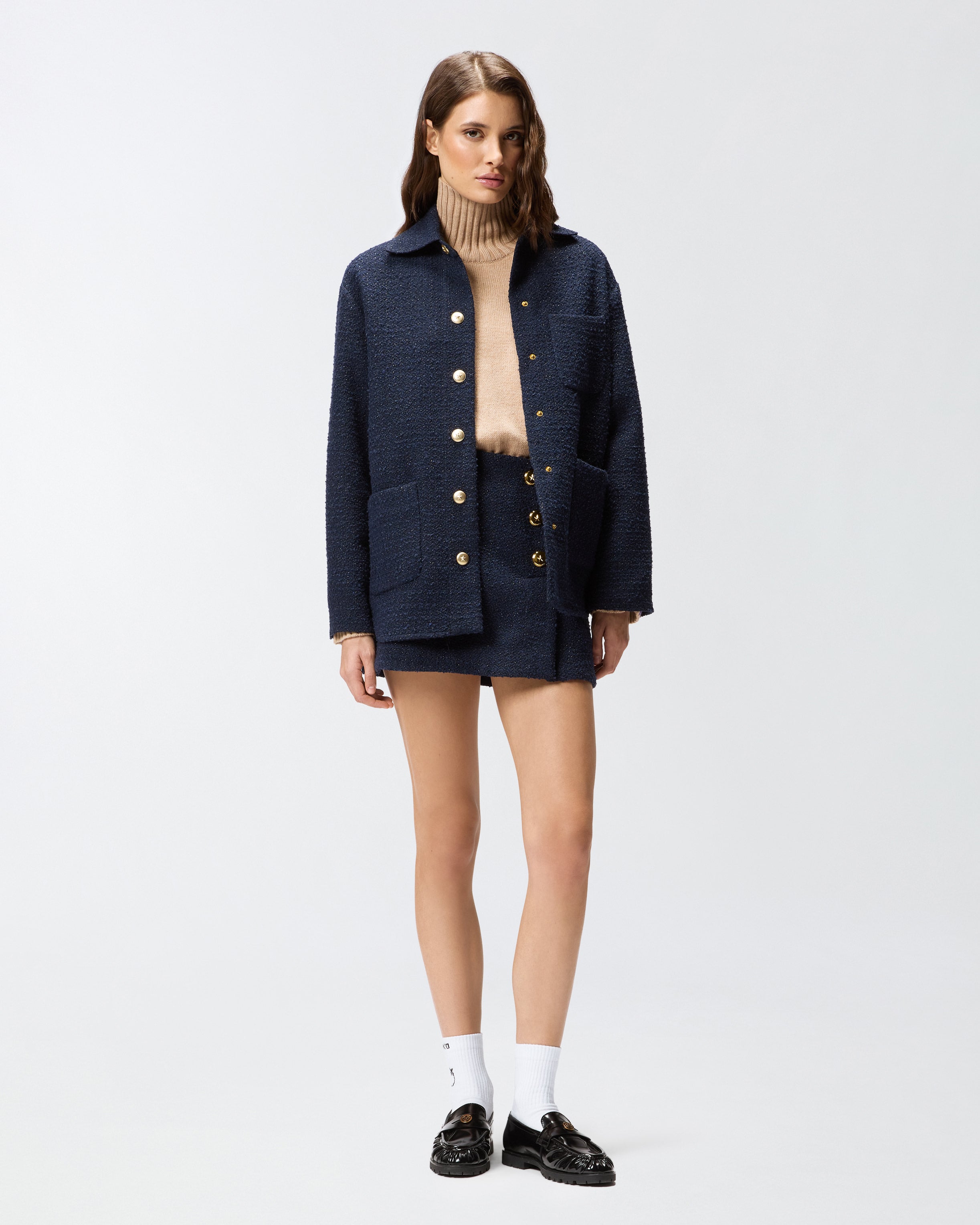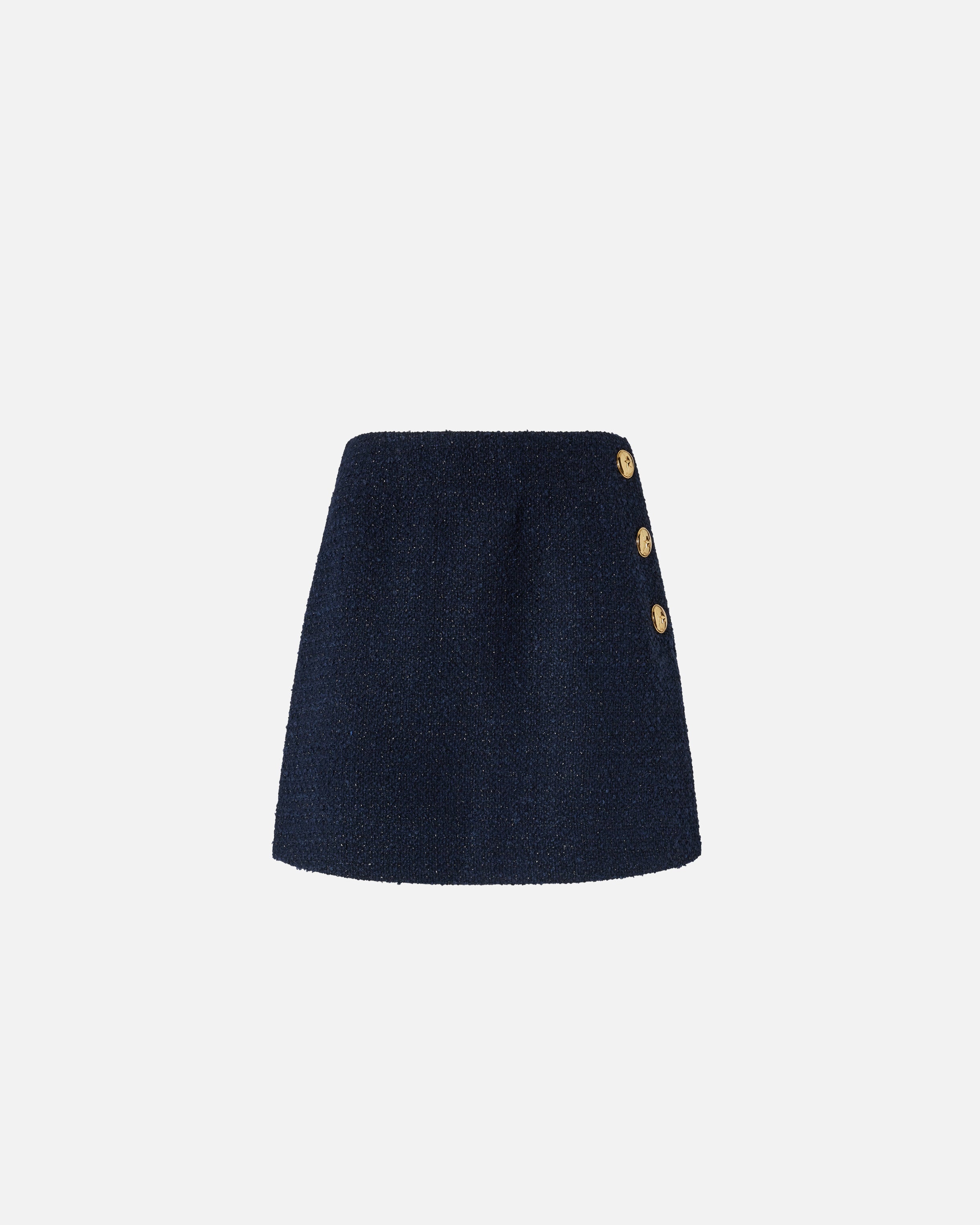 Minigonna con linea a trapezio realizzata in tessuto bouclé di misto cotone e lana. Il capo presenta un orlo dritto, pinces sul retro per migliorare la vestibilità e una chiusura a portafoglio impreziosita da tre bottoni in metallo decorati da stella. Perfetta abbinata alla giacca trucker nello stesso materiale o con un top aderente.
