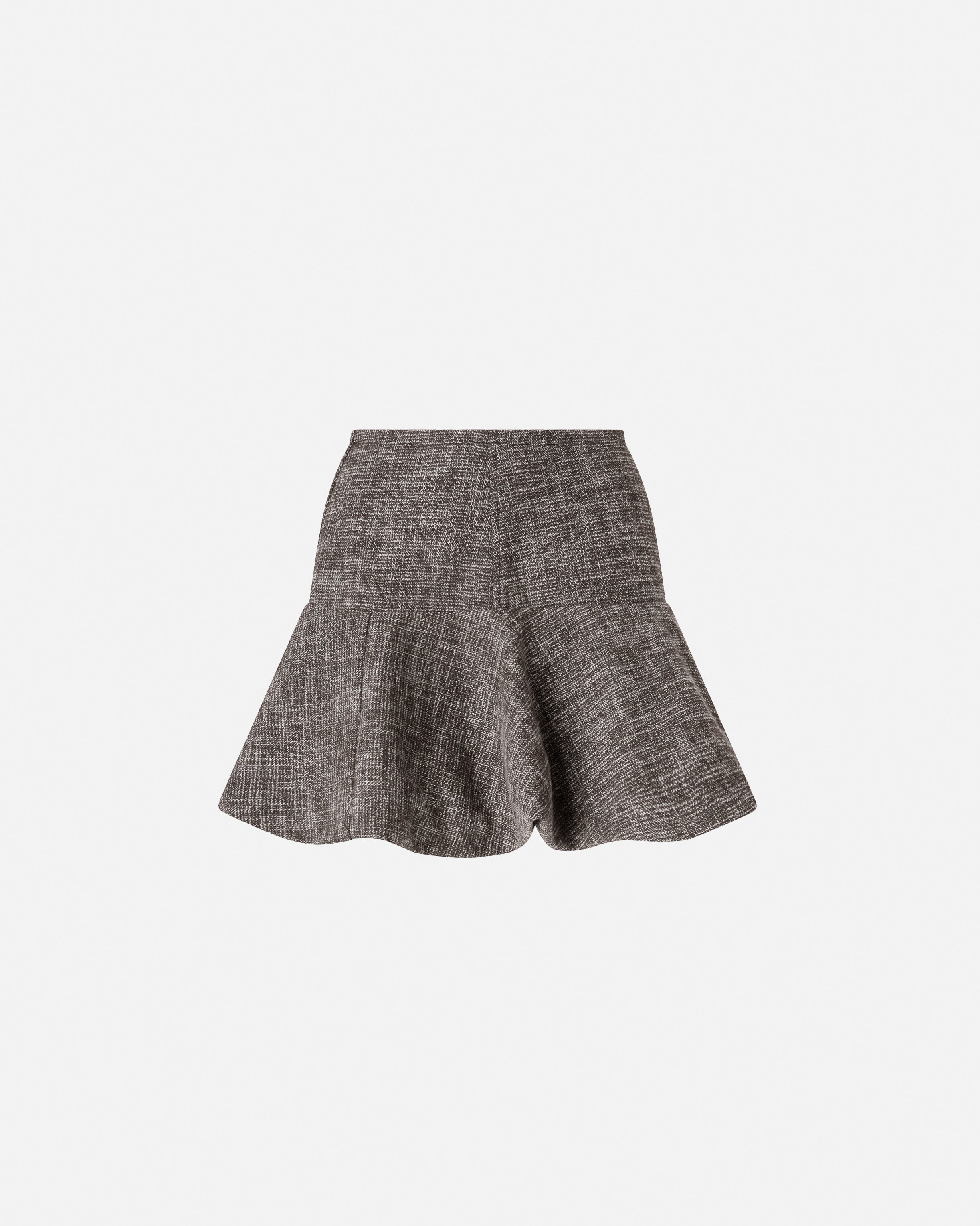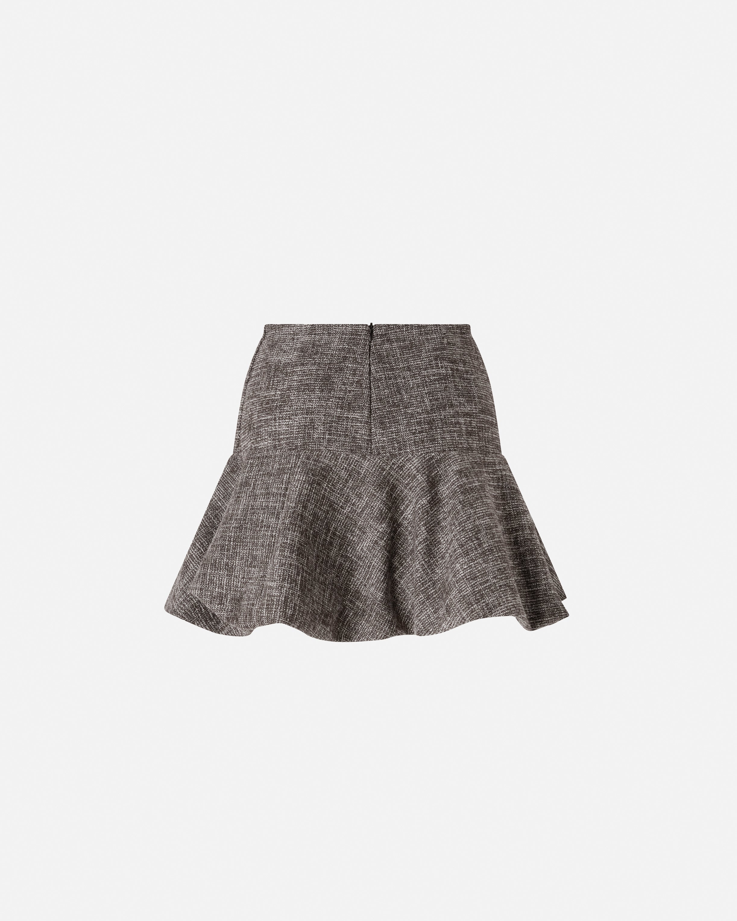 Gonna corta dalla linea leggermente svasata con balza al fondo. Il capo è realizzato in flanella dalla mano piacevole e calda, caratterizzata da un disegno tweed d'ispirazione classica e accoppiata a un interno in jersey per assicurare ulteriore comfort. Chiusura con zip invisibile sul retro. Perfetta in abbinamento alla giacca coordinata per un look femminile.