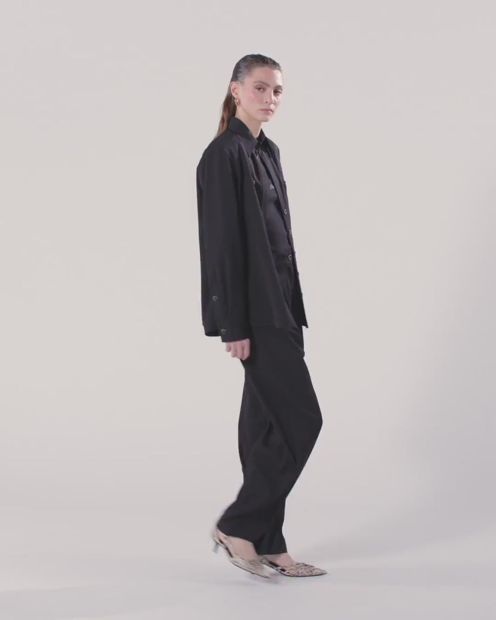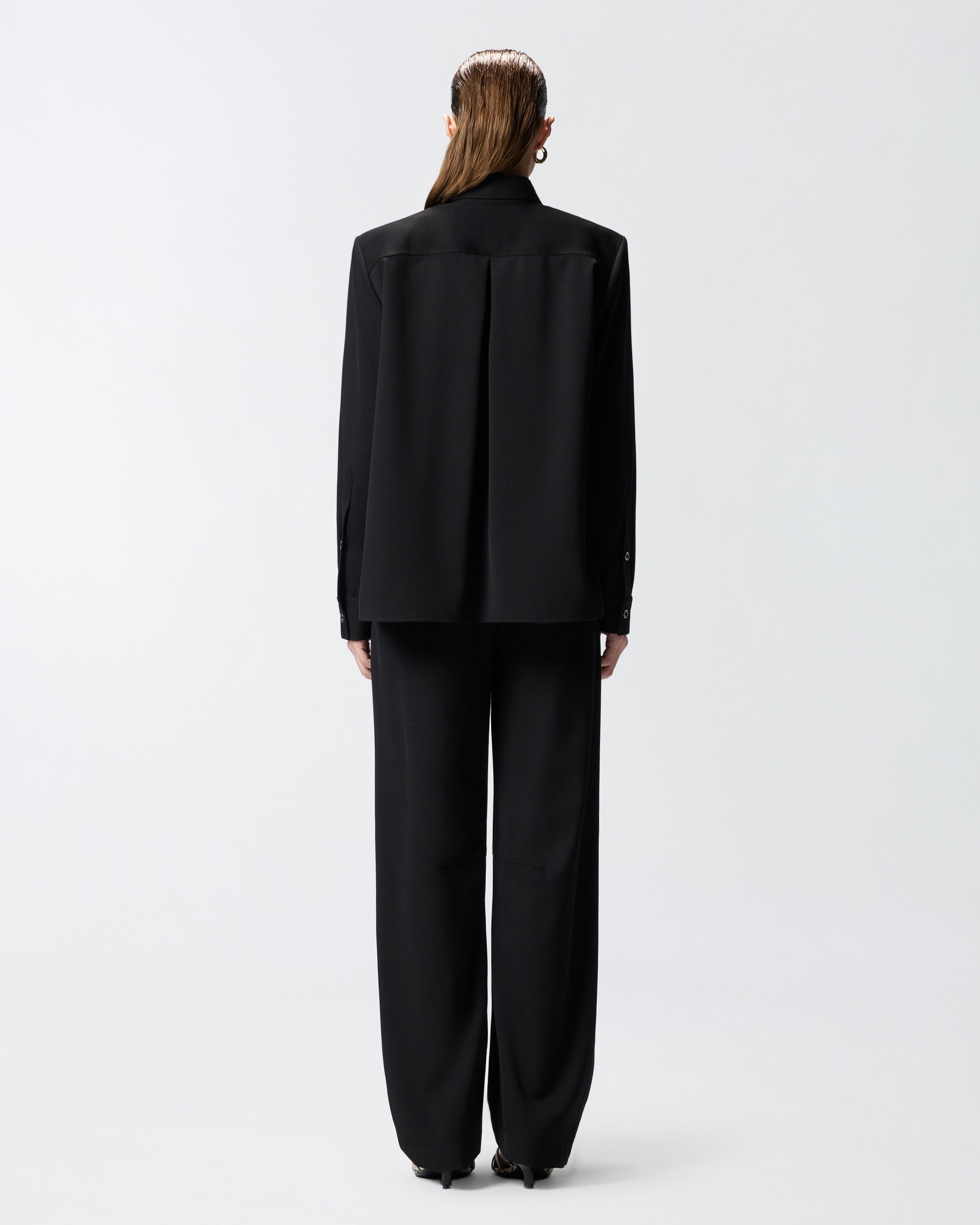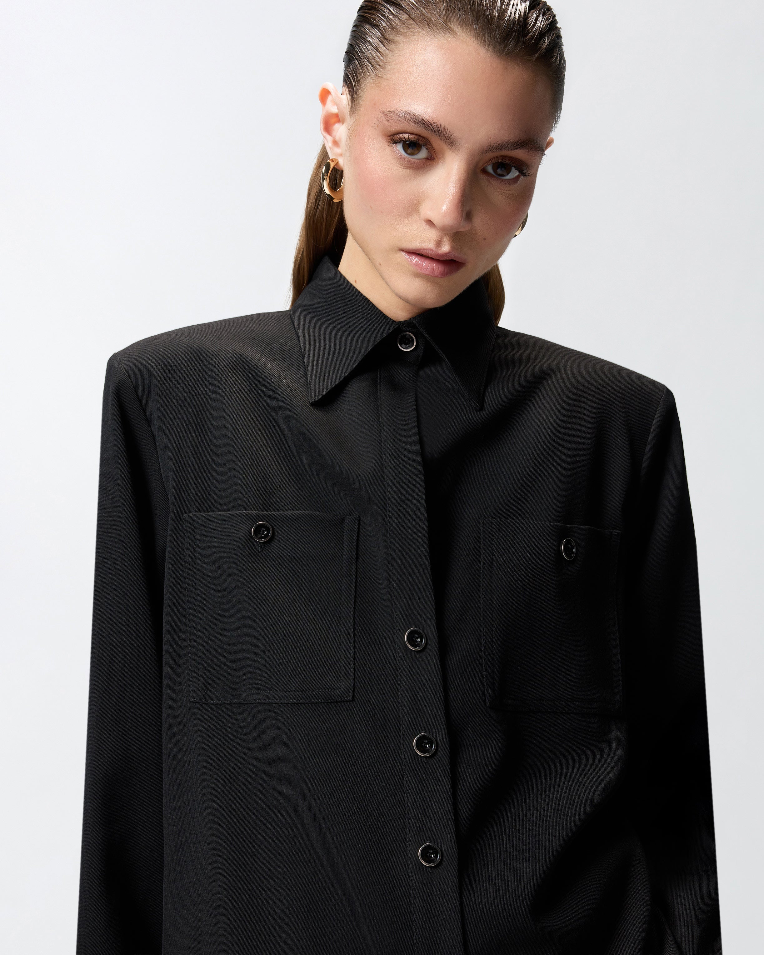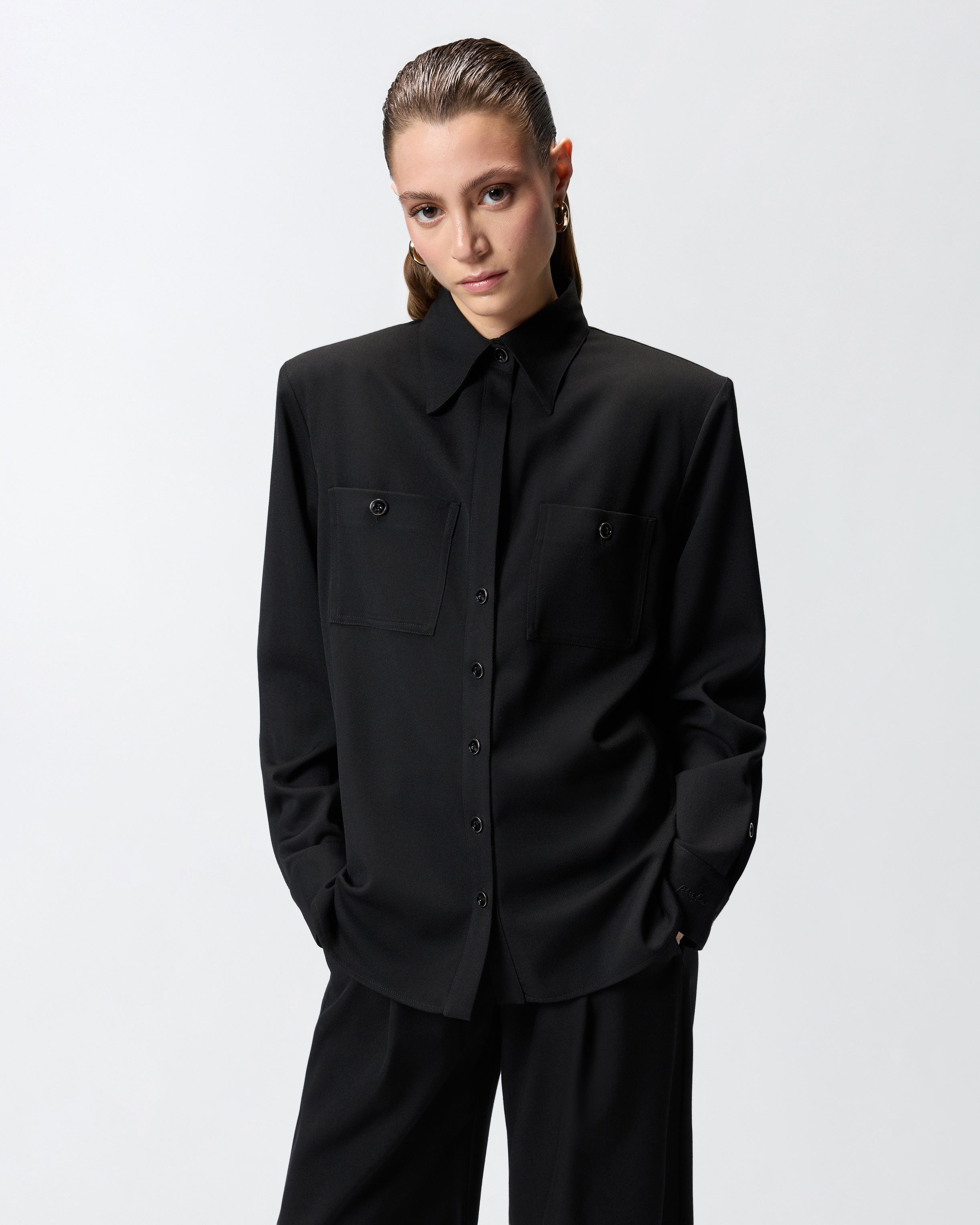 Overshirt realizzata in misto viscosa stretch con armatura diagonale, un tessuto dalla mano calda e fluida. Il capo, con abbottonatura frontale, è caratterizzato da due tasche con bottone sul petto, un colletto a punta, polsini con doppio bottone e carré con sfondo piega sul retro. Ideale per creare look a strati primaverili, questo modello essenziale e contemporaneo diventerà un passe-partout del tuo guardaroba.