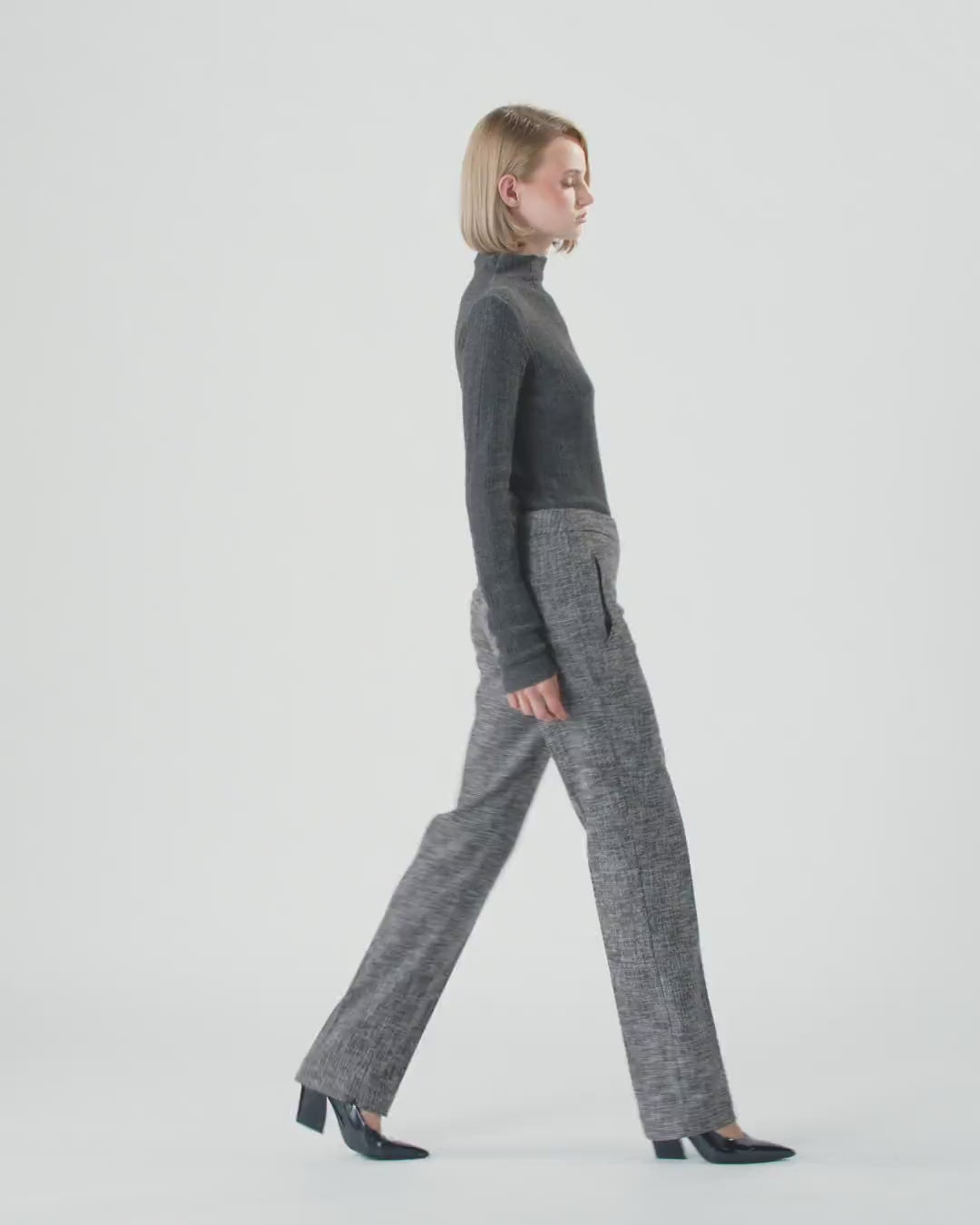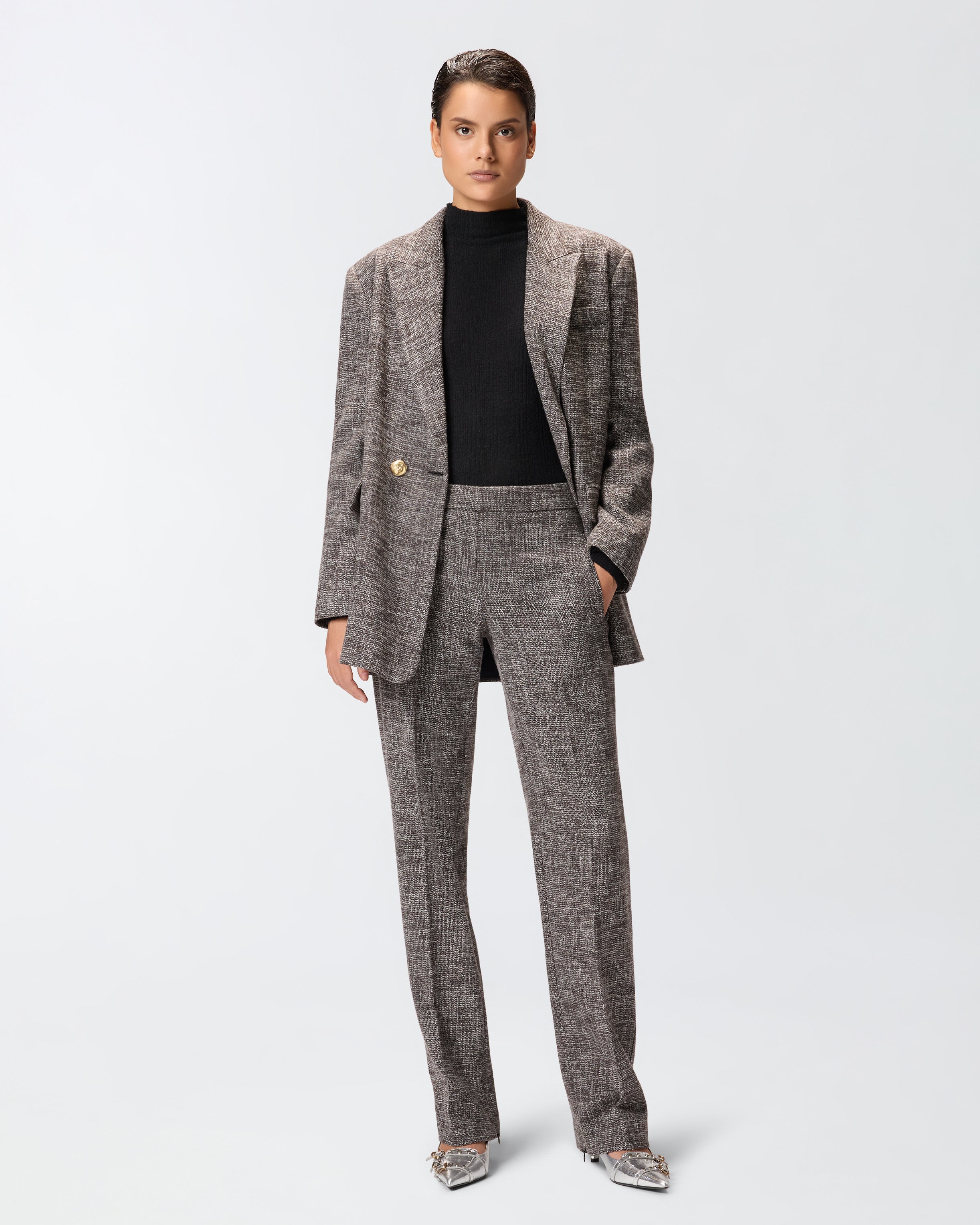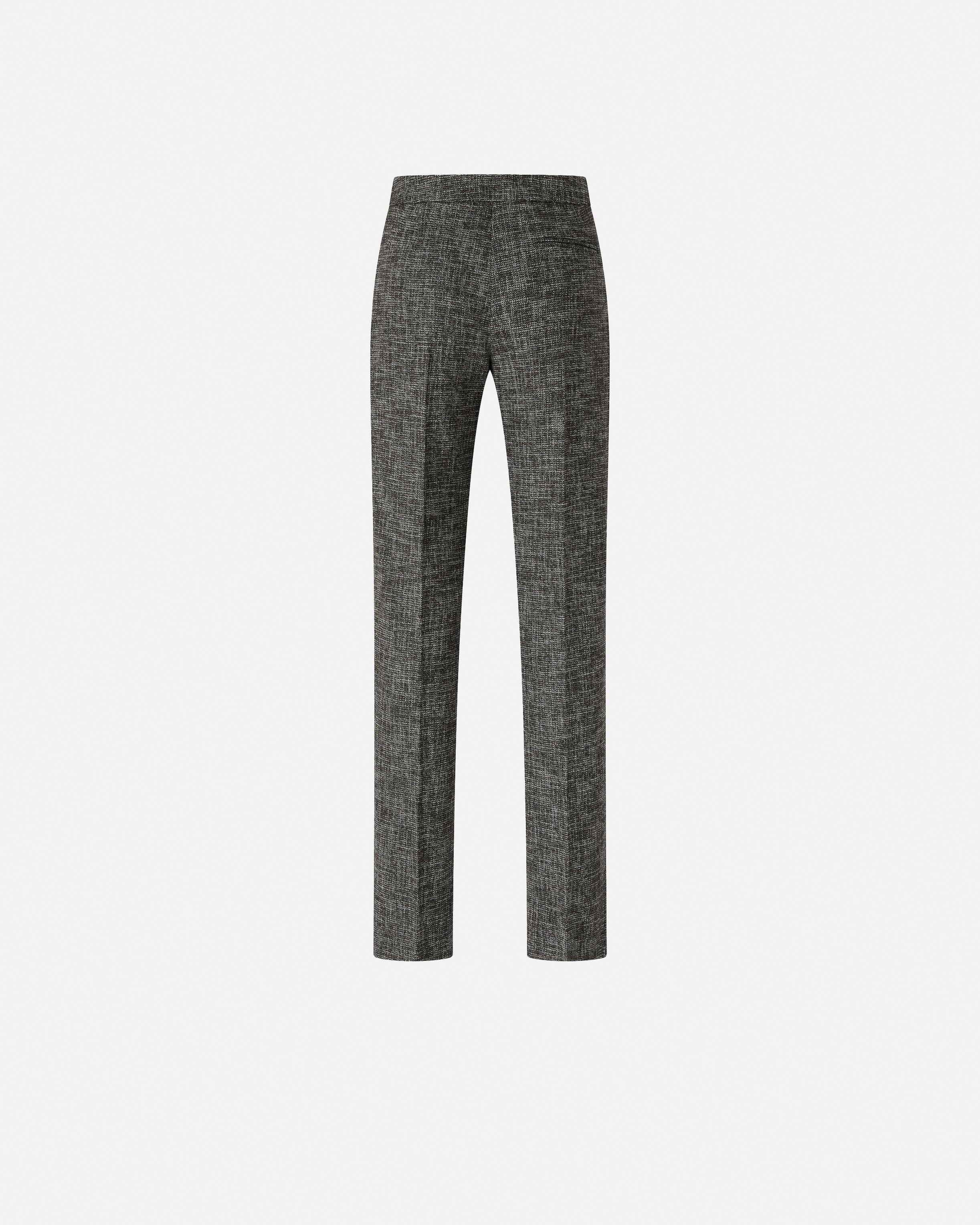 Pantaloni skinny con vita alta e taschino posteriore a filetto. Il capo è realizzato in flanella dalla mano piacevole e calda, caratterizzata da un disegno tweed d'ispirazione classica. Le gambe sono rifinite da una raffinata piega stirata d'ispirazione sartoriale fronte e retro, e sono dotate di una zip invisibile sul lato interno per permetterti di regolare l'indosso. Abbina i pantaloni con il blazer nello stesso tessuto per un effetto tailleur, oppure indossa una camicia per un look formale, ma non troppo.