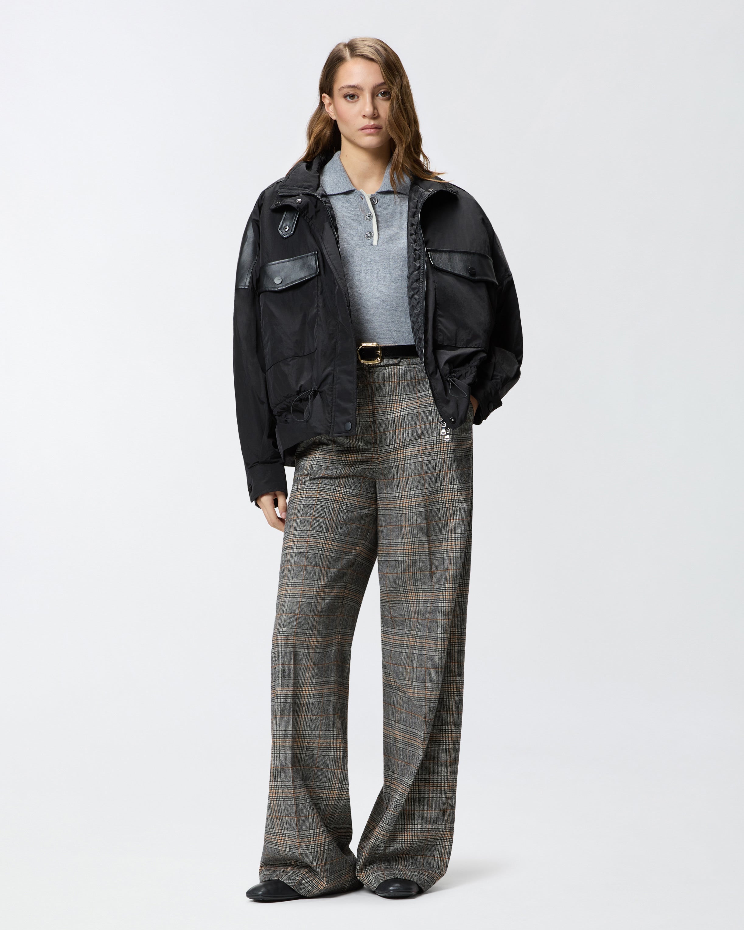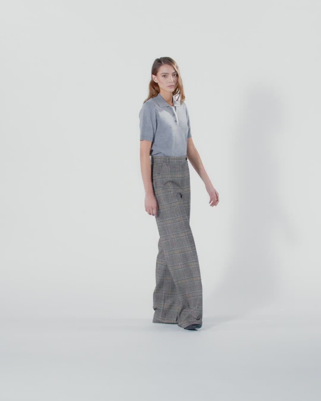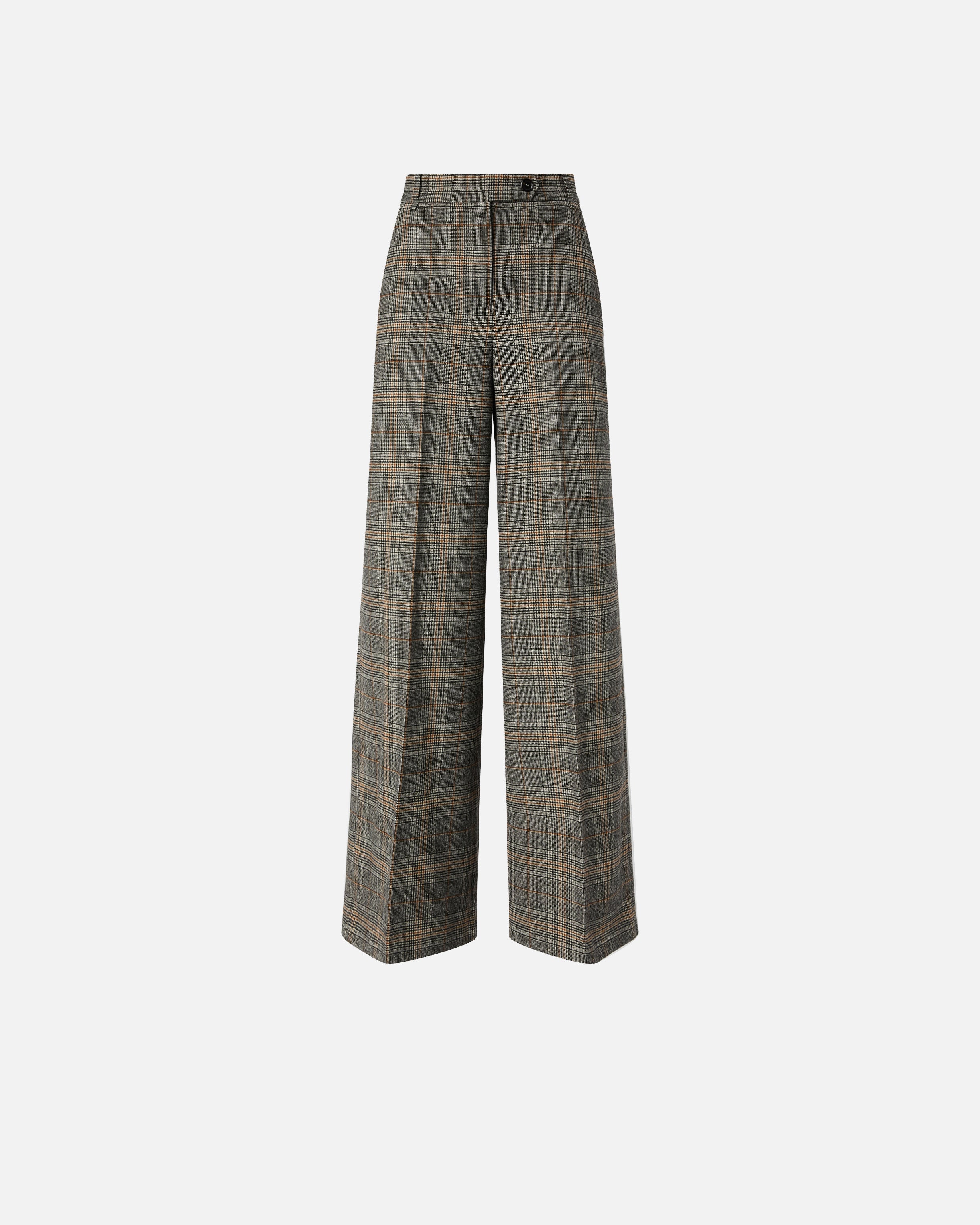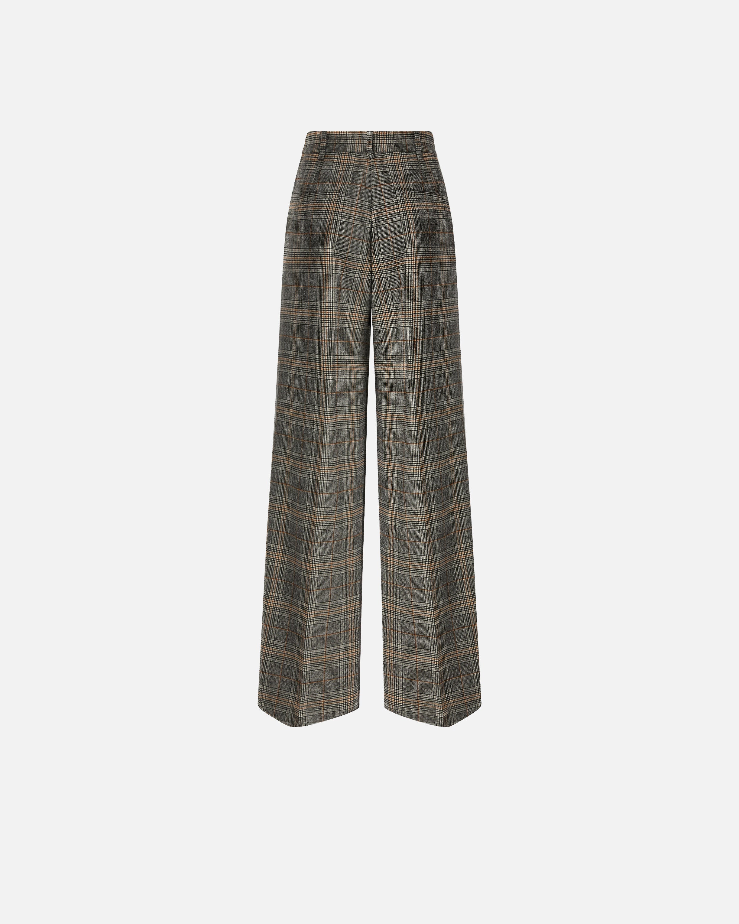 Pantaloni lunghi d'ispirazione sartoriale realizzati in misto lana tinto in filo con motivo a quadri all over d'ispirazione principe di Galles. Il capo, caratterizzato da una silhouette ampia a palazzo e dalla piega stirata centrale lungo la gamba, è completato dalla chiusura frontale con zip e bottone decentrato. Indossa questo modello con la giacca coordinata per creare un total look ideale per le occasioni formali, oppure abbinalo a capi più casual per un outfit quotidiano che non rinuncia allo stile.