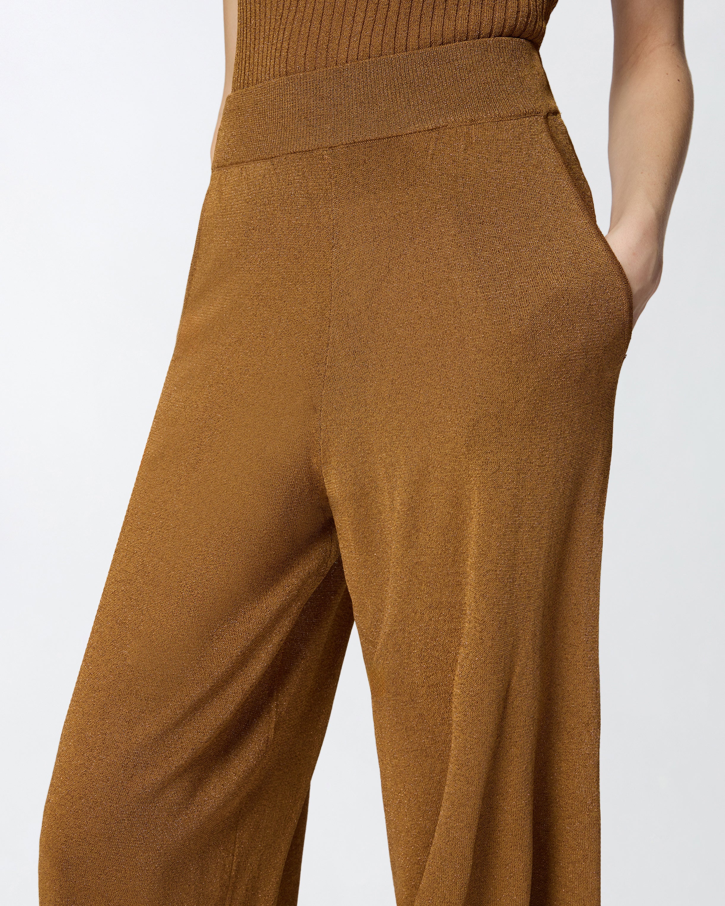 Pantaloni dal design ampio e morbido in maglia di misto viscosa, leggera e trasparente, attraversata da un sottile filo metallizzato per un raffinato effetto luminoso. Il capo, dotato di comode tasche, presenta vita e fondo gamba elasticizzati lavorati a costine ed è completato da un'etichetta con logo lettering PINKO in jacquard sul retro. La scelta ideale per un look confortevole che non scende a compromessi in termini di eleganza.