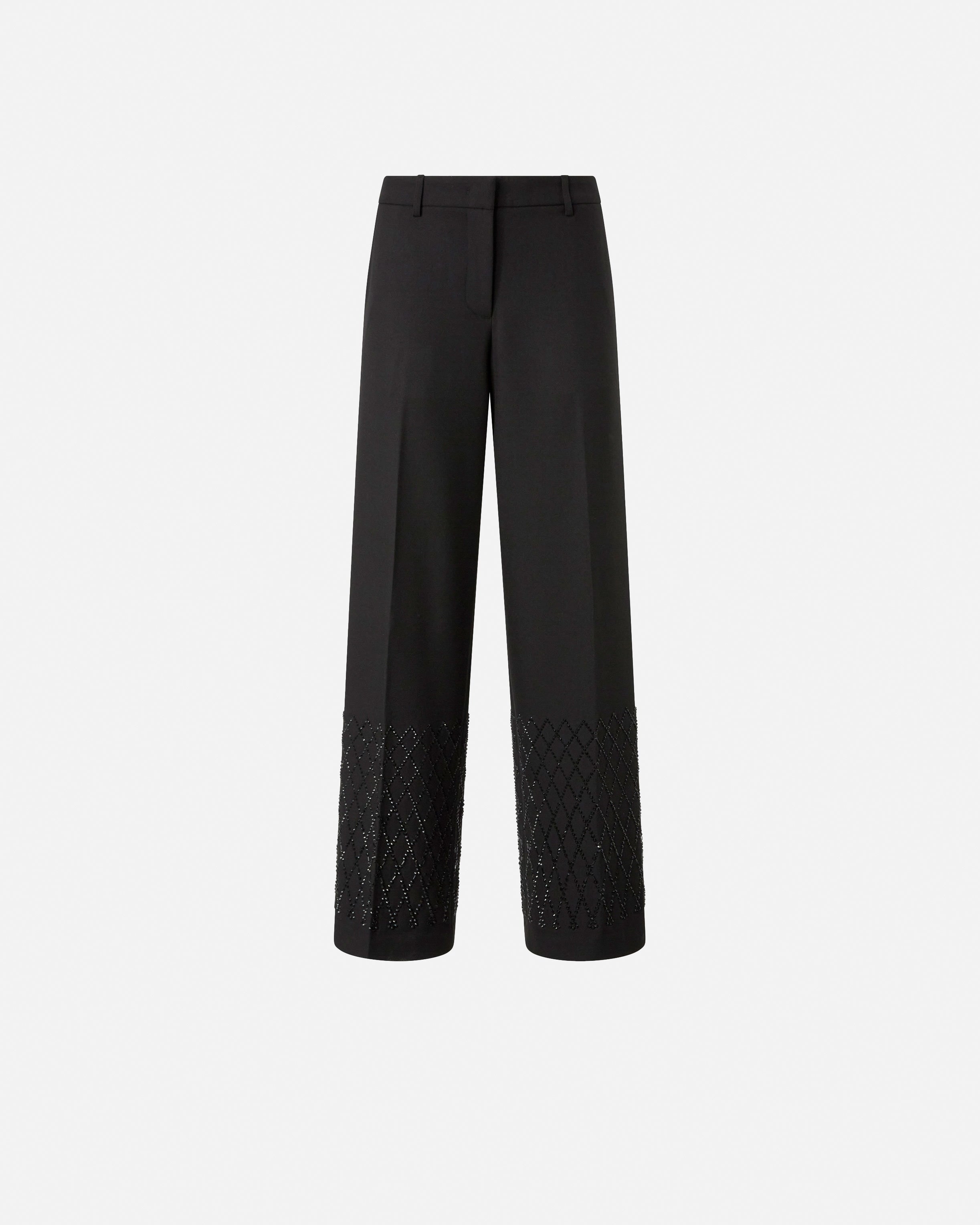 Pantaloni lunghi dalla vestibilità ampia con spacco sul fondo e tasche a filetto sul retro. Il modello presenta un'applicazione di strass di diverse misure e forme che crea un sofisticato disegno geometrico sul fondo. La lavorazione dona al capo un effetto luminoso e prezioso che eleva l'essenzialità della silhouette. Opta per un total look scintillante e raffinato con la giacca abbinata per le occasioni più speciali.
