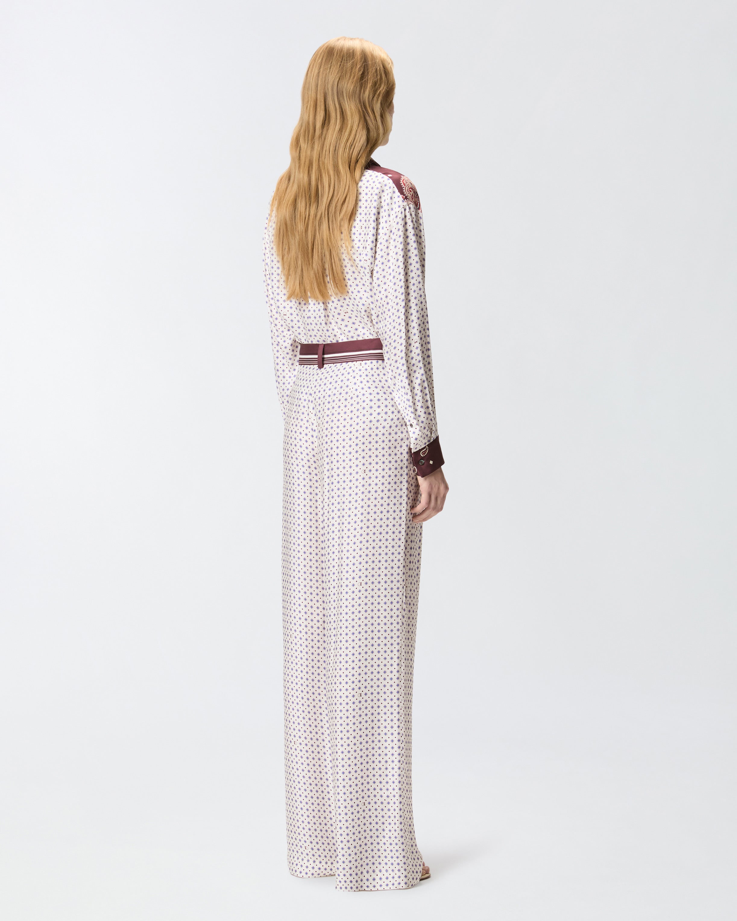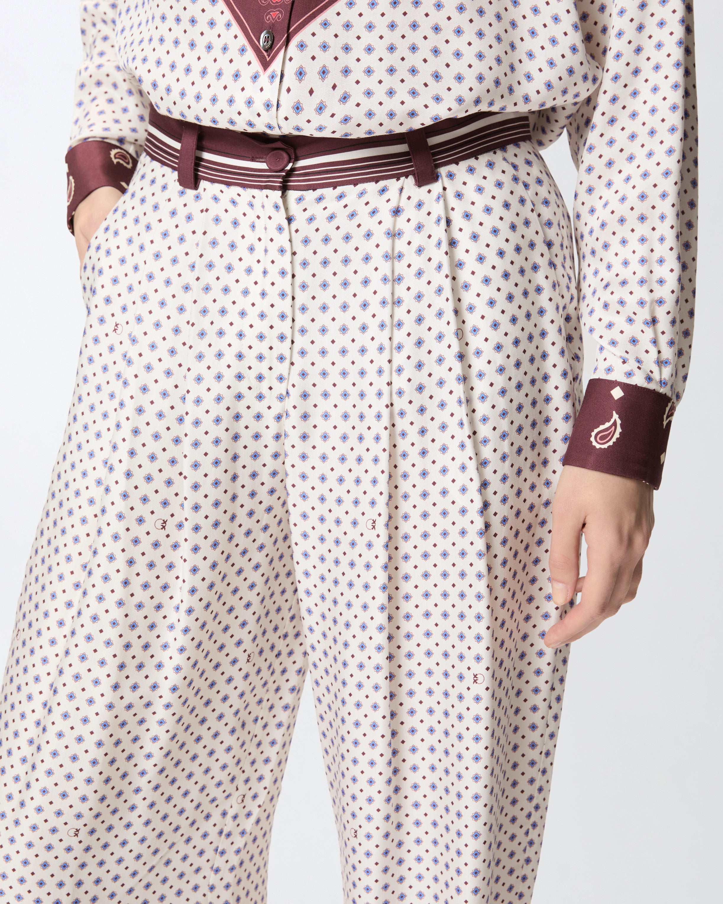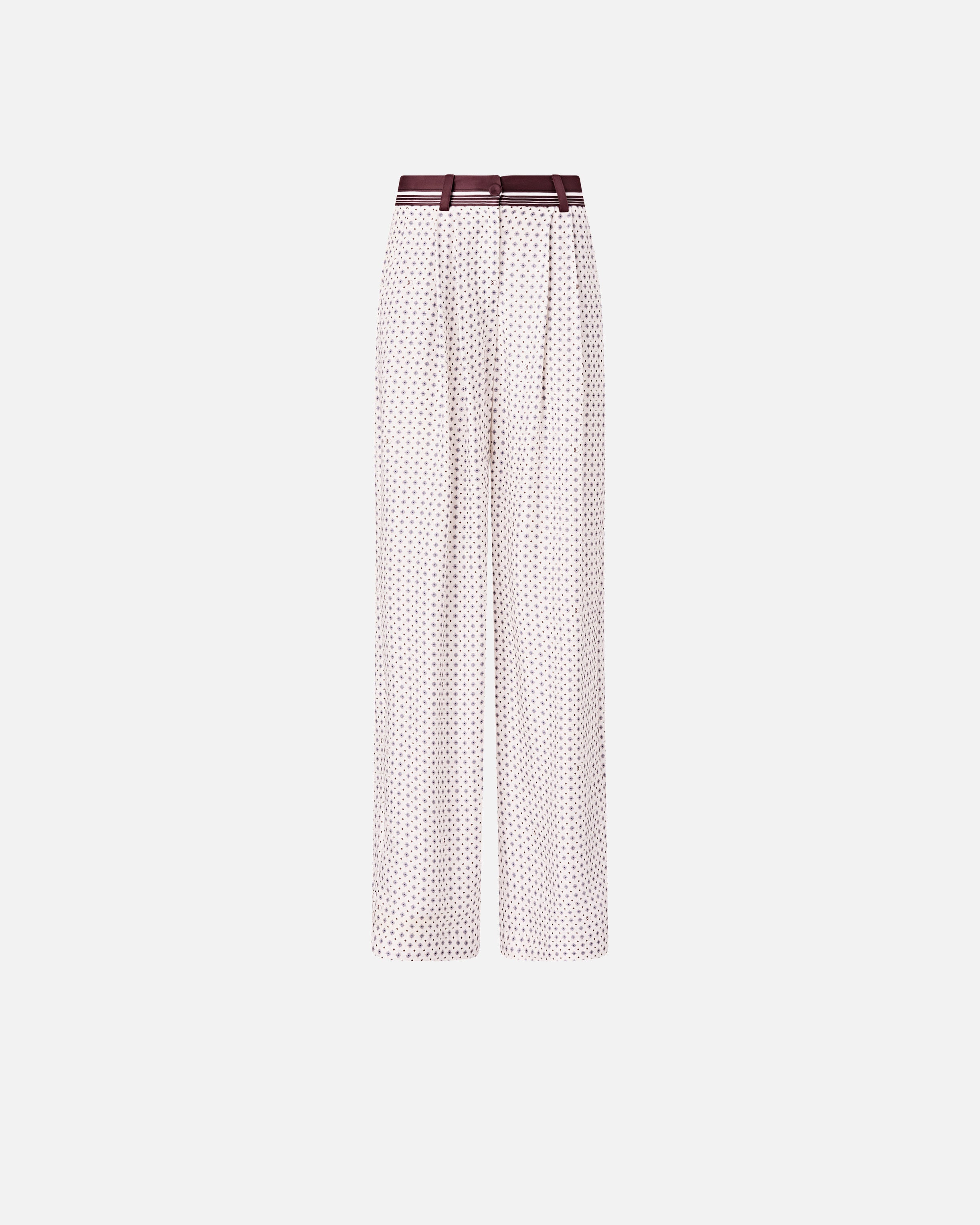 Pantaloni a gamba dritta realizzati in twill di viscosa e caratterizzati da una stampa d'ispirazione foulard con motivo cravatteria all over. Il modello, dotato di chiusura con zip e bottone, presenta inoltre tasche laterali, una vita con motivo rigato a contrasto, passanti per cintura e raffinate pinces sul davanti. Trasforma il tuo outfit in un'opera d'arte e indossa questi pantaloni con la camicia abbinata per un total look originale che non ti farà passare inosservata. - RUTH PANTALONE