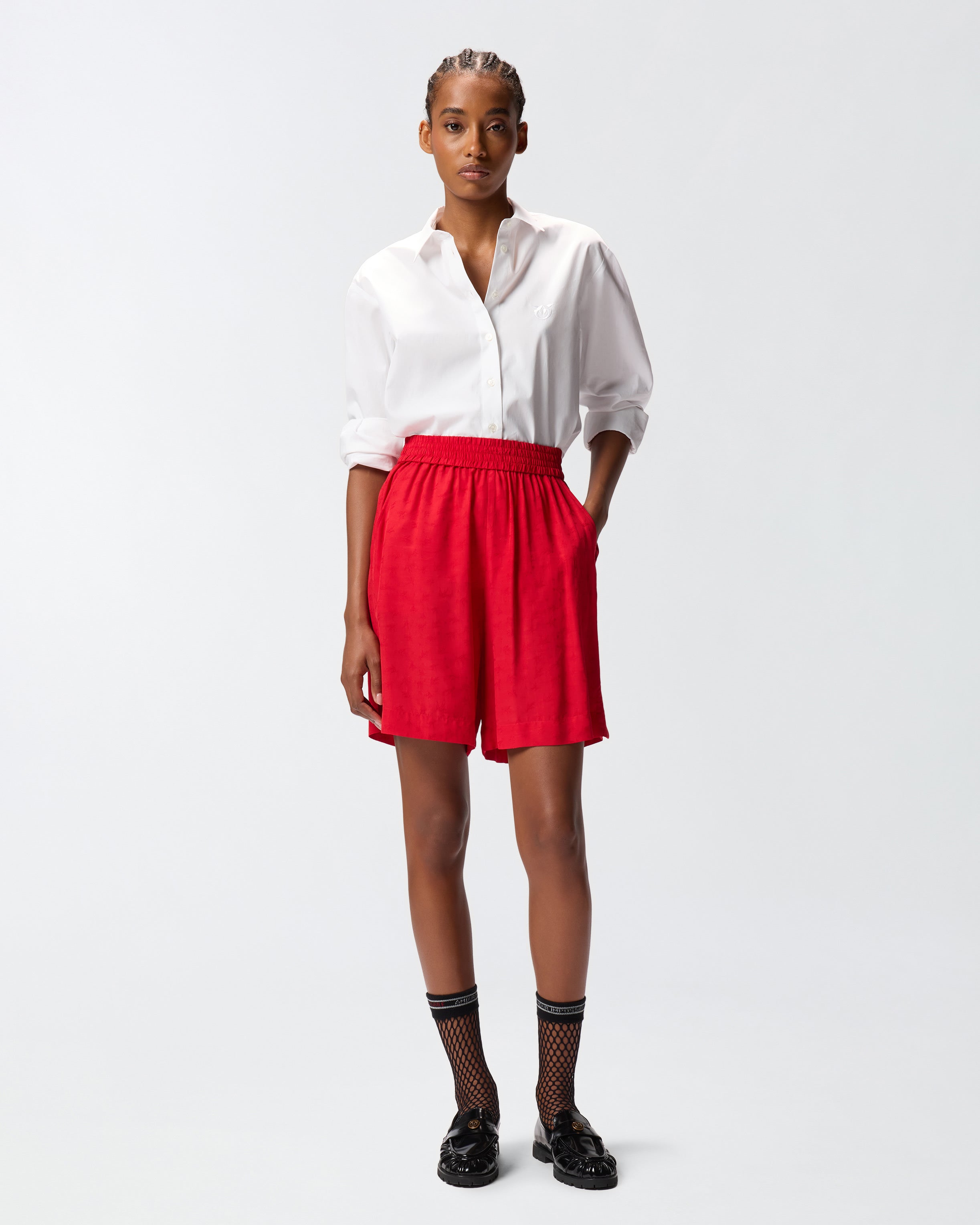 Bermuda dal taglio comodo con lunghezza al ginocchio. Il capo è realizzato in viscosa jacquard e la texture è animata da un motivo con logo Love Birds. La vita media ha un elastico che rende il capo molto confortevole all'indosso anche grazie al suo fit regular. Abbinalo alla sua camicia coordinata o spezza il look con un top leggero per un evento informale.