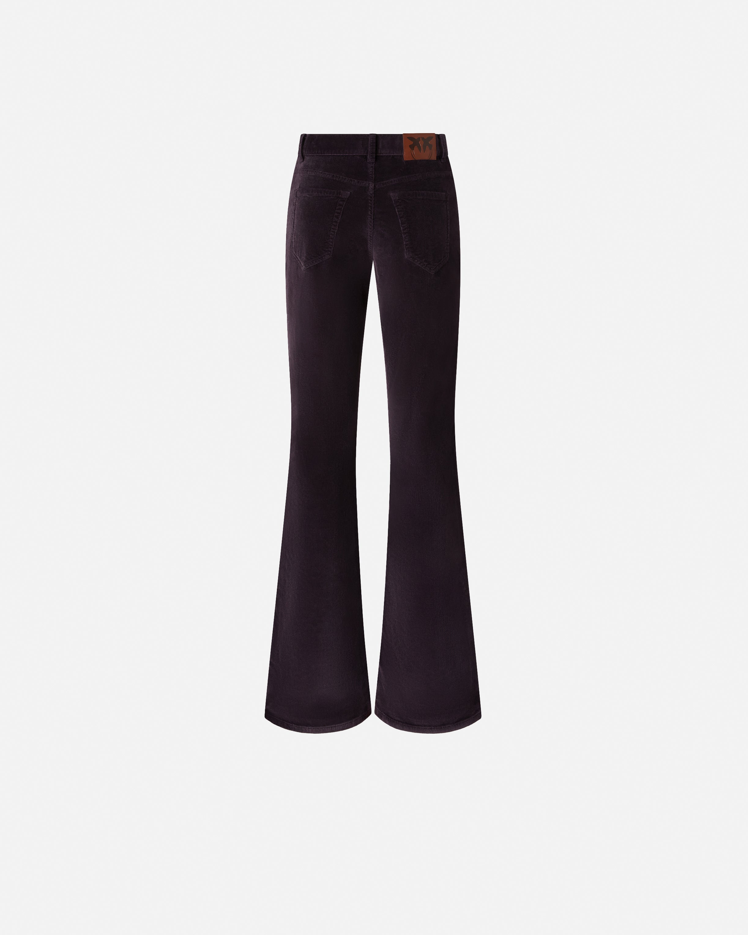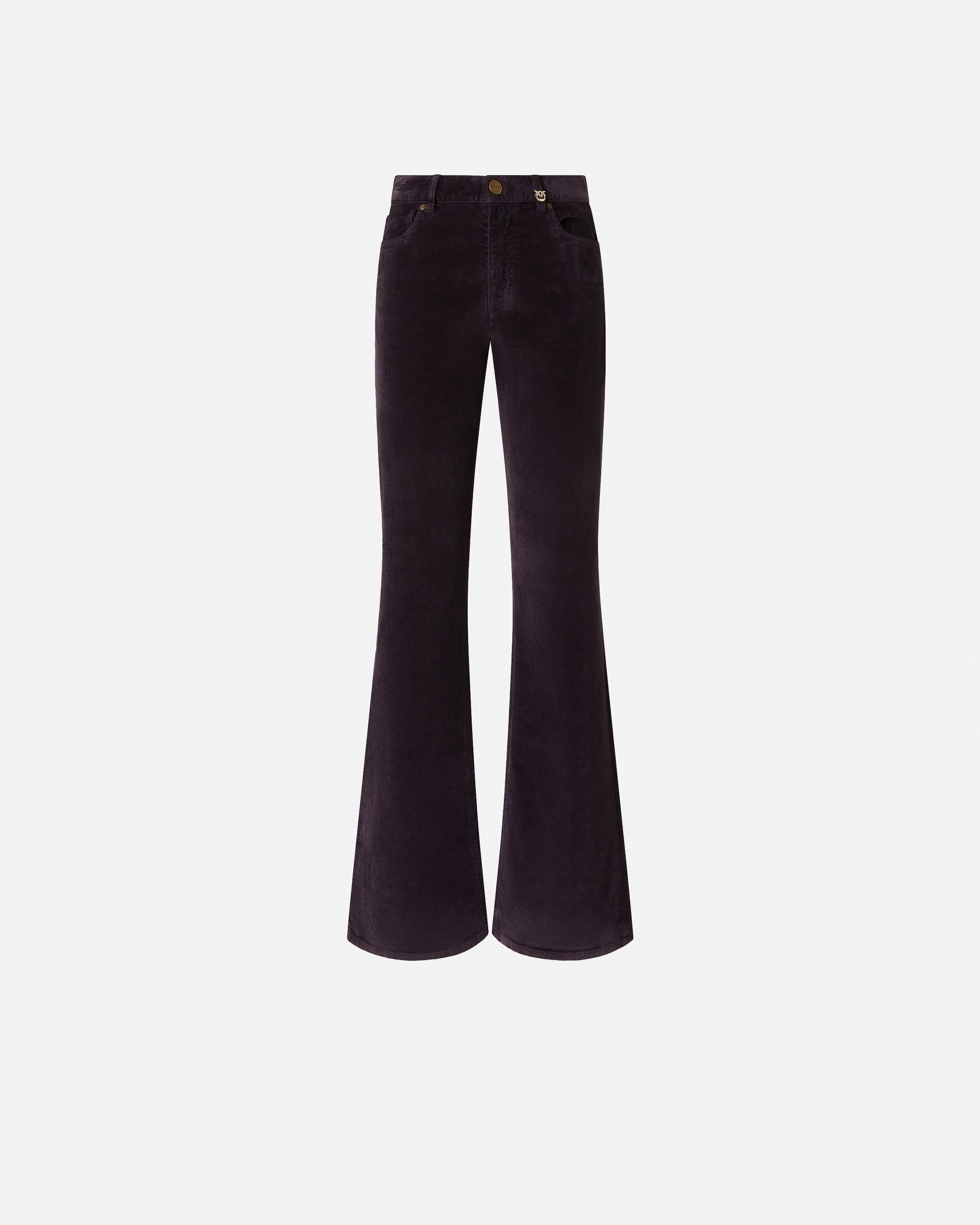 Pantaloni cinque tasche dalla linea flared, aderenti nella parte superiore della gamba e svasati al fondo, in velluto a costine con lavaggio old per conferire tridimensionalità. A personalizzare il design in puro stile PINKO troviamo la salpa con logo Love Birds impresso a caldo sul retrocinta e il passante rimovibile, sempre con logo Love Birds. Passanti per cintura e chiusura frontale con bottone e zip nascosta.