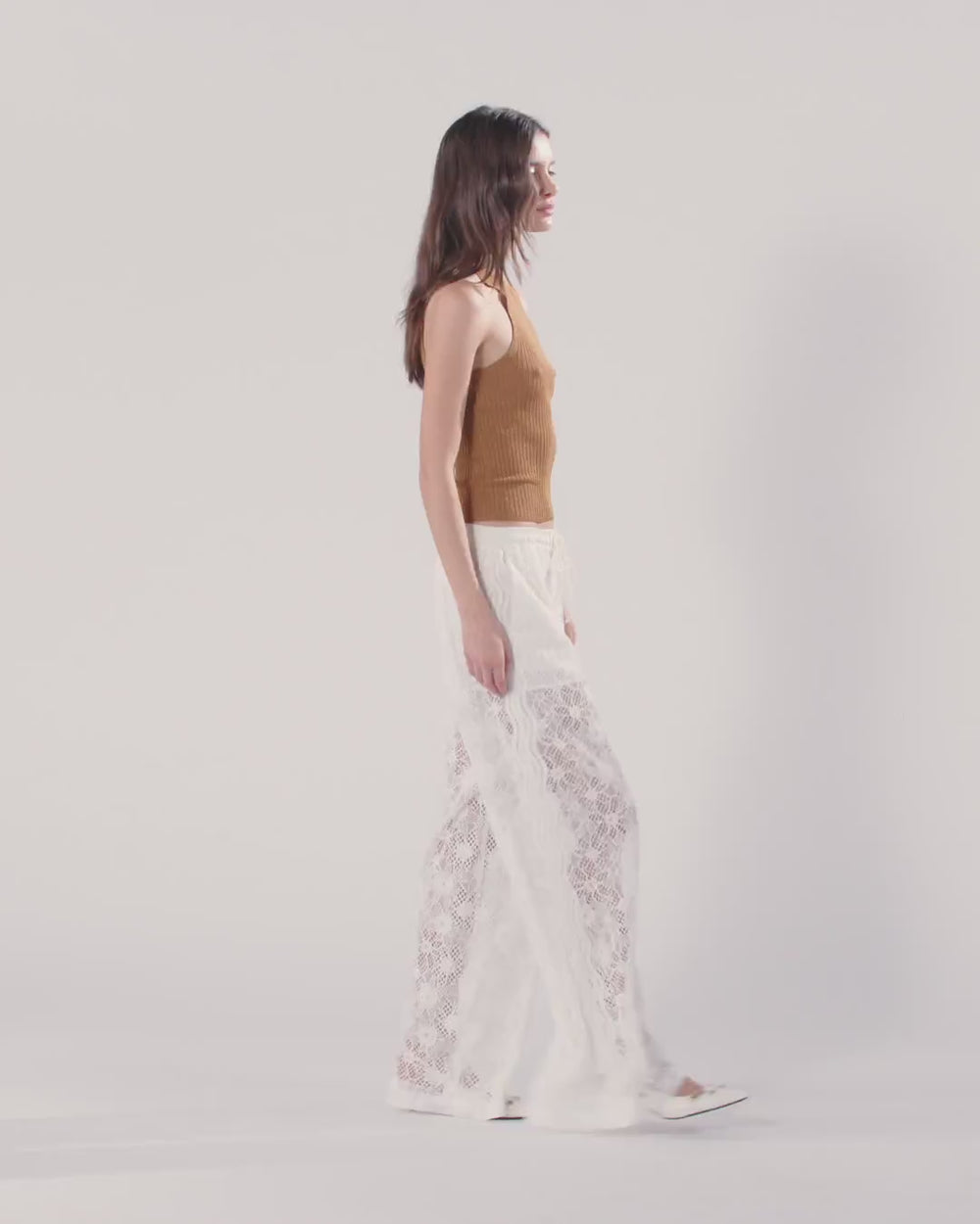 Pantaloni dalla linea leggermente svasata impreziositi da una lavorazione particolare: un sofisticato pizzo rebrodé con ricchi motivi floreali ricamati in modo da risultare tridimensionali, per un effetto finale scenografico e seducente. Il modello è dotato di una fodera parziale per attenuare le trasparenze e di una comoda vita con coulisse regolabile da annodare. Perfetta combinazione di sensualità e freschezza, questo capo è destinato a diventare un vero e proprio passe-partout del tuo guardaroba estivo.