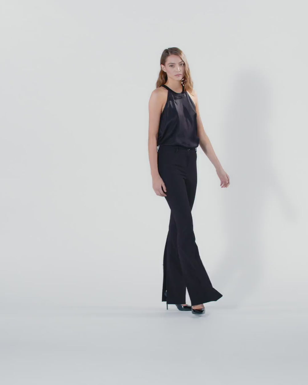 Pantaloni lunghi dalla vestibilità slim caratterizzati da uno spacco sul retro che parte dal ginocchio e che può essere regolato tramite un bottone a metà lunghezza per personalizzarne l'apertura. Il tessuto in viscosa tecnica riesce a unire morbidezza e fluidità creando una texture sofisticata che offre comfort e vestibilità ottimali, senza perdere l'aspetto strutturato del design. Le linee pulite e contemporanee sono il punto di forza di questo modello dallo stile minimalista.
