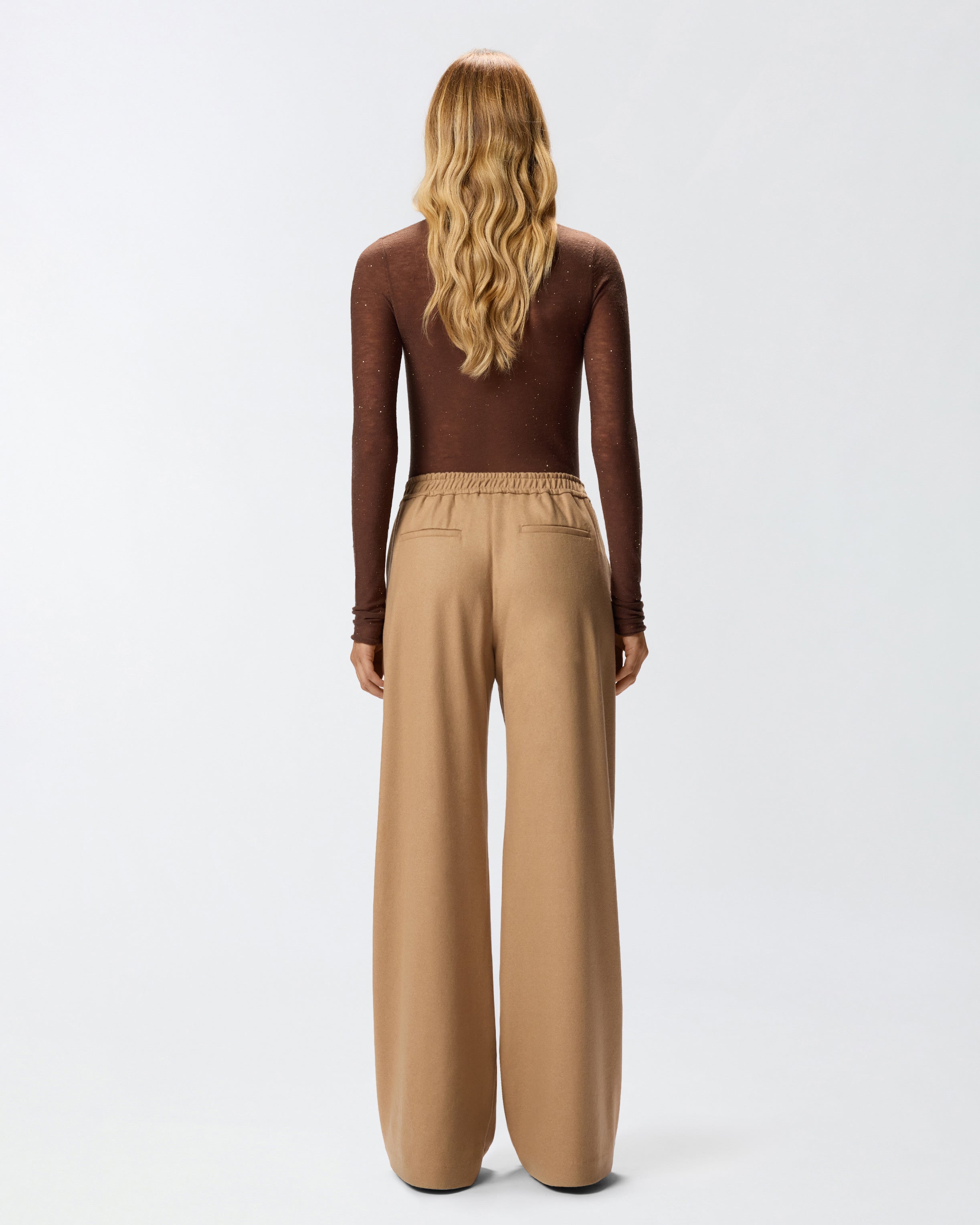 Pantaloni lunghi realizzati in flanella di jersey di misto lana tinto in filo, un tessuto perfetto per combinare sartorialità e comfort, e caratterizzati da una linea wide-leg con gamba svasata al fondo. Il modello unisce lo stile sartoriale nei dettagli delle tasche a filetto posteriori e nella tipica tasca alla francese, con il comfort sportivo della vita arricciata con elastico. I pantaloni a gamba ampia sono i nuovi must-have dei look formali ed eleganti, sia per look spezzati che per un nuovo concetto di tailleur.