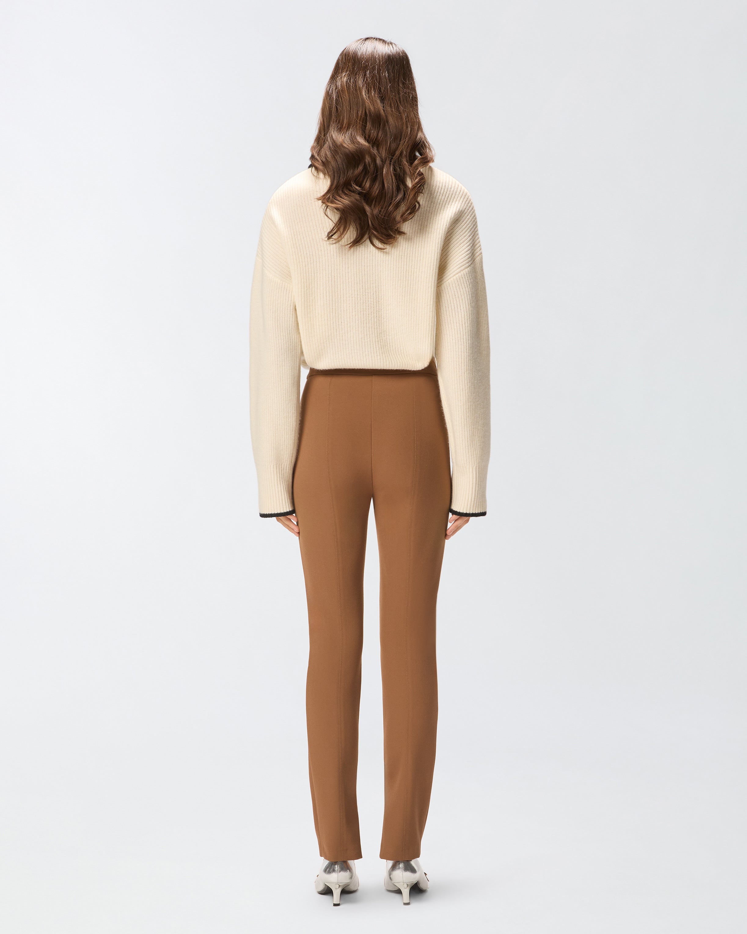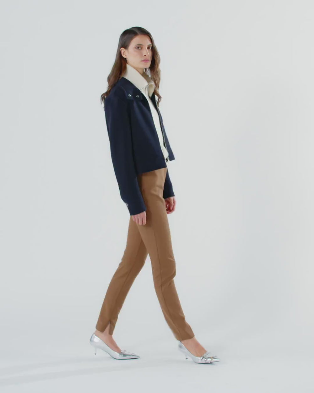 Pantaloni skinny con gamba aderente e chiusura frontale con zip nascosta e bottone visibile. Il crêpe di poly viscosa, un tessuto doppio particolarmente versatile e performante grazie alla costruzione bistretch, è stato sottoposto a trattamenti di alta qualità che permettono di ottenere un sofisticato aspetto laniero. Le gambe sono rifinite da raffinate impunture fronte e retro, e sono dotate di una zip invisibile sul lato interno per permetterti di regolare l'indosso.