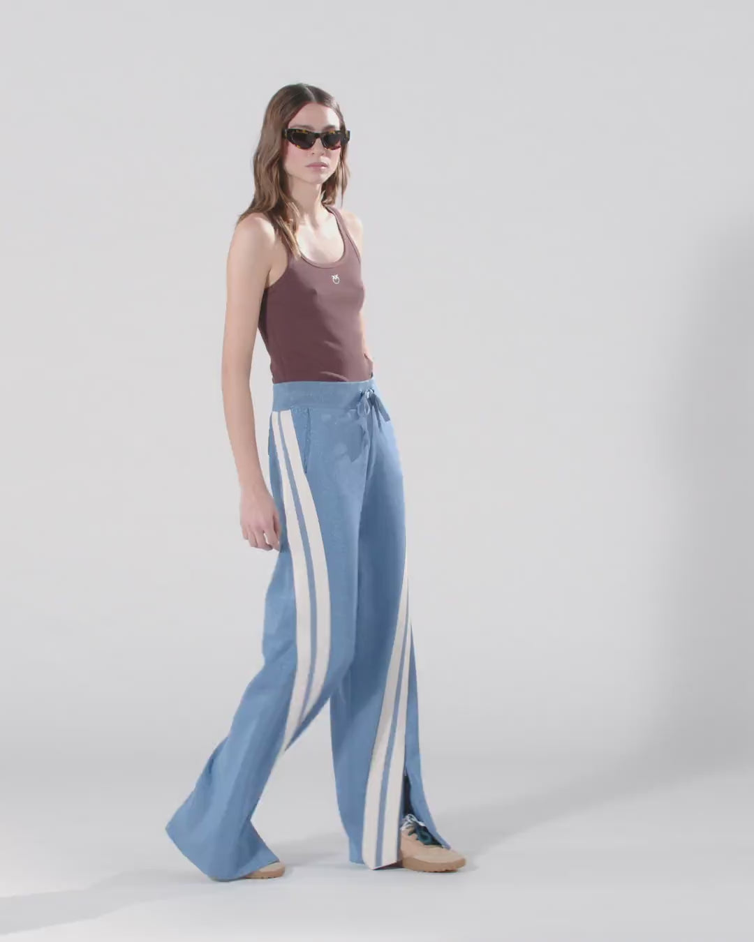 Pantaloni sportivi con gamba morbida al fondo realizzati in tessuto piquet effetto felpa con all'interno un sottile filo metallizzato che conferisce brillantezza. Il capo è dotato di vita elasticizzata con coulisse, tasche laterali e zip a fondo gamba per personalizzare la vestibilità, ed è caratterizzato da doppie bande laterali a contrasto che donano movimento al design. Il tocco di personalizzazione è dato dall'iconico logo Love Birds in versione embossed sul retro. - TORMENTA PANTALONE
