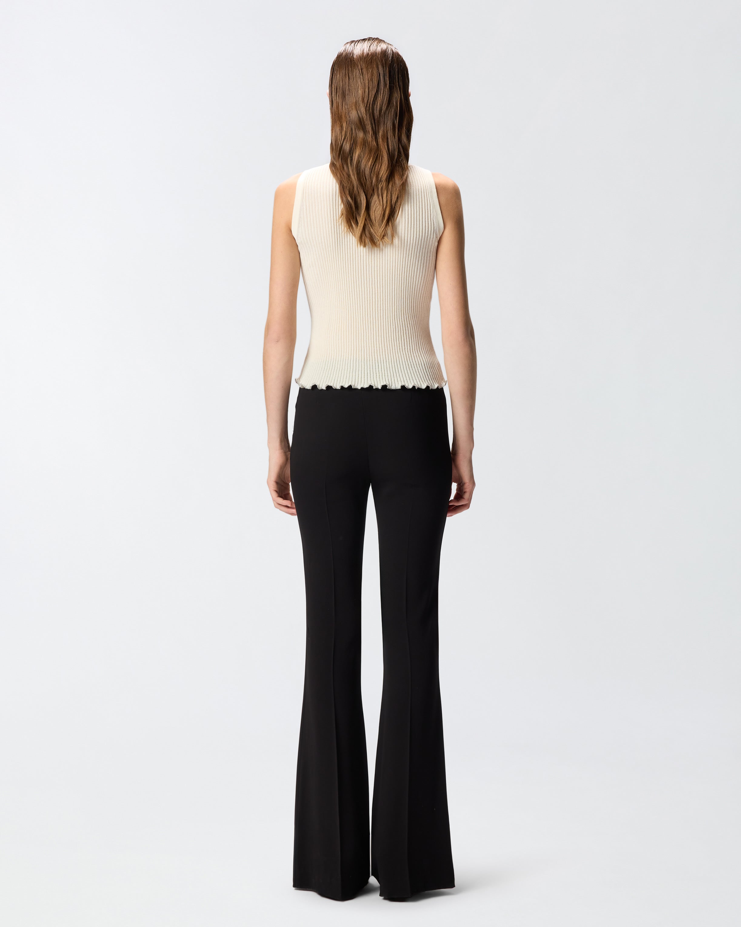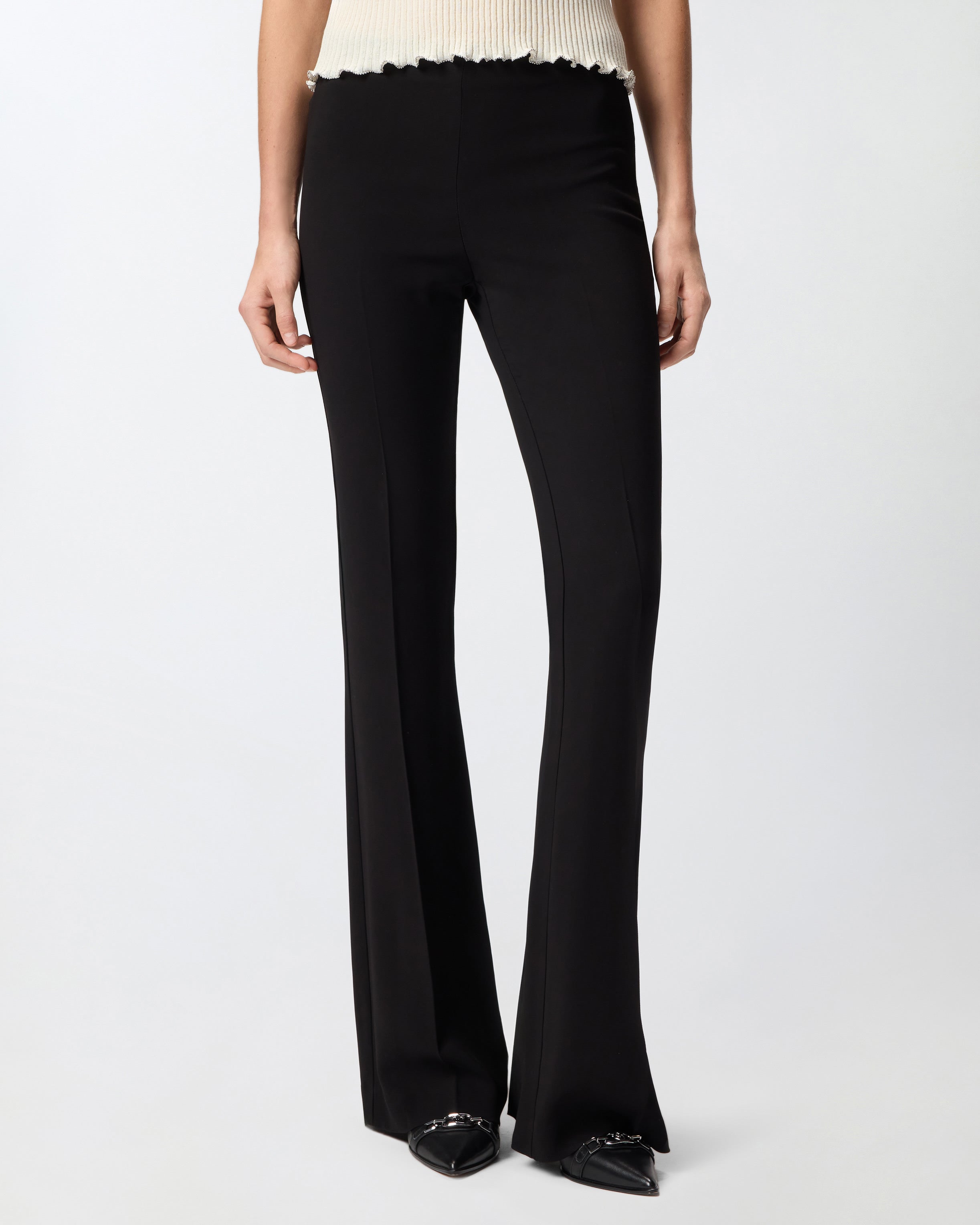 Pantaloni realizzati in viscosa stretch, tessuto iconico che richiama il classico cady, caratterizzato da una mano morbida e avvolgente che scivola con naturalezza sul corpo, definendo la silhouette con eleganza e offrendo una vestibilità impeccabile. Il modello, dalla linea svasata che esalta la figura, presenta una raffinata piega stirata centrale fronte e retro e una chiusura con zip sul retro. Abbina i pantaloni con la giacca dello stesso colore per un tailleur raffinato da indossare per cerimonie e occasioni speciali.