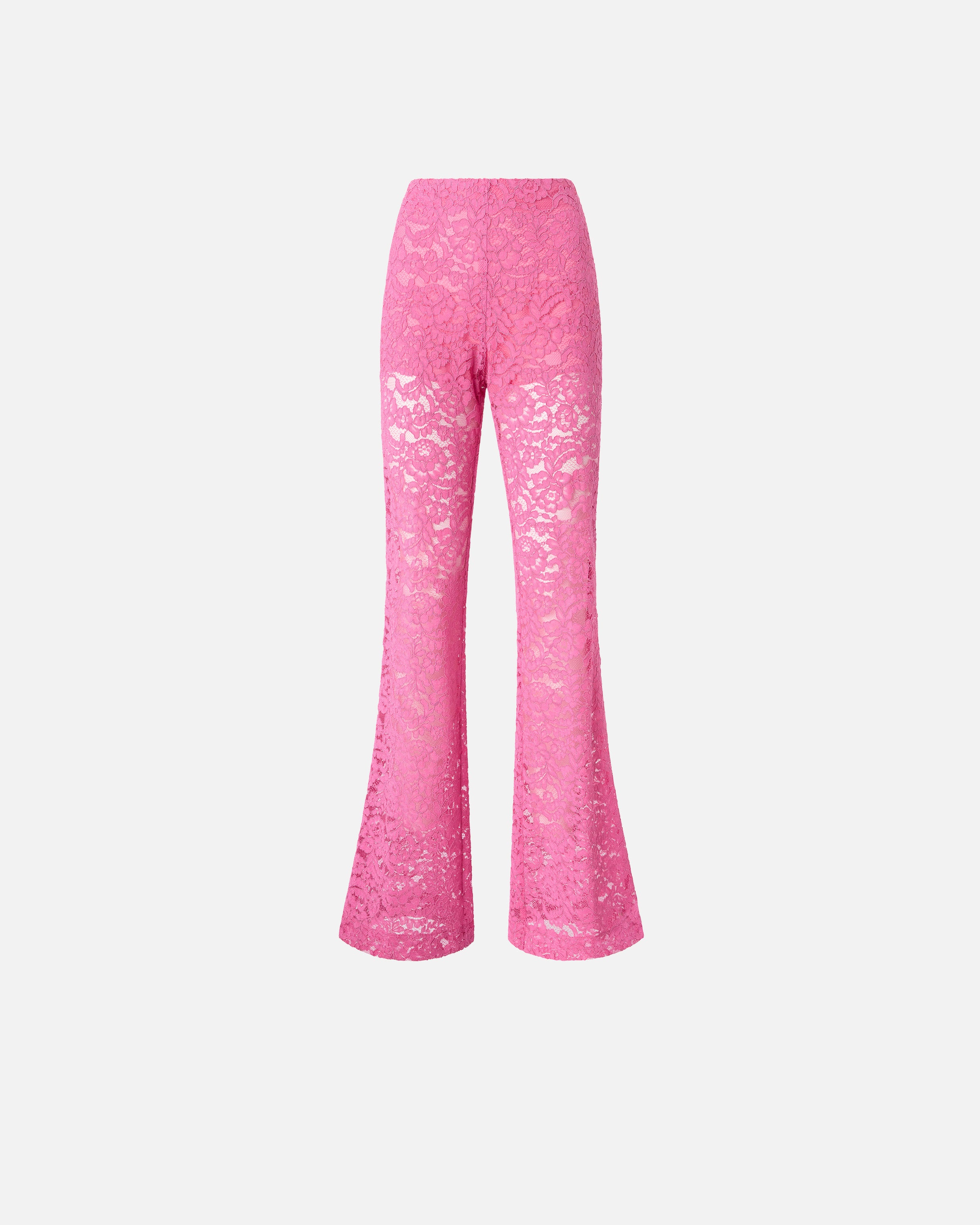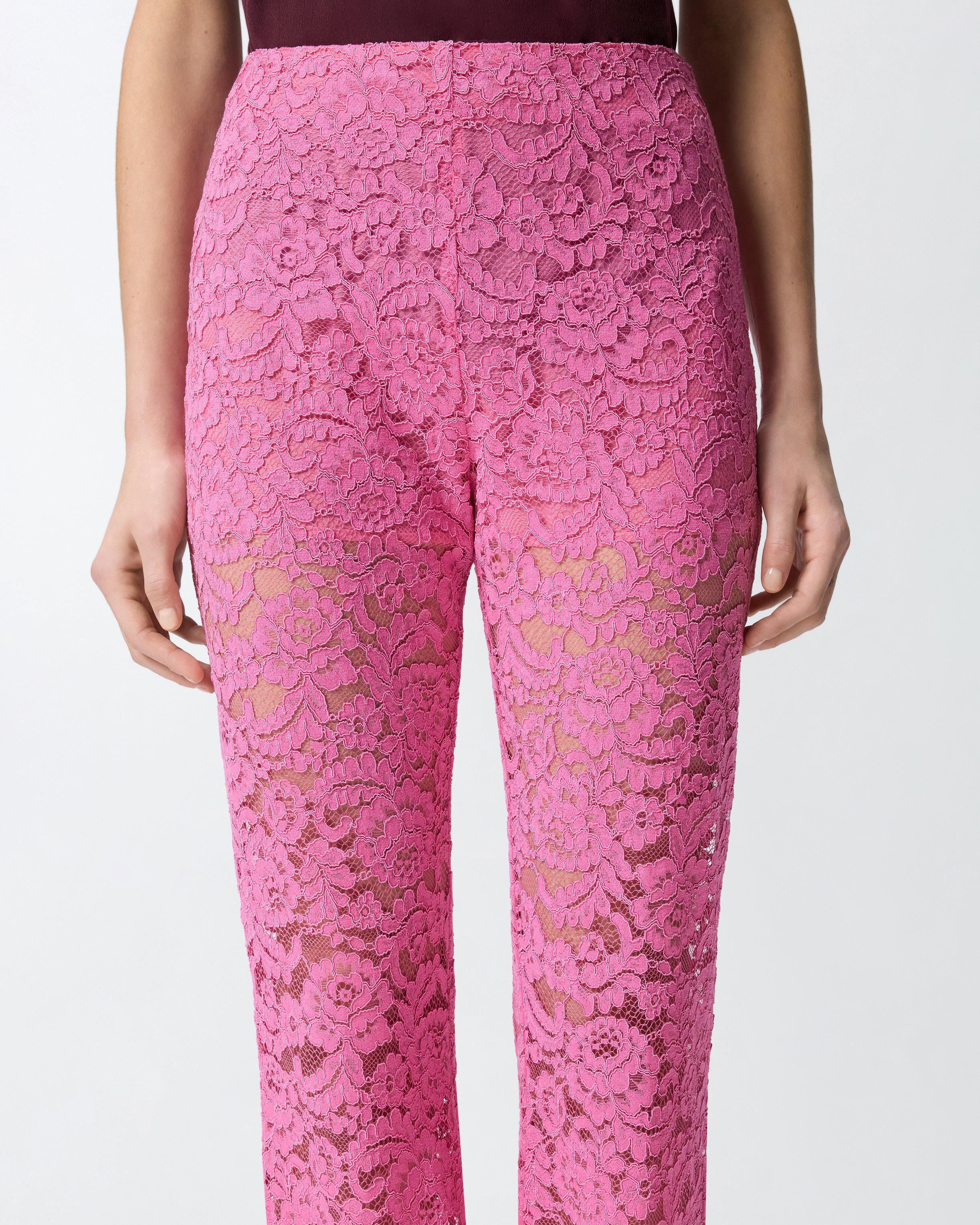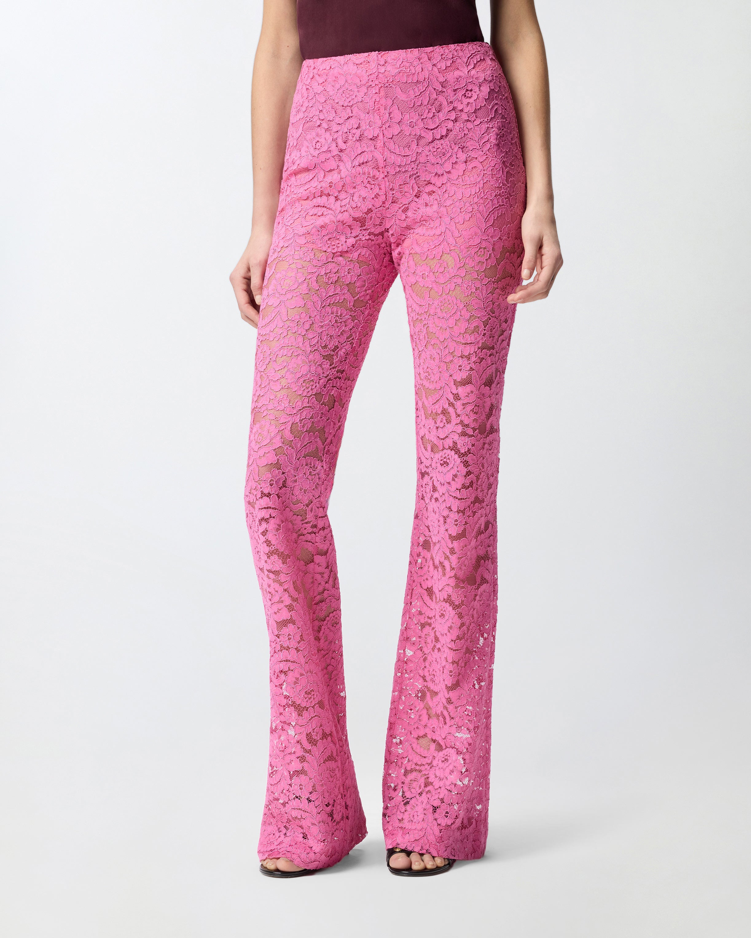 Pantaloni dalla linea svasata foderati e impreziositi da una lavorazione particolare: un sofisticato pizzo rebrodé con ricchi motivi floreali ricamati in modo tale da risultare tridimensionali, per un effetto finale scenografico e seducente. Indossa questi pantaloni con la giacca coordinata per creare un total look da vera star durante le occasioni speciali, oppure abbinali a capi più casual per un outfit quotidiano d'impatto.
