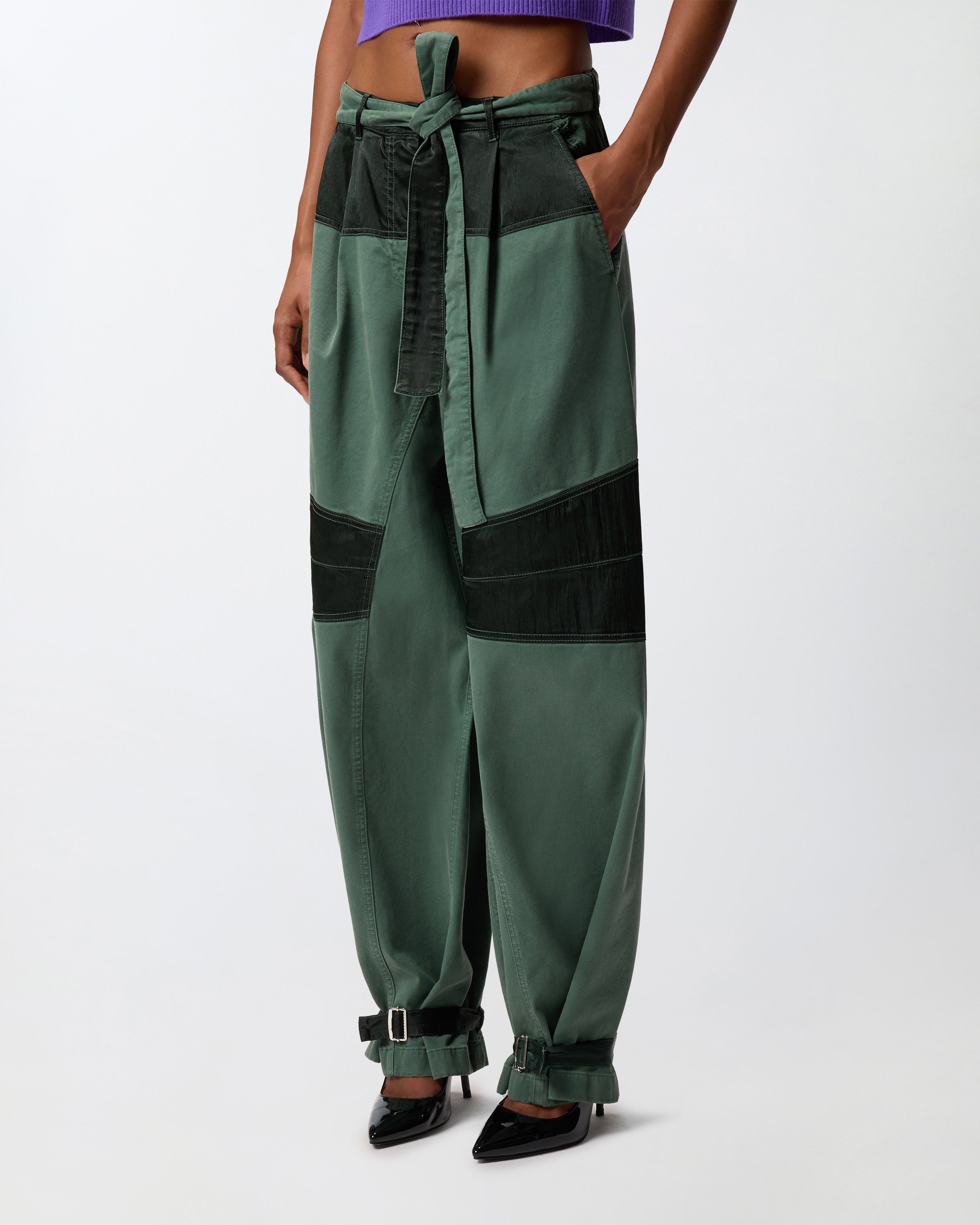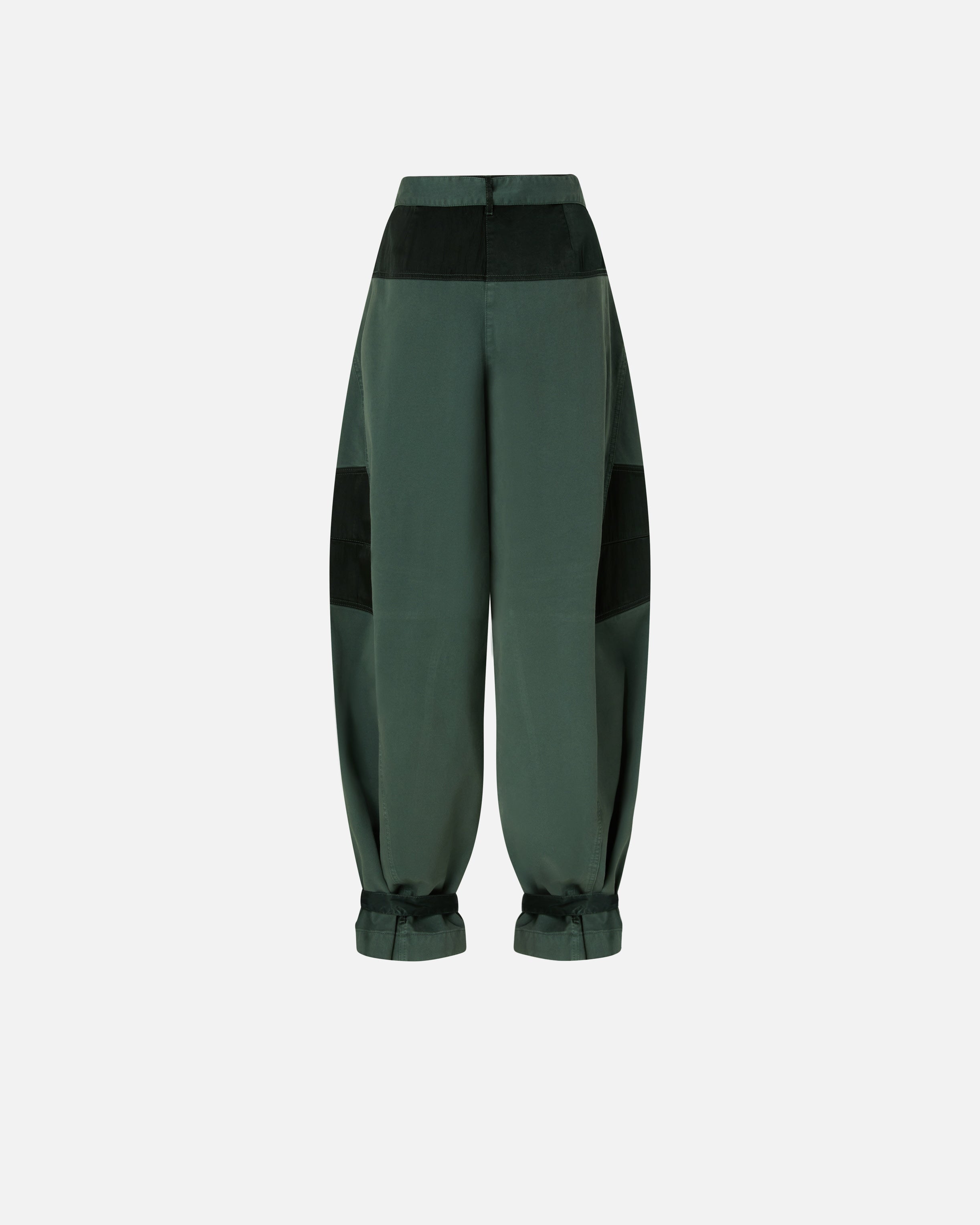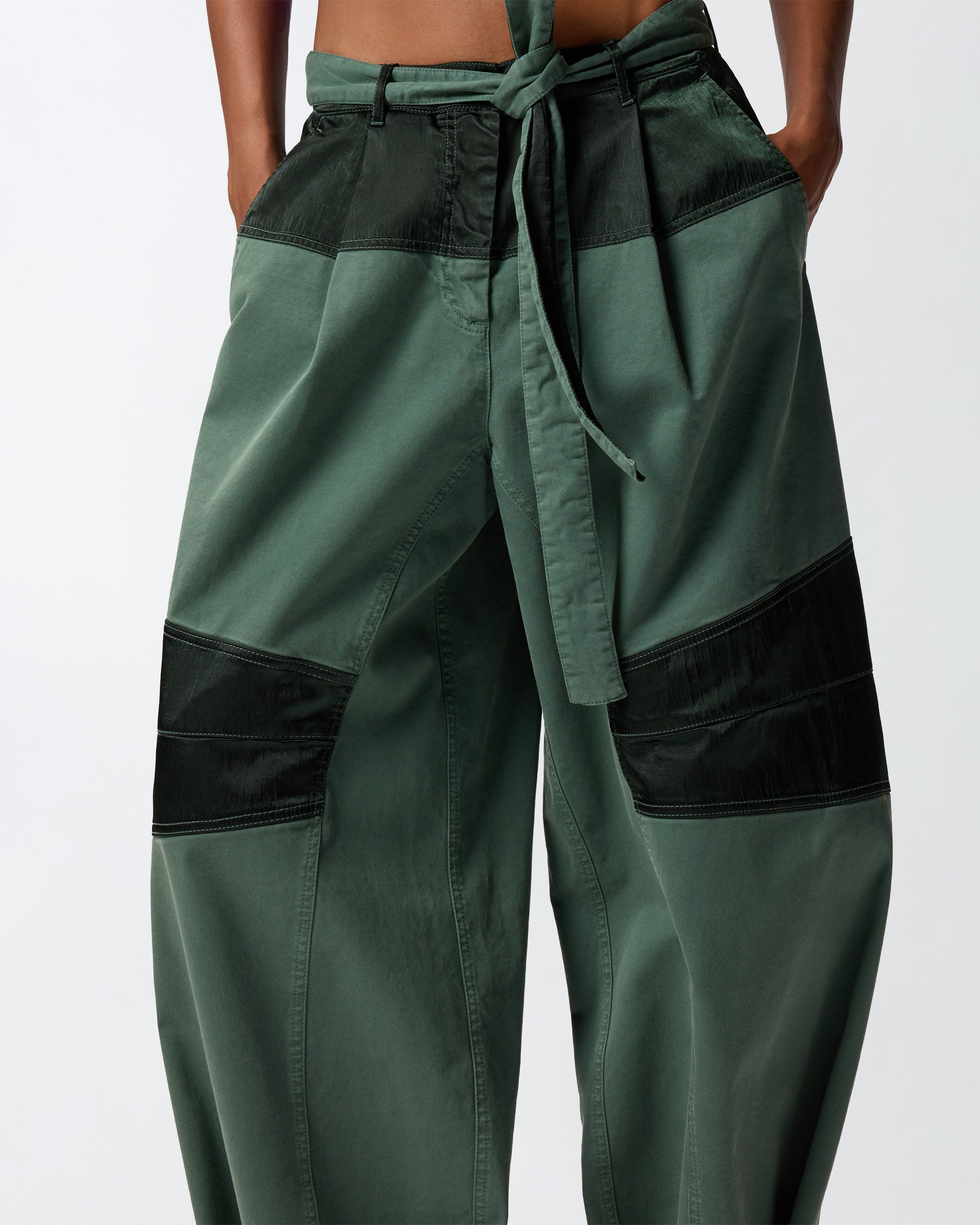 Pantaloni con gamba barrel molto ampia e arrotondata, realizzati in cotone con sezioni in raso tinto in capo, per creare un contrasto di tessuti tipico dell'universo PINKO. Il modello presenta passanti per cintura, impunture, tagli e inserti che lo rendono un vero e proprio emblema dello stile utility, ed è completato da una cintura abbinata da annodare in vita e da cinturini sul fondo regolabili per personalizzare la vestibilità e lo styling. Abbraccia lo stile sportivo e funzionale con questo capo contemporaneo, ideale da indossare nelle occasioni più casual.