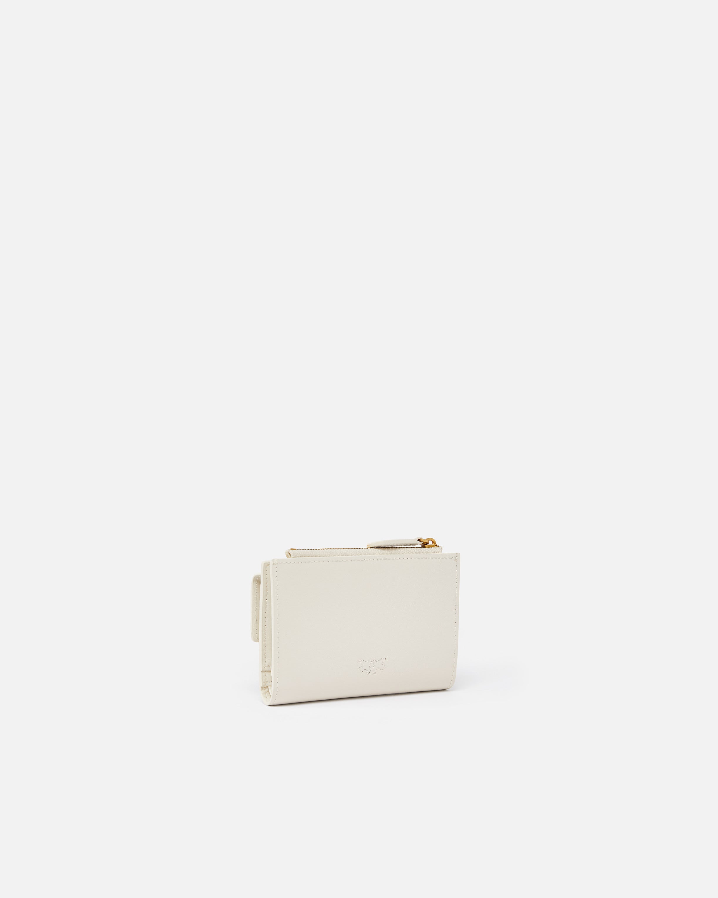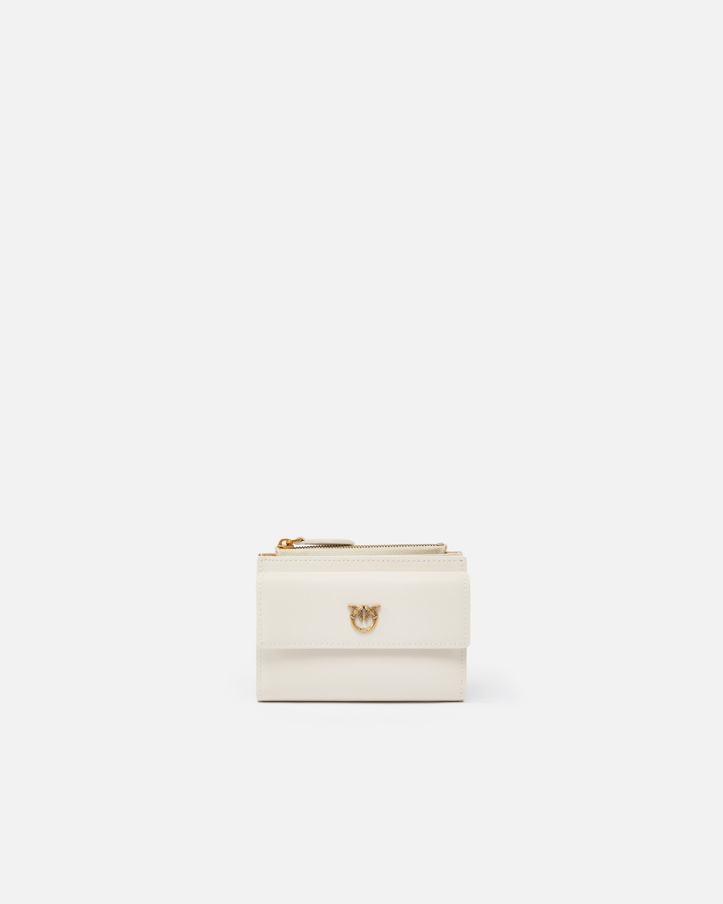 Portafoglio compatto e multifunzione di piccole dimensioni, dalla forma rettangolare, realizzato in morbida pelle mano seta, dalla texture liscia. L'interno del portafoglio è ben organizzato con diversi spazi per carte di credito, mentre l'esterno è completato da scomparto portamonete, chiuso con patta personalizzata con piccola placca in metallo logo Love Birds Diamond Cut. Il portafoglio è chiuso con bottone interno, per mantenerne la forma compatta, perfetta anche per le borse più piccole.