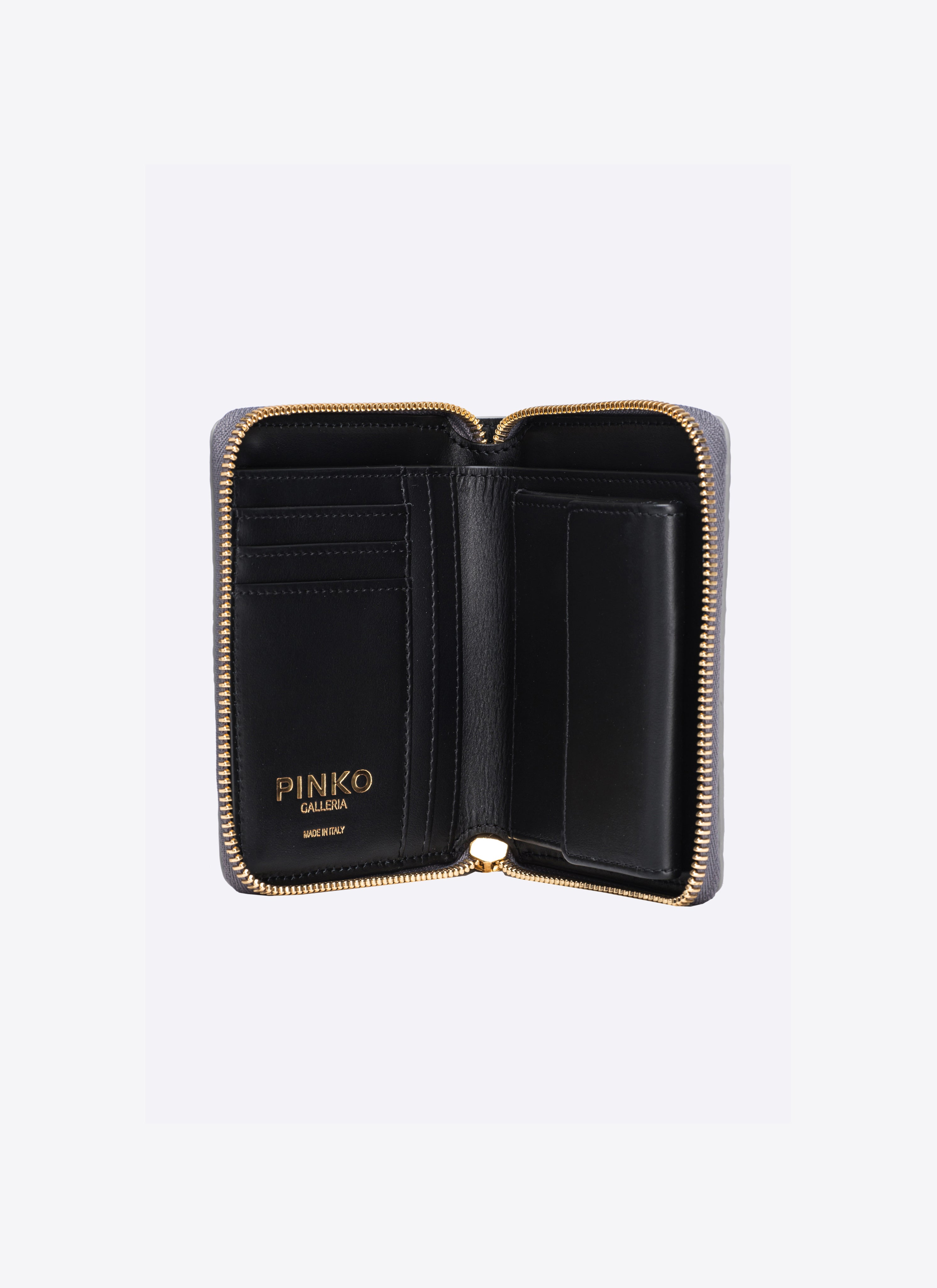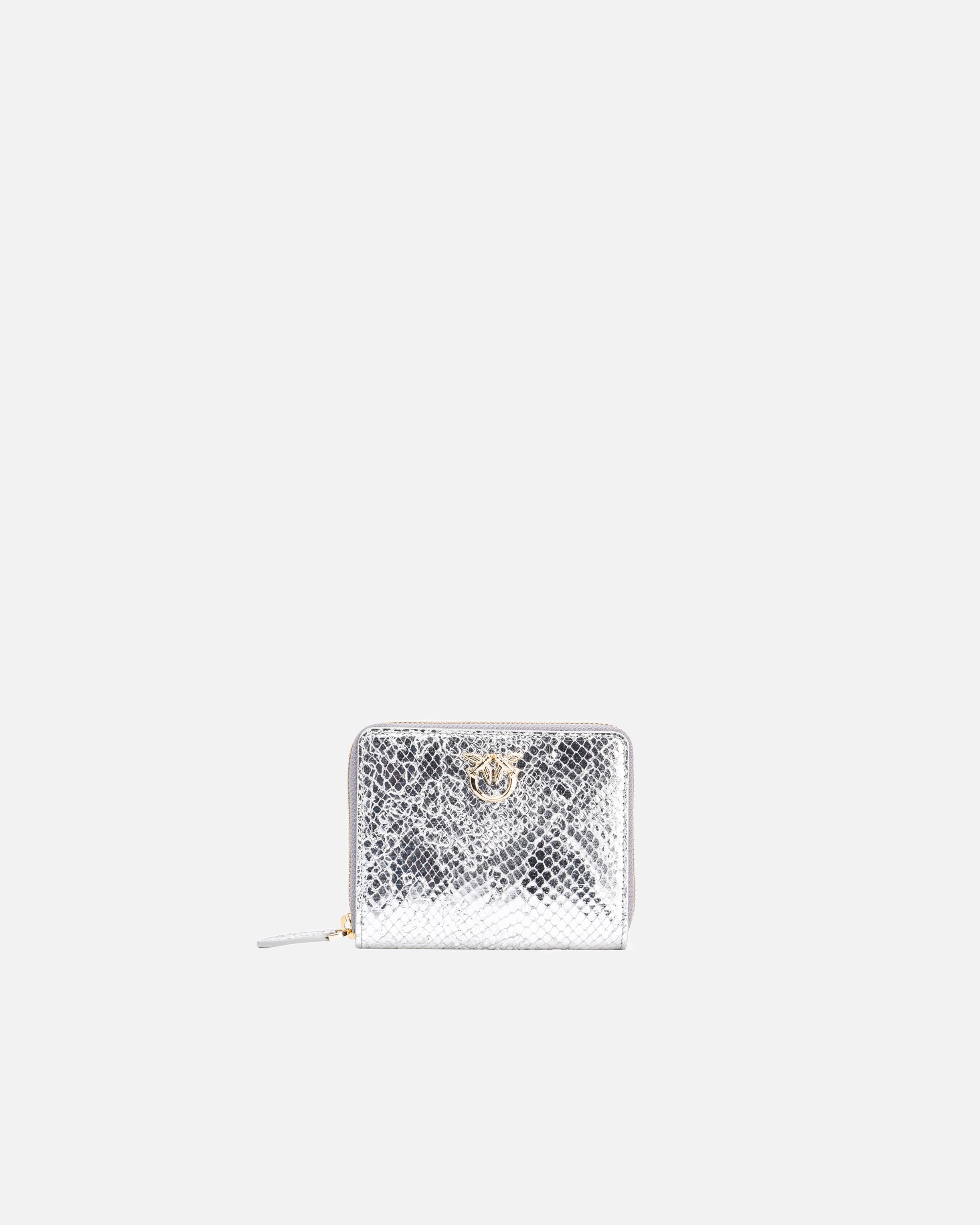 Portafoglio quadrato con chiusura a zip in pelle martellata e goffrata effetto rettile, personalizzato con placca Love Birds Diamond Cut in metallo placcato oro chiaro. Fodera interna in tessuto. Chiusura con zip. L'accessorio fa parte della collezione capsule speciale in edizione limitata che comprende modelli in edizione limitata esclusivi PINKO Galleria.