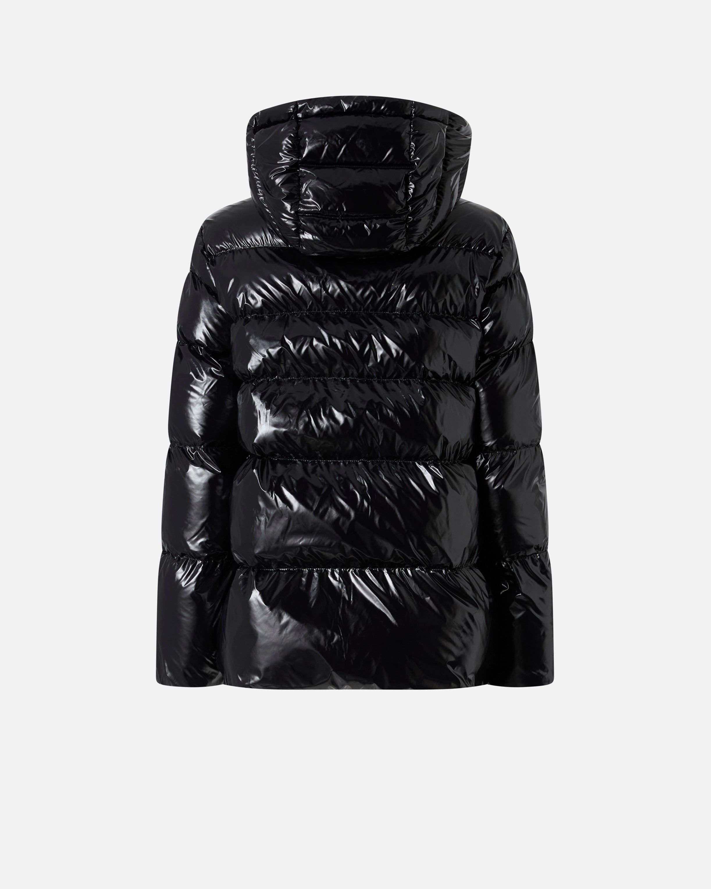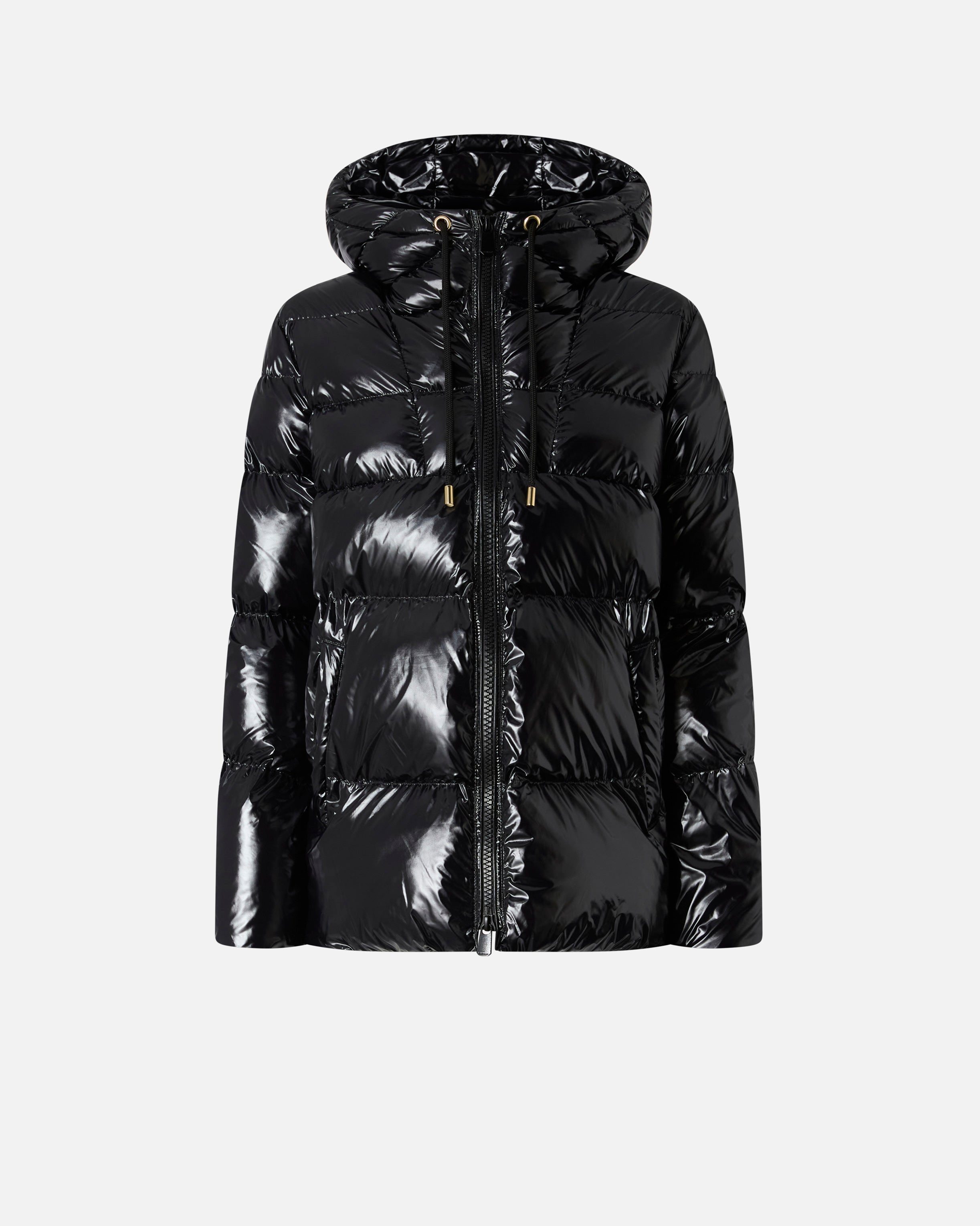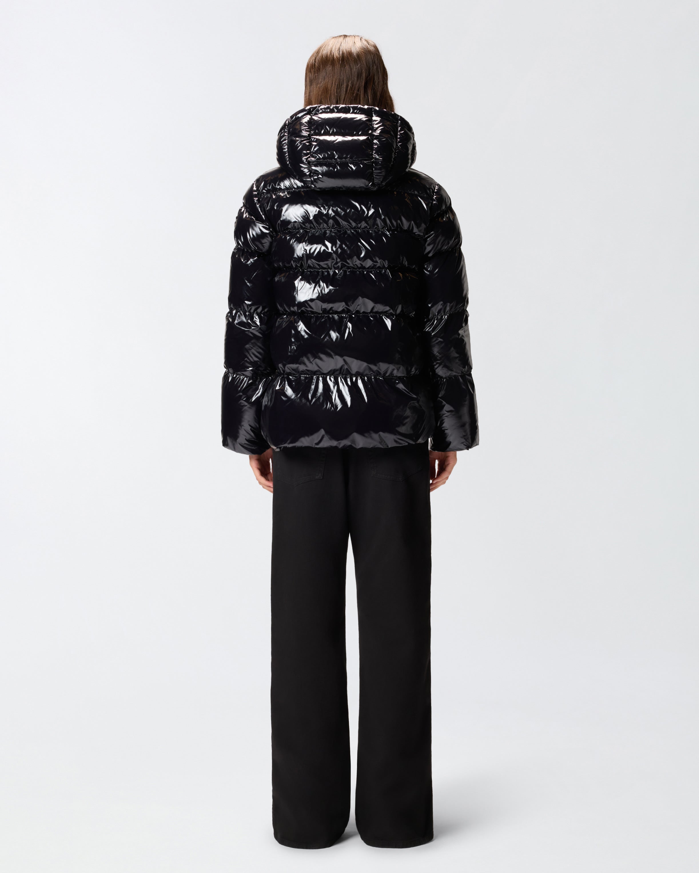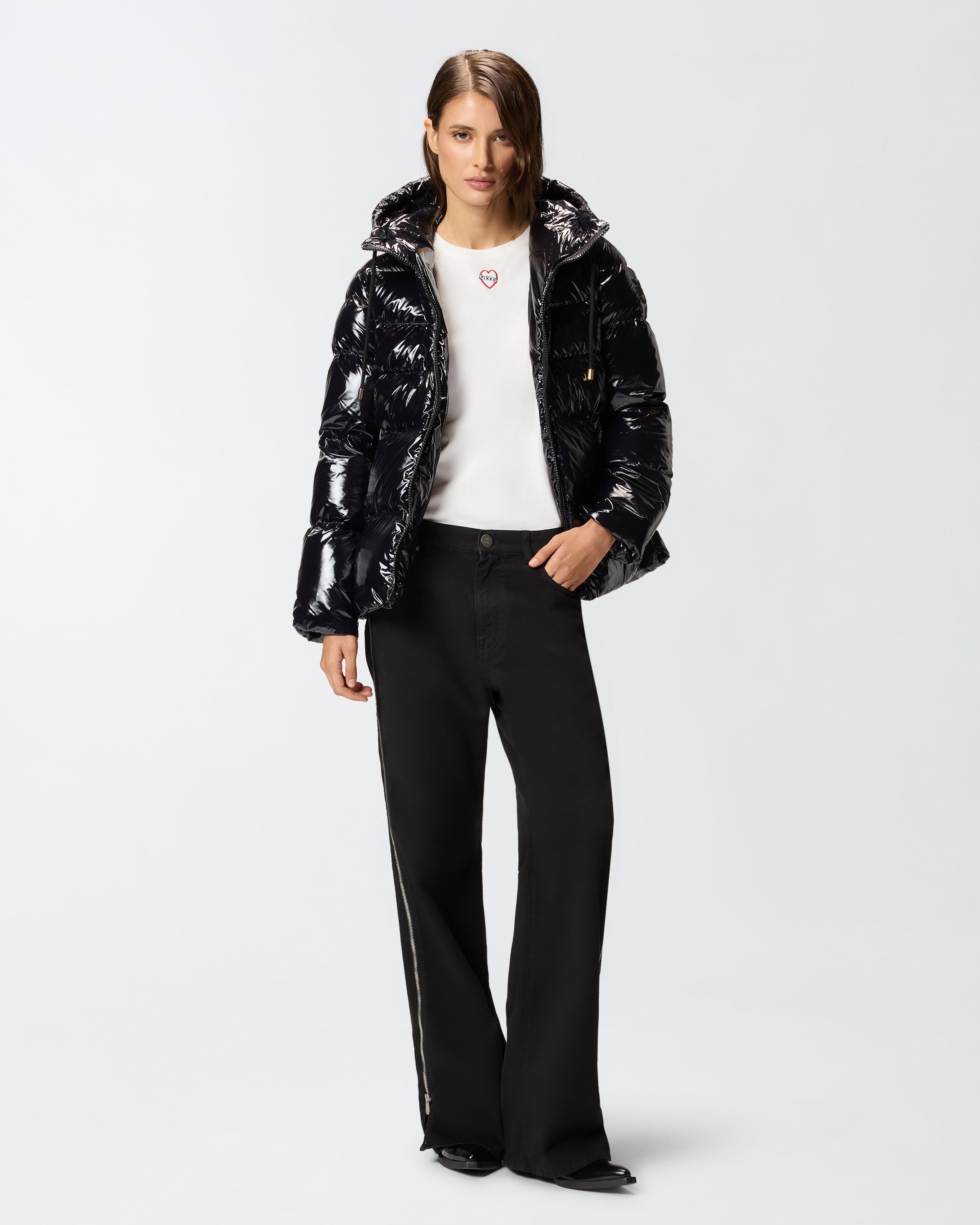 Piumino imbottito dalla silhouette caban in tessuto crystal nylon dal particolare finishing lucido, personalizzato da patch logo Love Birds su una manica. Collo a cappuccio con coulisse a cordino con finalino in metallo, maniche lunghe e tasche a filetto verticale sui fianchi. Il capospalla è foderato per un maggiore comfort durante l'indosso. Chiusura con zip davanti, doppio cursore.