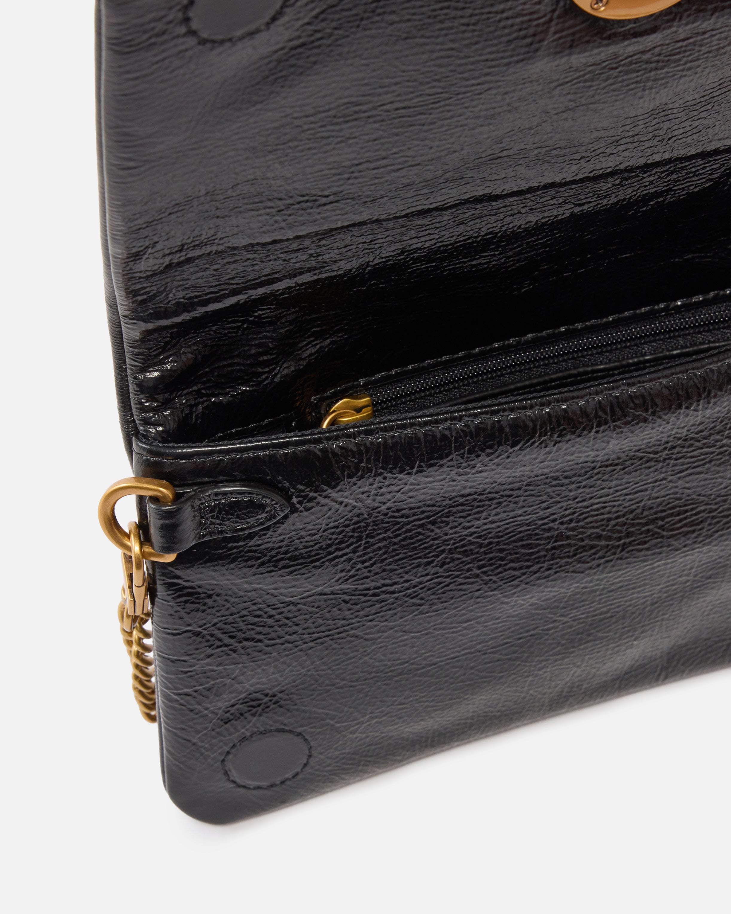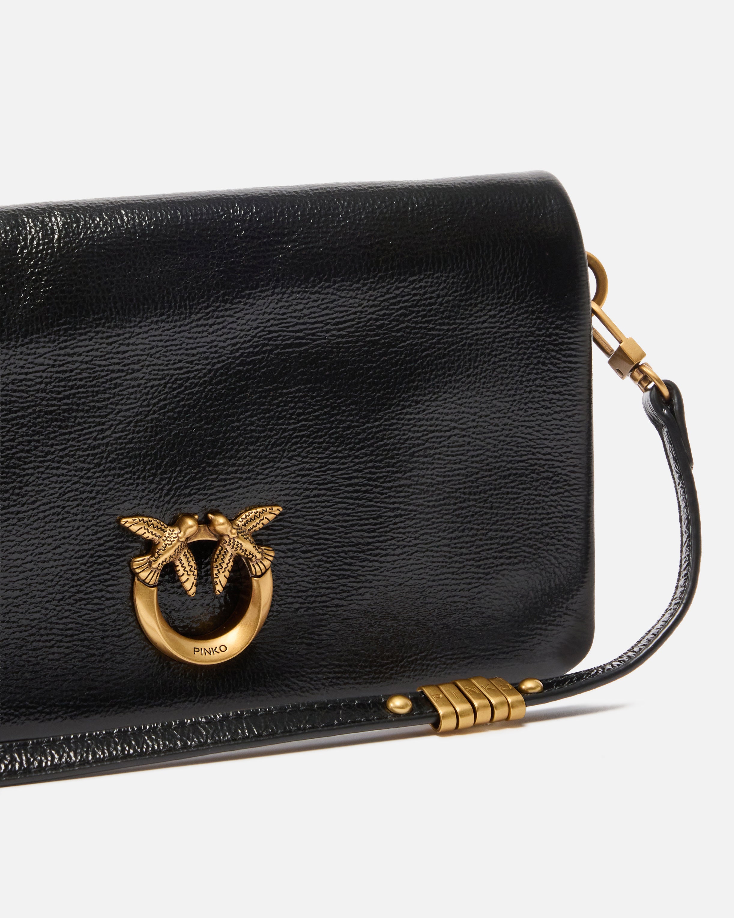 Pochette Love Bag Click Soft Horizontal Mini di piccole dimensioni dal design piatto e dalla forma rettangolare, realizzata in pelle shiny effetto vintage. La borsetta, personalizzata dall'iconico logo metallico Love Birds Diamond Cut sul davanti, può essere indossata a spalla, crossbody oppure a mano grazie alle due diverse tracolle: una sottile a catena rimovibile, e una regolabile e rimovibile in pelle con anelli decorativi in metallo che formano il logo lettering PINKO. La chiusura con due bottoni interni a calamita rivela un interno foderato in drill di cotone con tasca a parete chiusa da zip. Attiva la tua borsa PINKO: verifica l'autenticità del tuo prodotto e accedi all'esperienza personalizzata avvicinando il tuo smartphone al ricamo Love Birds che trovi sul retro della borsa!