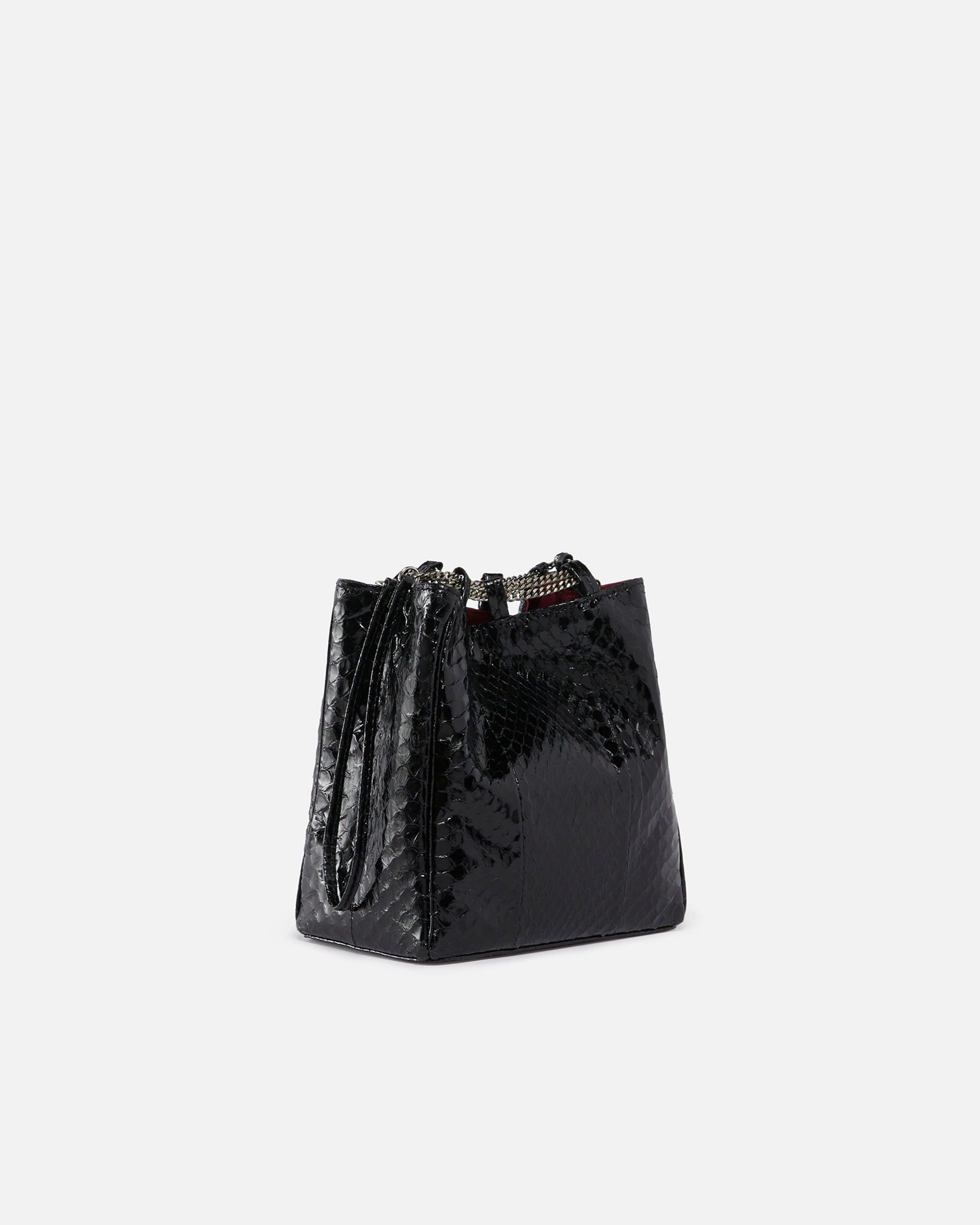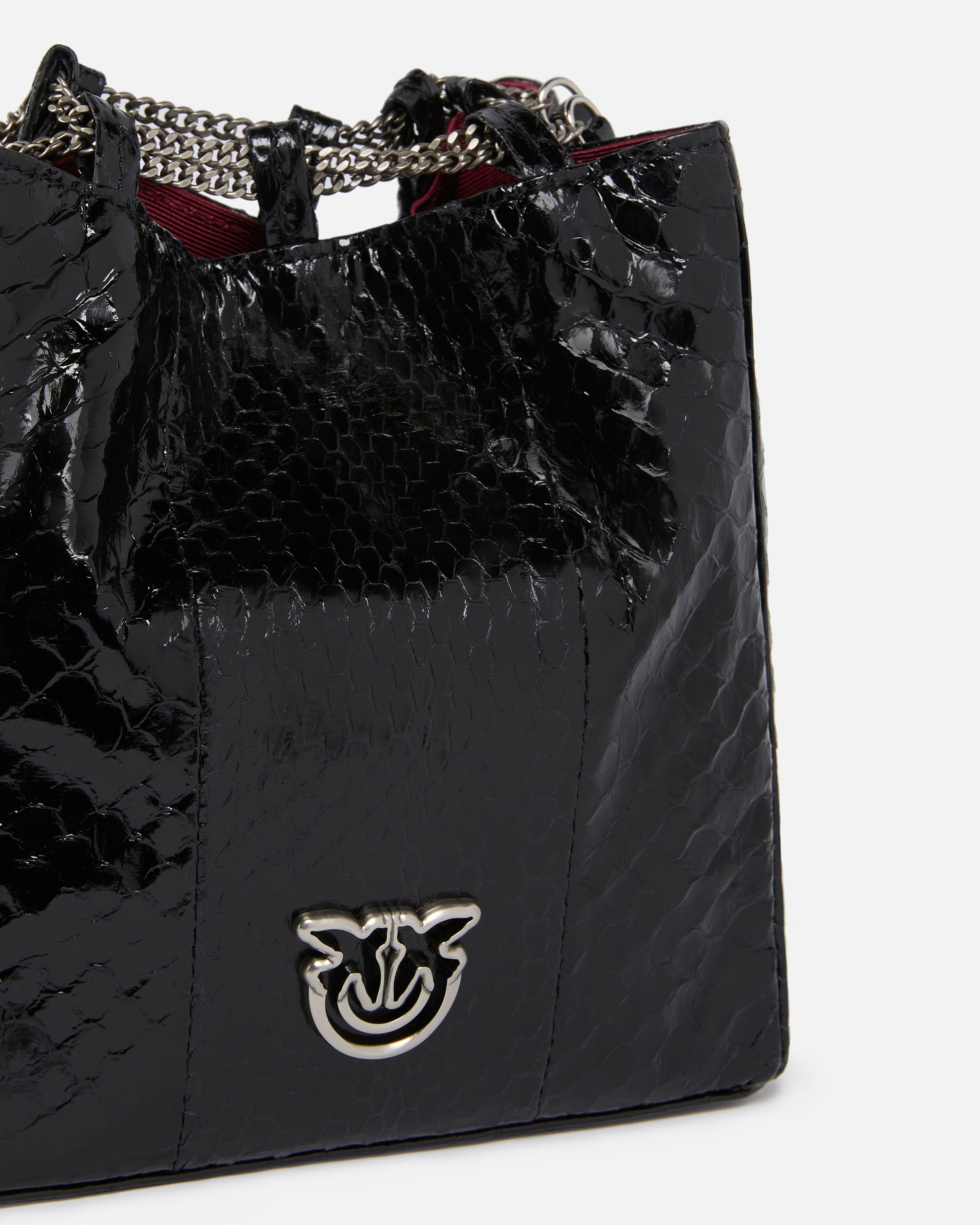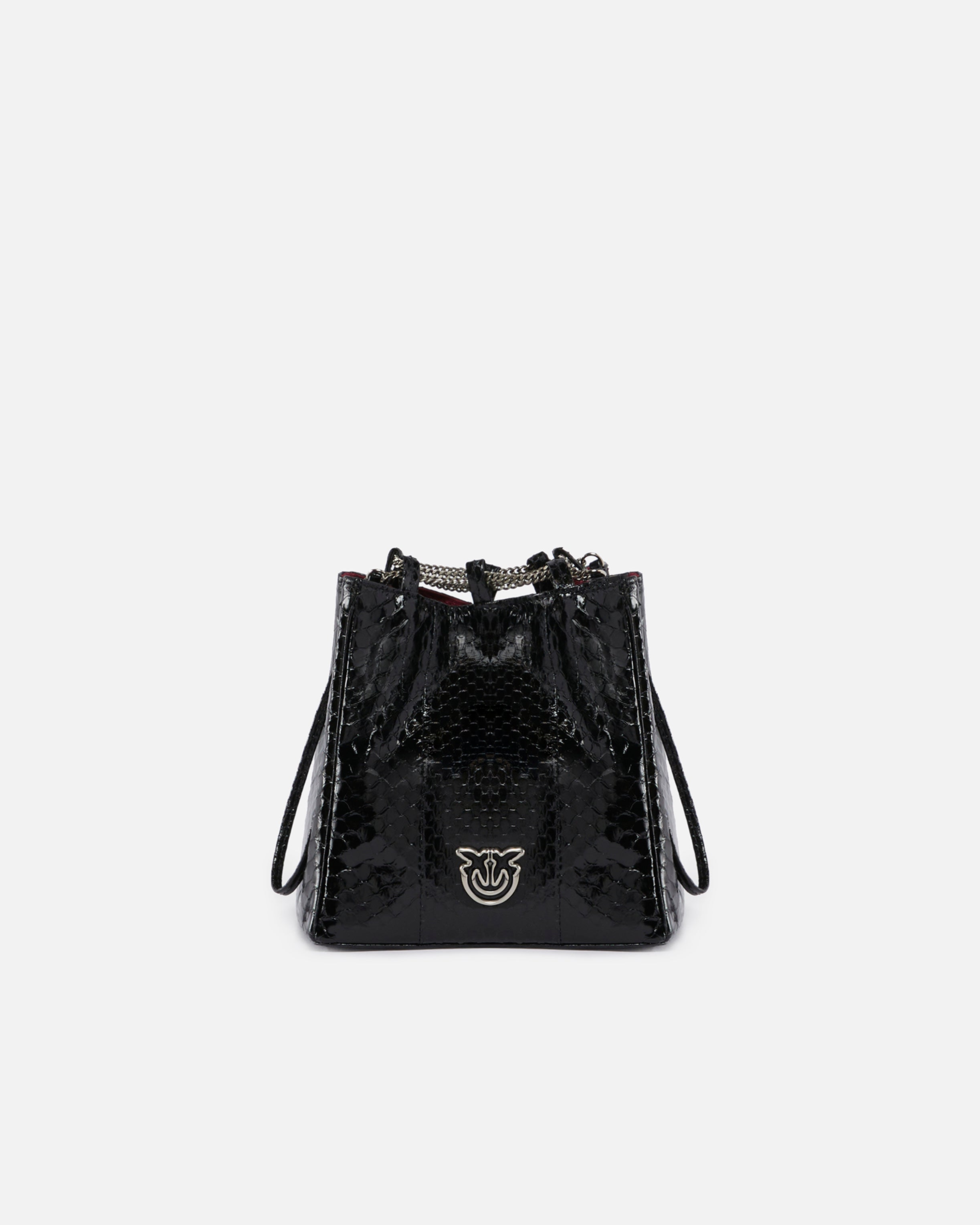 Piccola pochette dalla forma a mini secchiello realizzata in pelle di rettile pitone ayers con una particolare rifinitura lucida. Questo particolare tipo di pellame viene piazzato sulla borsa e poi applicato a mano su ogni modello: in base alla pelle utilizzata, ogni borsa risulta perciò unica nel suo genere, eventuali imperfezioni sono da considerarsi un dettaglio caratteristico e distintivo. Il secchiello di piccole dimensioni è foderato in tessuto a contrasto, e una catenella lo chiude per tenere al sicuro i tuoi essenziali. La borsetta è completa di manici sottili per la portata a mano, rendendo questo accessorio un vero indispensabile per le occasioni speciali, reso ancora più prezioso dalla placchetta con logo Love Birds Diamond Cut in metallo smaltata in tono colore. La borsa fa parte della speciale capsule collection Limited Edition realizzata in tiratura limitata esclusivamente per PINKO Galleria. Utilizza lo speciale chip NFC per vivere una speciale experience dedicata alla borsa che hai acquistato!