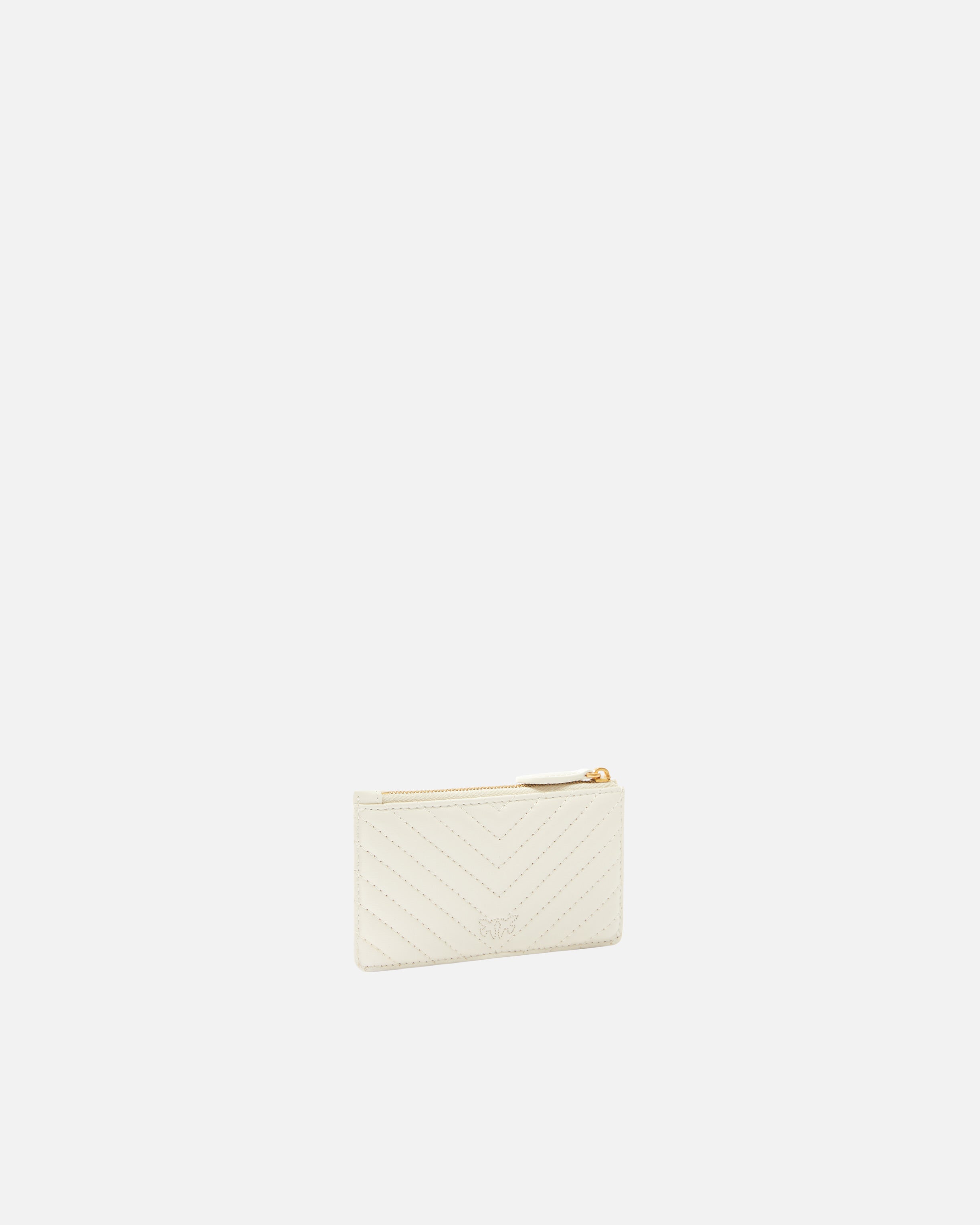 Porta carte di credito in nappa trapuntata con pattern chevron. Personalizzato con placca in metallo logo Love Birds Diamond Cut. L'interno è foderato in polycotton. Chiusura con zip.