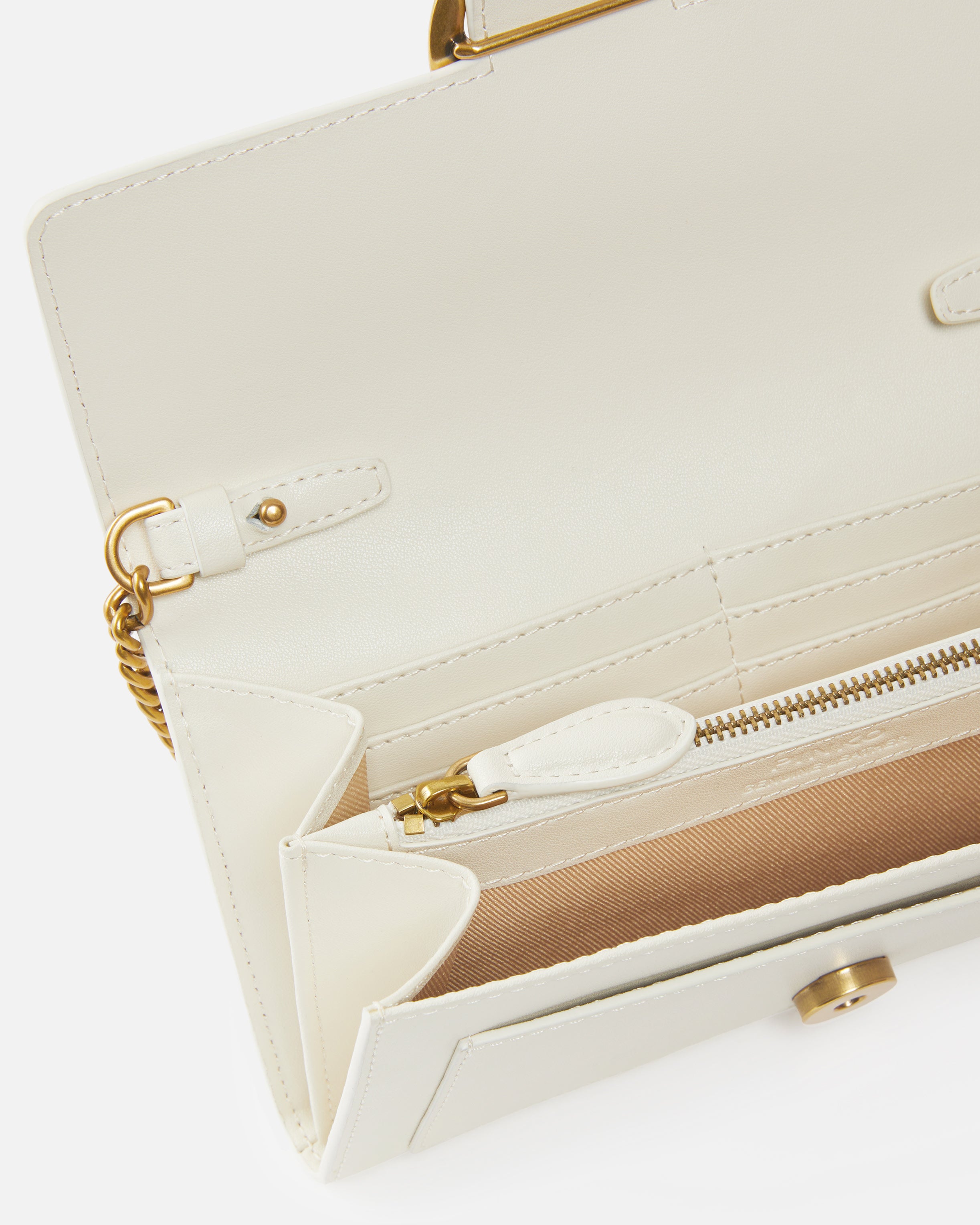 Portafoglio Love Bag a tracolla in morbida pelle mano seta. La chiusura con bottone nascosto è completata dall'iconica fibbia in metallo Love Birds Diamond Cut. L'interno è foderato in microfibra e comprende tramezza chiusa con zip e spazi per carte di credito. La tracolla metallica a catena rotonda permette di portare il portafoglio come una borsa crossbody, ed è rimovibile.