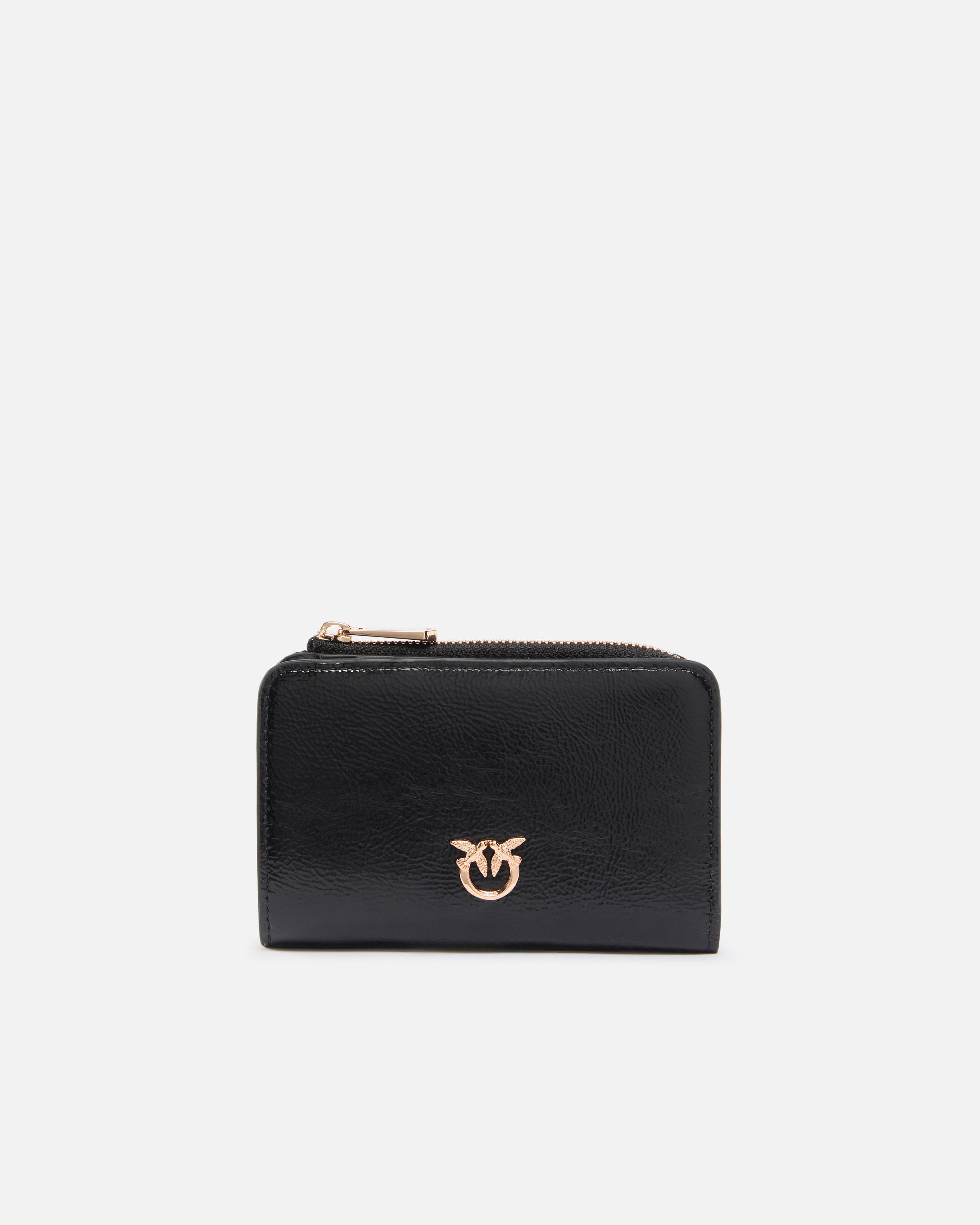 Portafoglio compatto e multifunzione di piccole dimensioni, dalla forma rettangolare, realizzato in pelle shiny effetto vintage. L'interno è ben organizzato con diversi vani per carte e documenti, mentre l'esterno è completato da uno scomparto portamonete chiuso con zip ed è personalizzato con una placchetta in metallo raffigurante l'iconico logo Love Birds Diamond Cut. Il portafoglio è chiuso con bottone interno, per mantenerne la forma compatta, perfetta anche per le borse più piccole. Attiva il tuo accessorio PINKO: verifica l'autenticità del tuo prodotto e accedi all'esperienza personalizzata avvicinando il tuo smartphone al ricamo Love Birds che trovi sul retro!