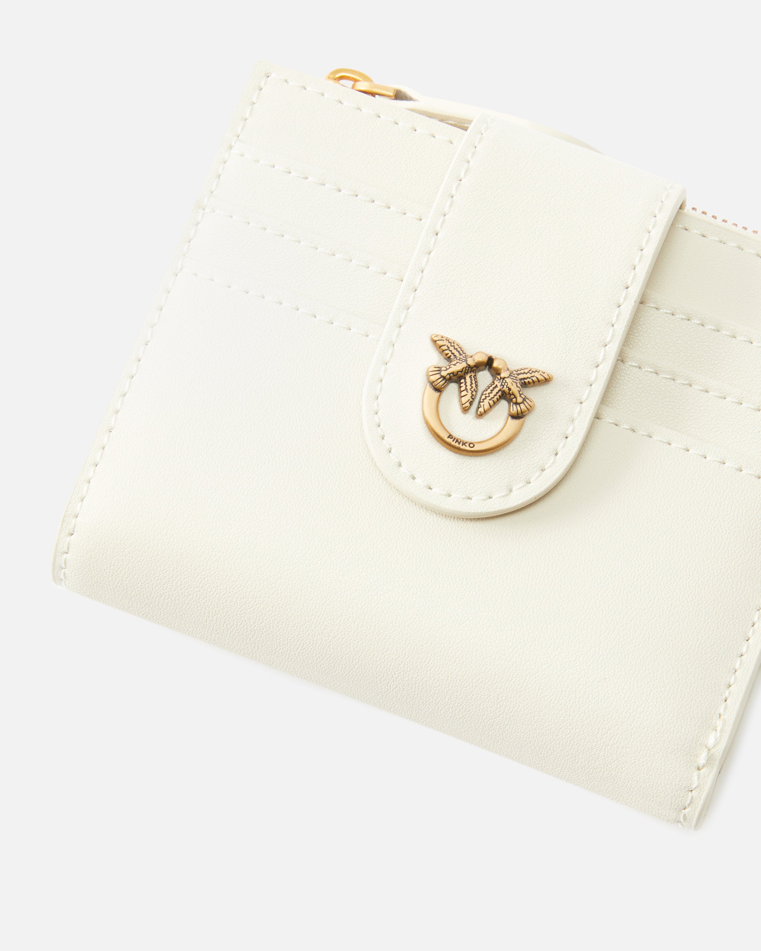 Piccolo portafoglio dalla forma squadrata in morbida pelle dalla particolare texture liscia che comprende numerosi spazi per carte di credito e documenti e una tasca portamonete chiusa con zip. La chiusura con piccola fascia è personalizzata con placchetta logo uccellini Love Birds in metallo, che aggiunge un tocco iconico a un accessorio da aggiungere alla tua borsa. Attiva il tuo accessorio PINKO: verifica l'autenticità del tuo prodotto e accedi all'esperienza personalizzata avvicinando il tuo smartphone al ricamo Love Birds che trovi sul retro!