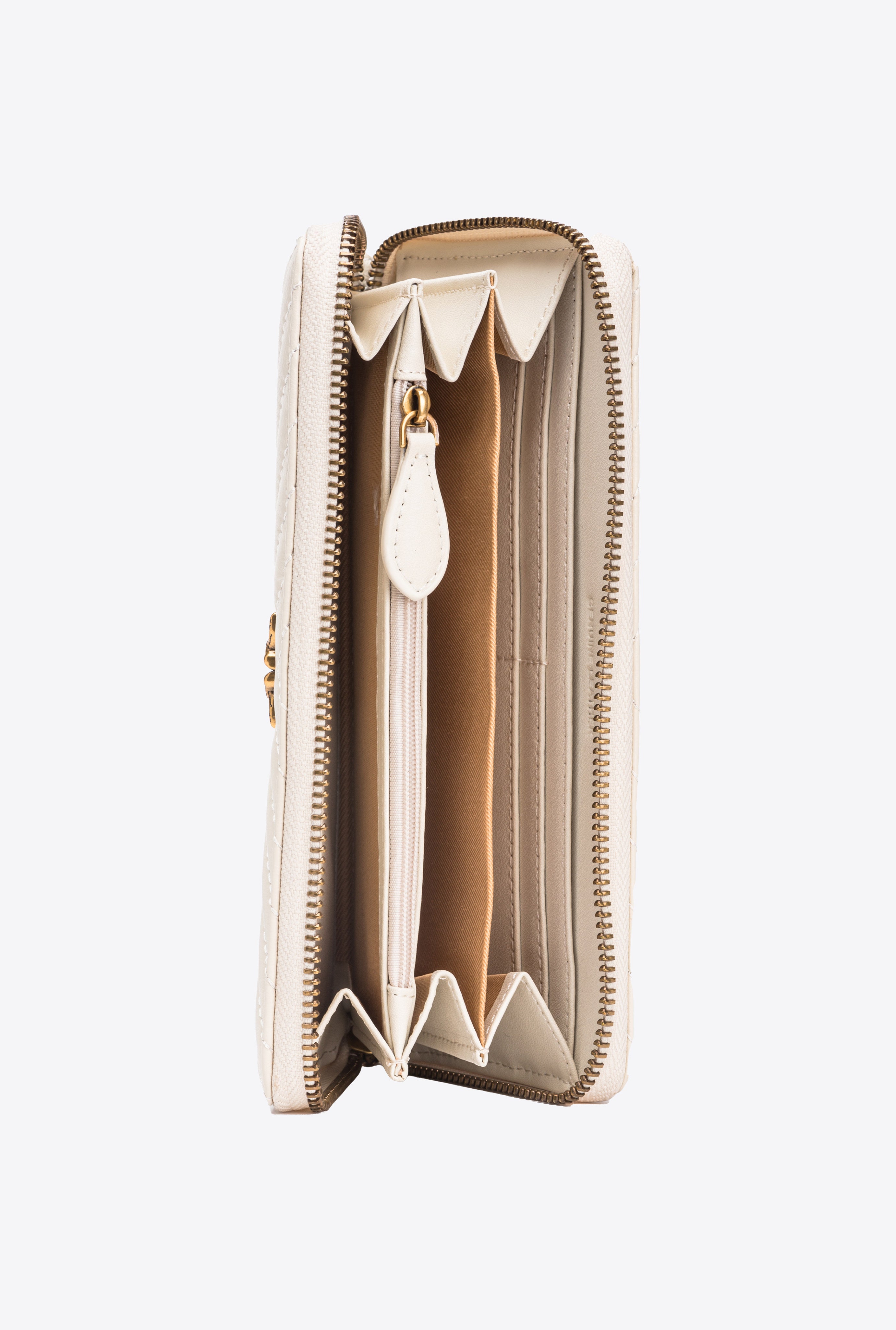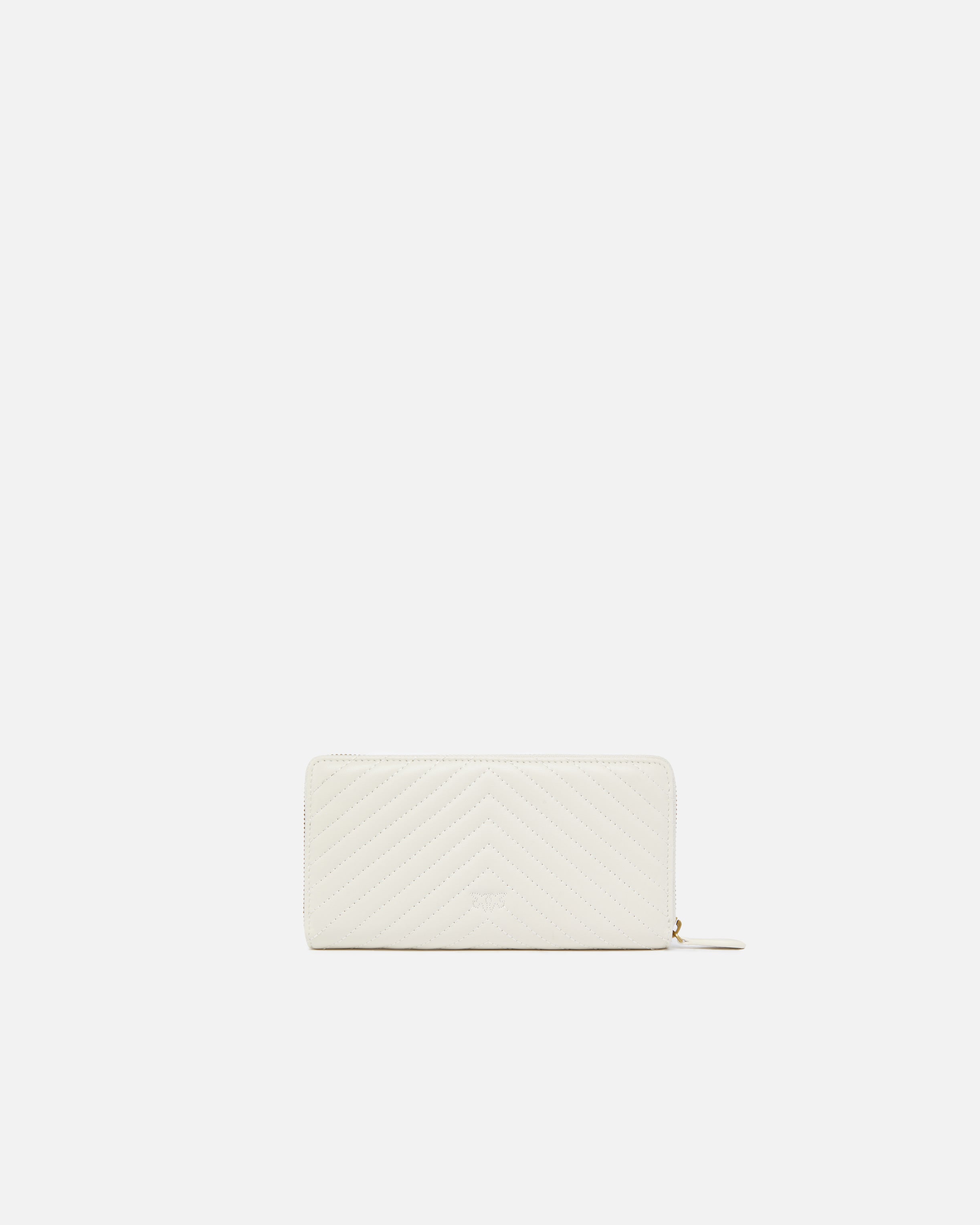 Portafoglio zip-around in nappa con trapuntatura pattern chevron personalizzato con placchetta Love Birds Diamond Cut su base in pelle. L'interno è foderato in microfibra ed è diviso in quattro scomparti, di cui uno chiuso con zip e due con spazi per carte di credito.