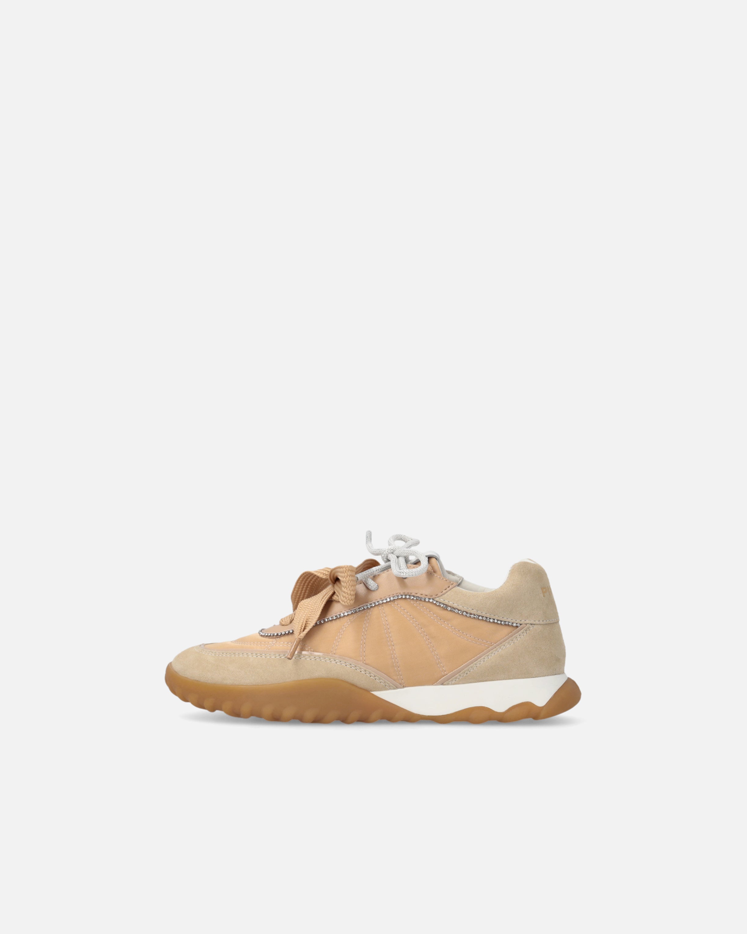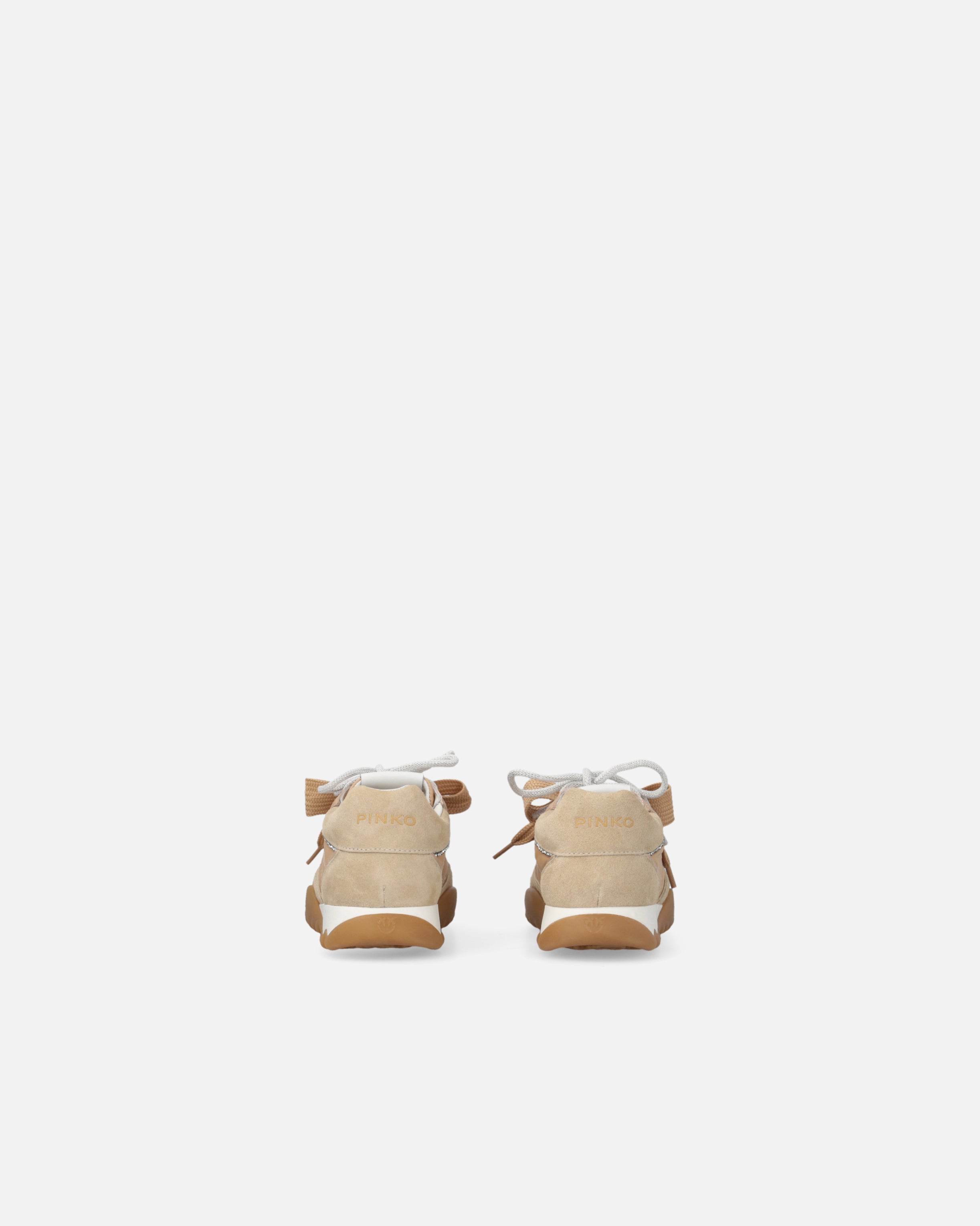 Sneakers in pelle scamosciata e tessuto tecnico rifinite da piping lucidi in tono sulla tomaia e un piping con mini borchie lungo tutta la mascherina. Oltre ai classici lacci piatti il modello è arricchito da una doppia versione di lacci: con dettagli grafici o con una finitura glitterata, per un sottile tocco di luminosità. Il logo lettering PINKO spicca sulla linguetta, mentre la confortevole suola bicolor in gomma è completata dal logo Love Birds all over in rilievo sul battistrada. Un modello ideale per chi ama distinguersi con stile senza rinunciare alla praticità. - GEA 02