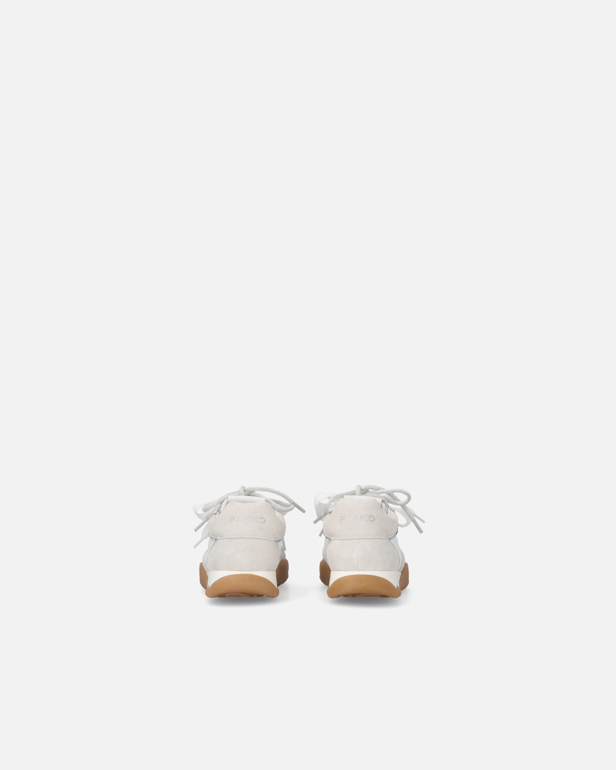 Sneakers in pelle scamosciata e tessuto tecnico rifinite da piping lucidi in tono sulla tomaia e un piping con mini borchie lungo tutta la mascherina. Oltre ai classici lacci piatti il modello è arricchito da una doppia versione di lacci: con dettagli grafici o con una finitura glitterata, per un sottile tocco di luminosità. Il logo lettering PINKO spicca sulla linguetta, mentre la confortevole suola bicolor in gomma è completata dal logo Love Birds all over in rilievo sul battistrada. Un modello ideale per chi ama distinguersi con stile senza rinunciare alla praticità. - GEA 02