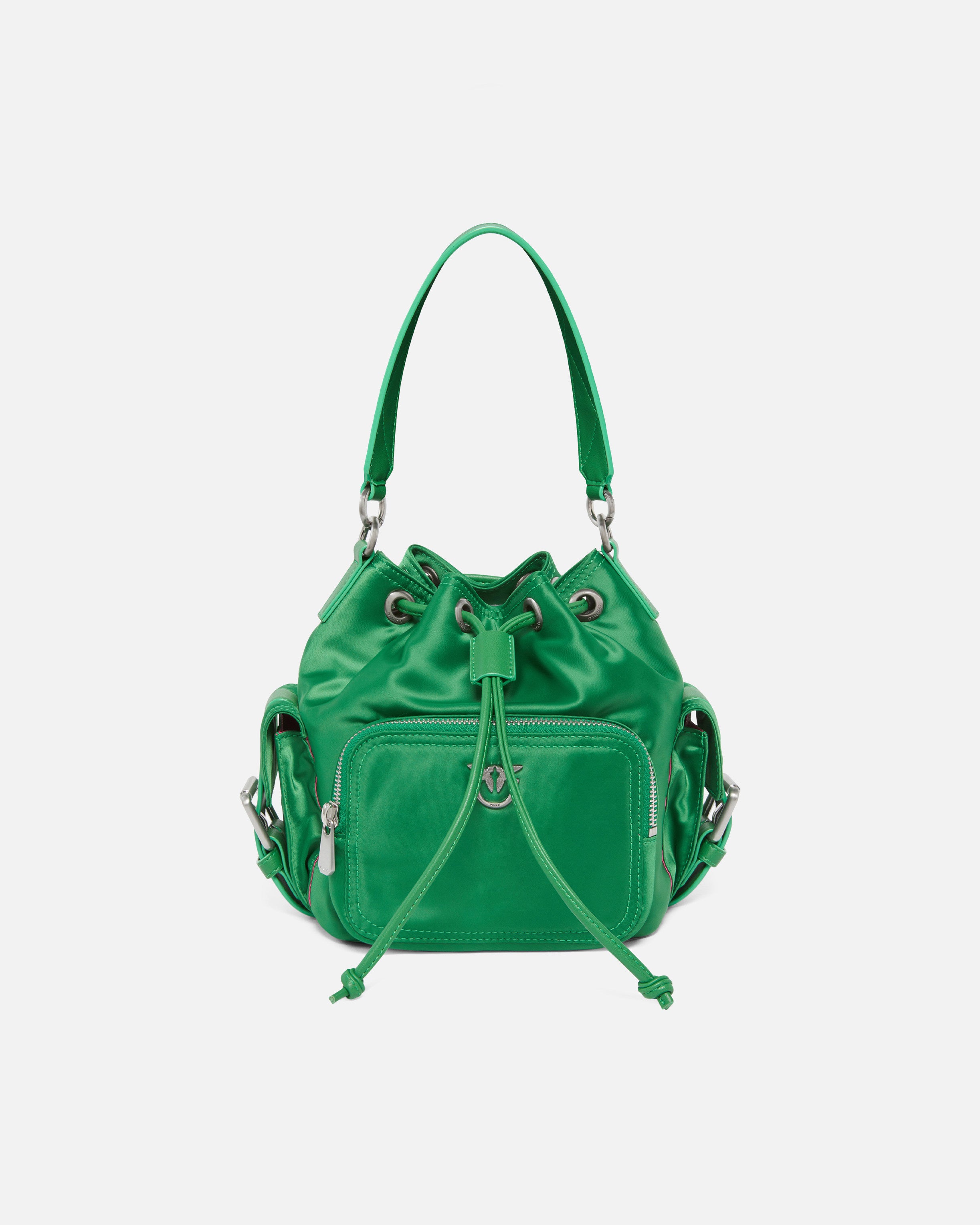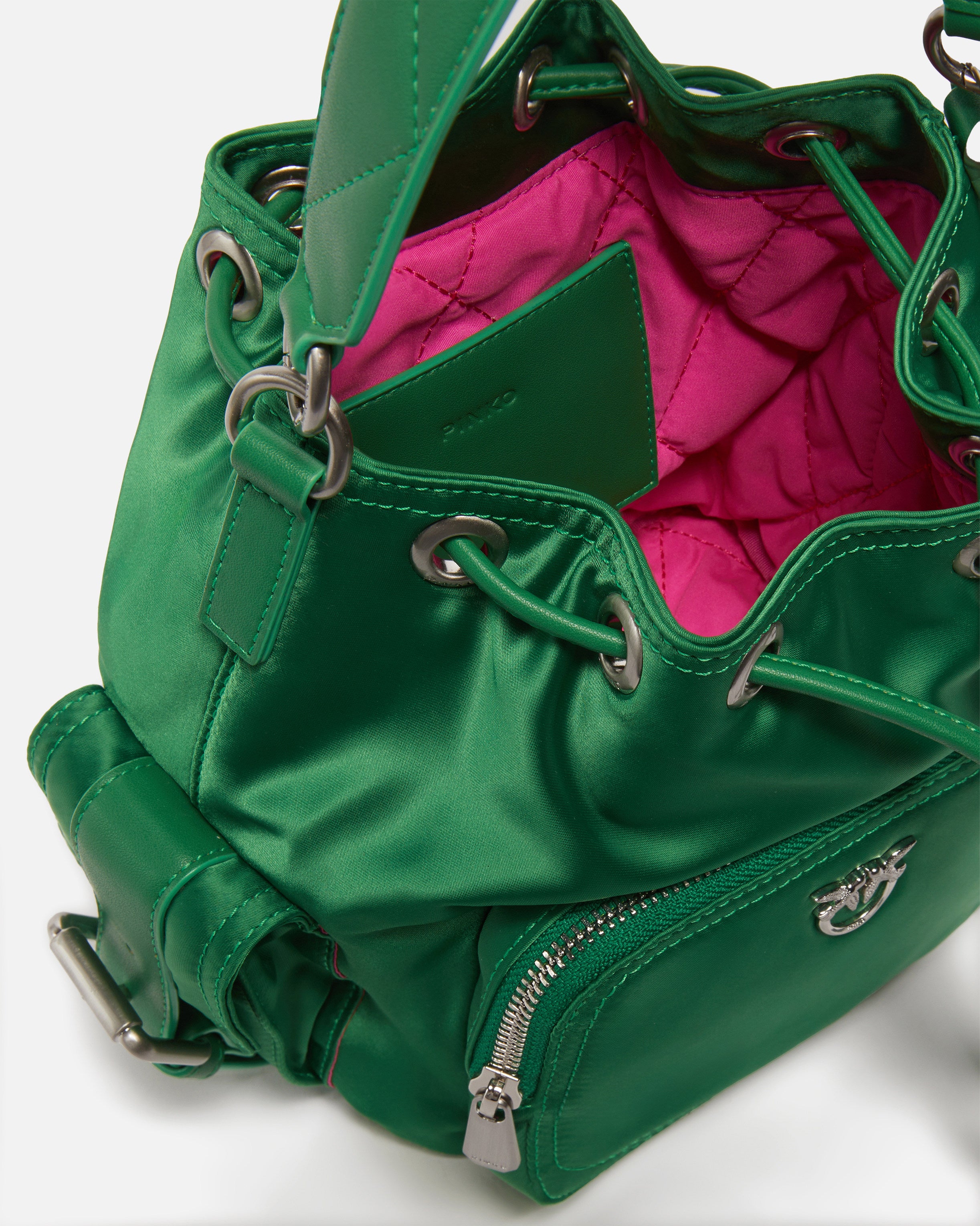 Borsetta a tracolla dalla classica forma a secchiello realizzata in resistente satin di nylon dal raffinato effetto lucido. Il mini secchiello è caratterizzato da due tasche a soffietto laterali con patta e fibbia e una tasca frontale con zip impreziosita dal logo Love Birds Diamond Cut. Il modello è dotato di una chiusura superiore con coulisse regolabile, e di un manico e una tracolla rimovibili e intercambiabili per una doppia portabilità: a spalla o crossbody. L'interno della borsetta, foderato in tessuto tecnico e sapientemente trapuntato, presenta una targhetta con logo lettering PINKO impresso. Attiva la tua borsa PINKO: verifica l'autenticità del tuo prodotto e accedi all'esperienza personalizzata avvicinando il tuo smartphone al ricamo Love Birds che trovi sul retro della borsa!