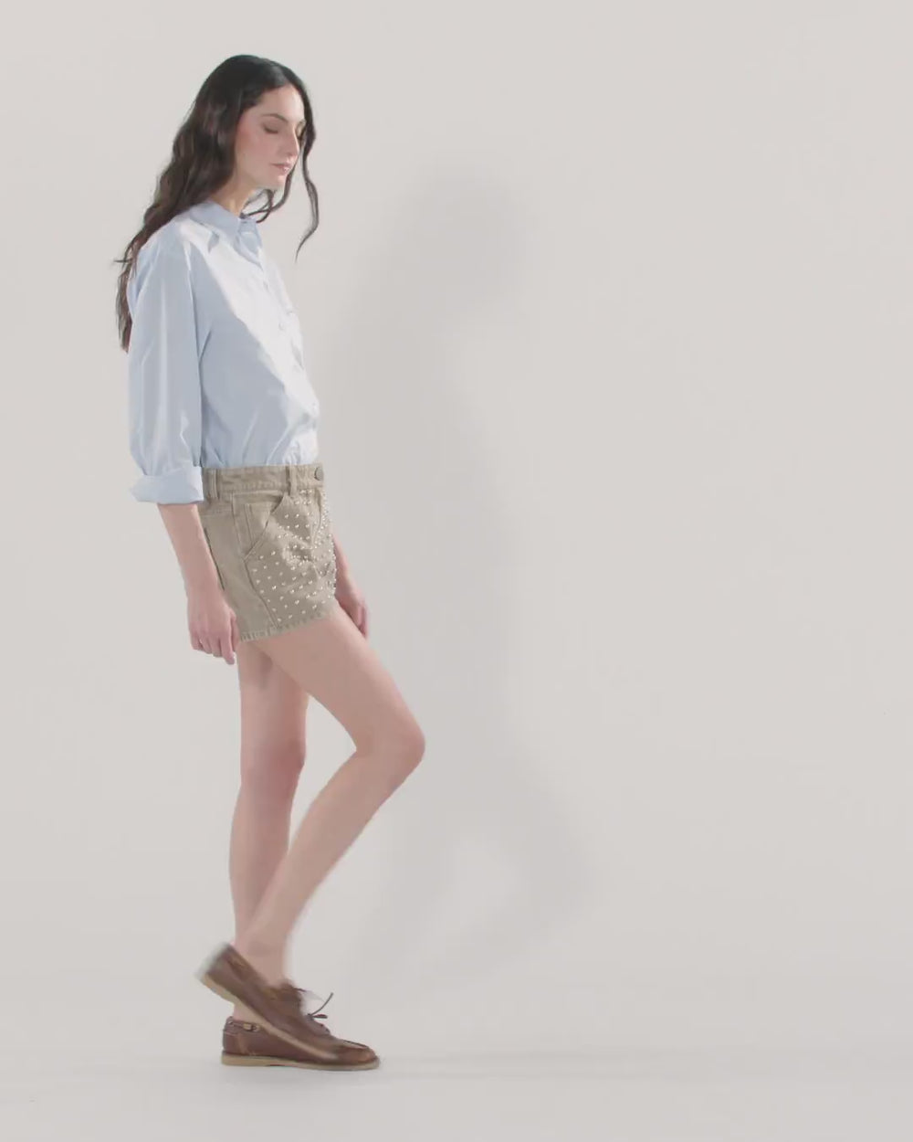 Shorts cinque tasche realizzati in denim marrone di misto cotone dall'effetto scolorito per un raffinato stile used. Il modello, dotato di una comoda chiusura frontale con zip nascosta e bottone visibile, è impreziosito da una pioggia di luminose borchie tonde che ricoprono tutta la parte frontale. Il perfetto connubio di praticità e glamour rende questi shorts un capo irrinunciabile per chi ama distinguersi con audacia anche nei look di tutti i giorni.