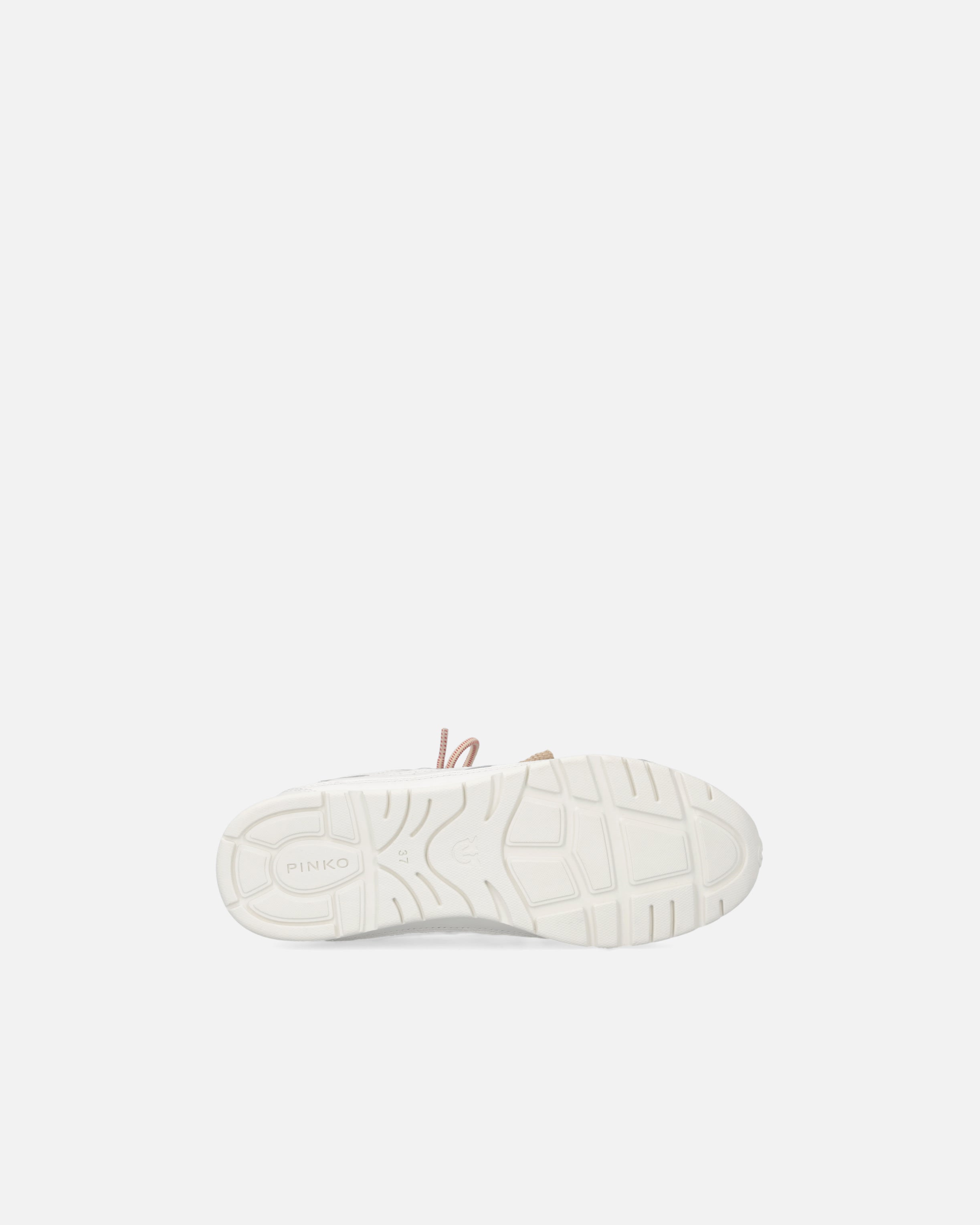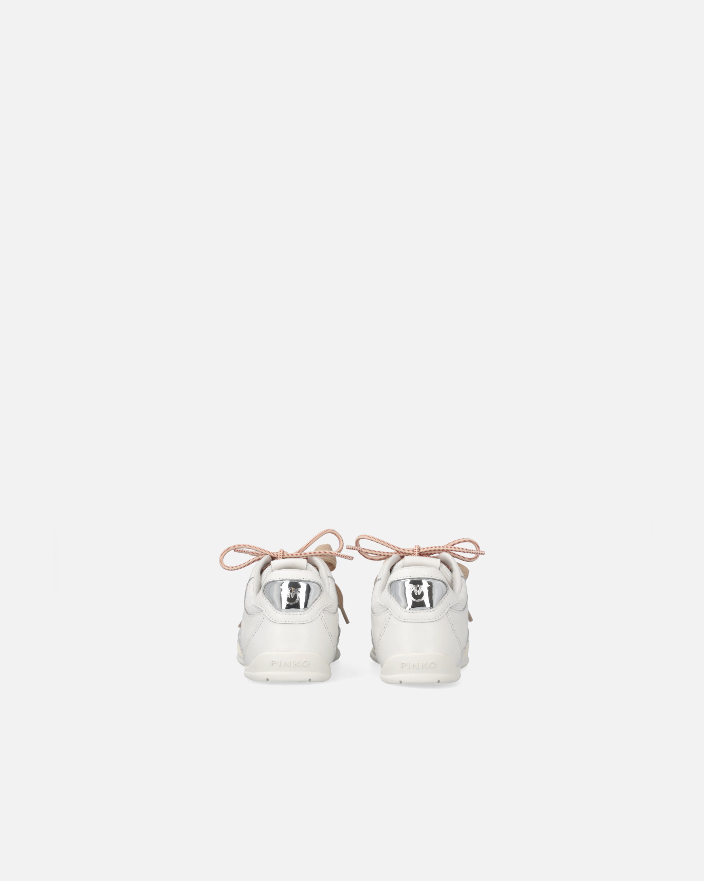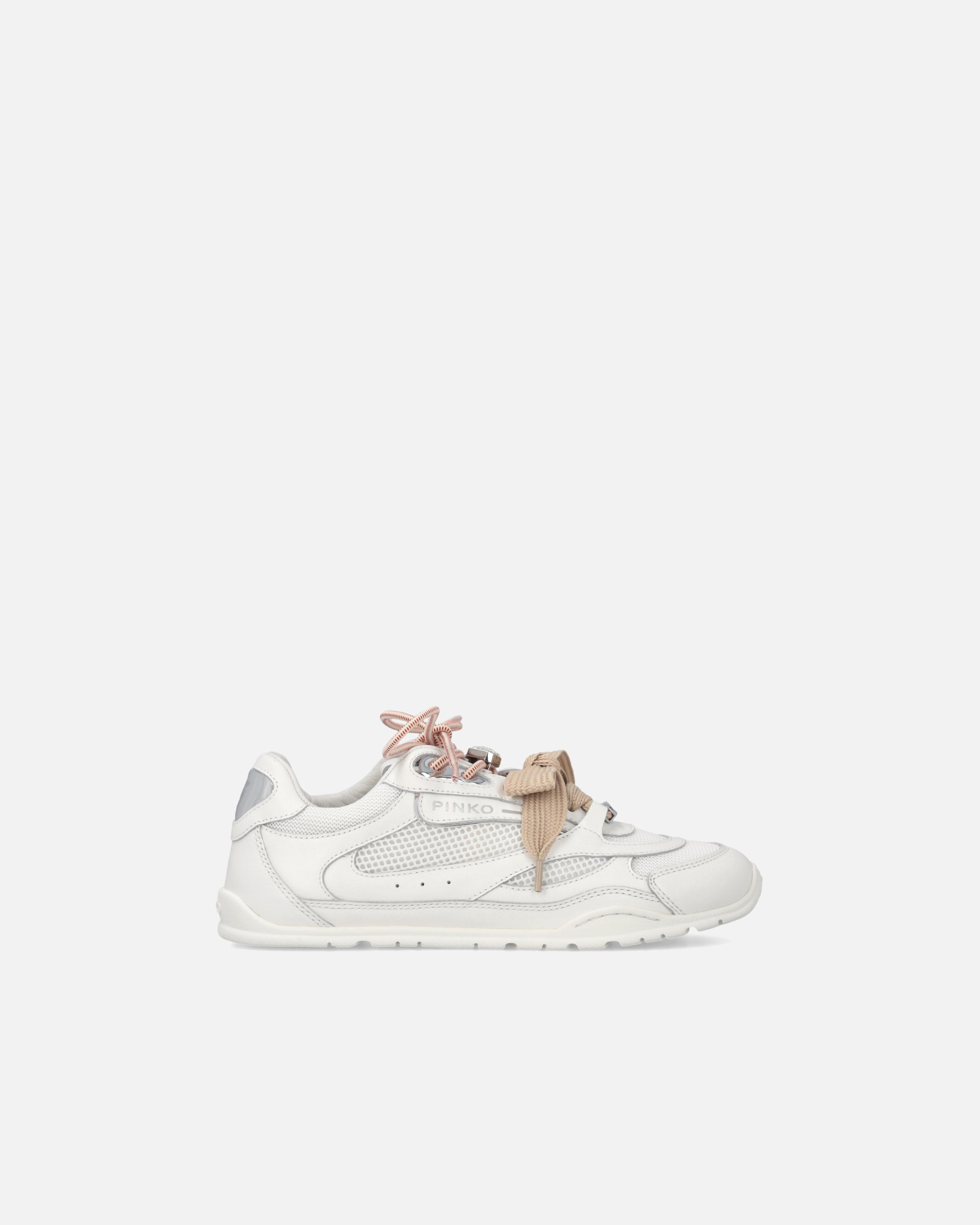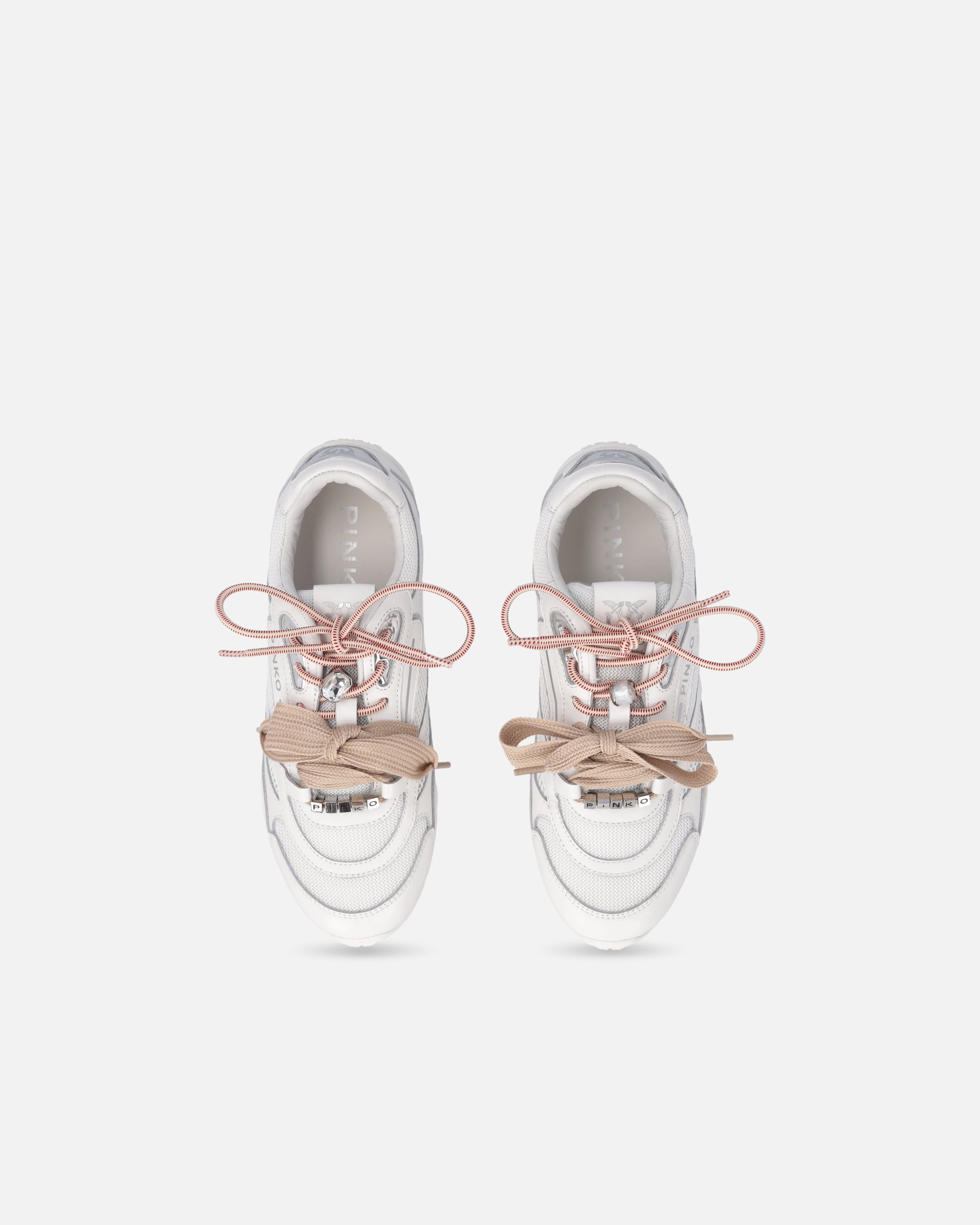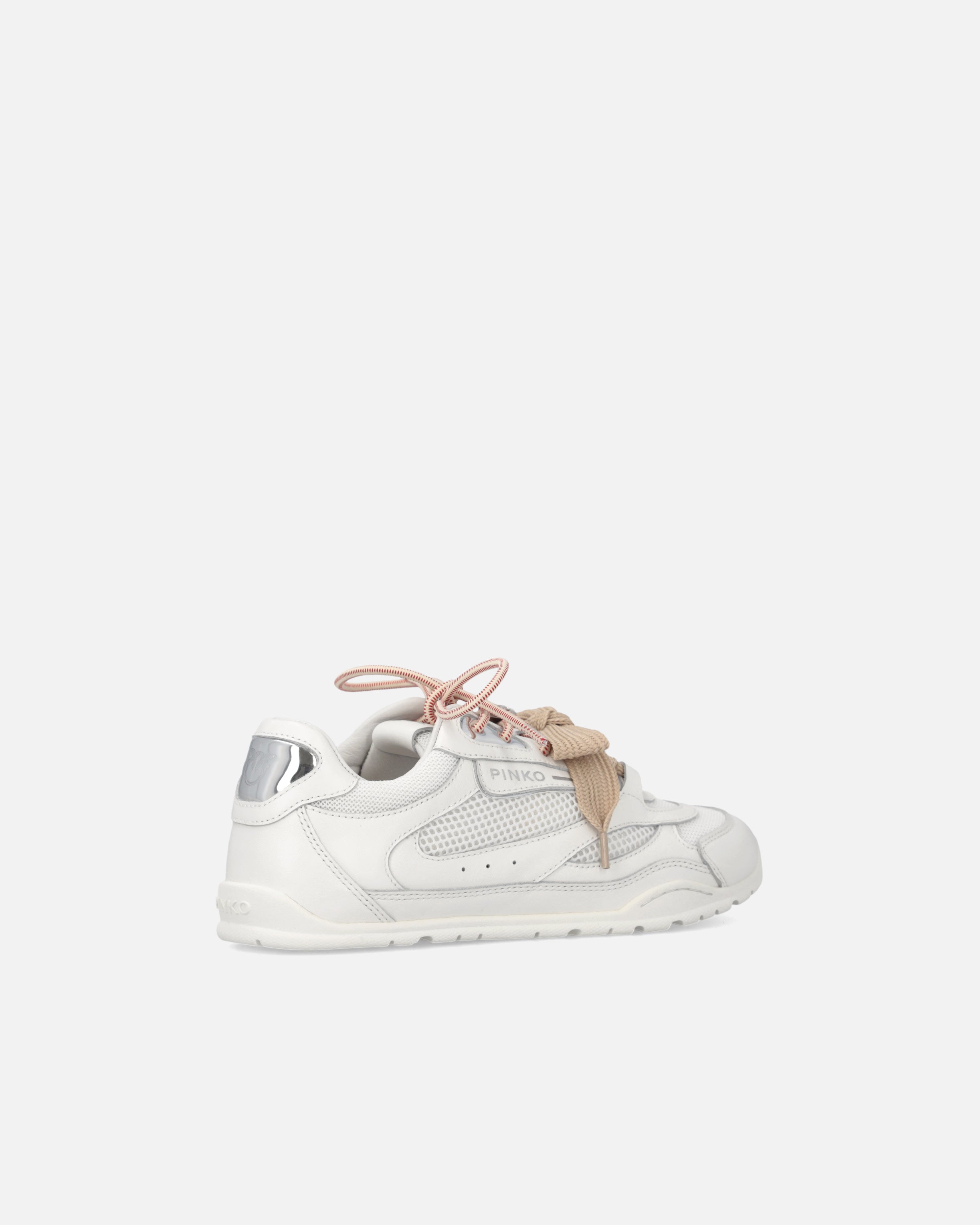 Scarpa da ginnastica realizzata in mesh con inserti in pelle, caratterizzata da doppi lacci di forma e colore diversi per un raffinato contrasto. Il logo con gli uccellini Love Birds rifinisce la linguetta e il tallone dall'effetto specchiato, mentre l'iconico logo lettering PINKO figura sugli anelli metallici che arricchiscono i lacci sul davanti. I lacci superiori, con dettagli grafici, sono completati da un brillante gioiello incastonato su una scarpa e da un charm dall'effetto marmorizzato sull'altra. Al suo interno, il modello presenta un fussbett da 10 mm in latex per un’ammortizzazione perfetta, mentre la comoda suola in gomma assicura grip. Reinterpretazione contemporanea di un classico del guardaroba sportivo, queste sneakers donano un tocco glam in puro stile PINKO a qualsiasi outfit casual.