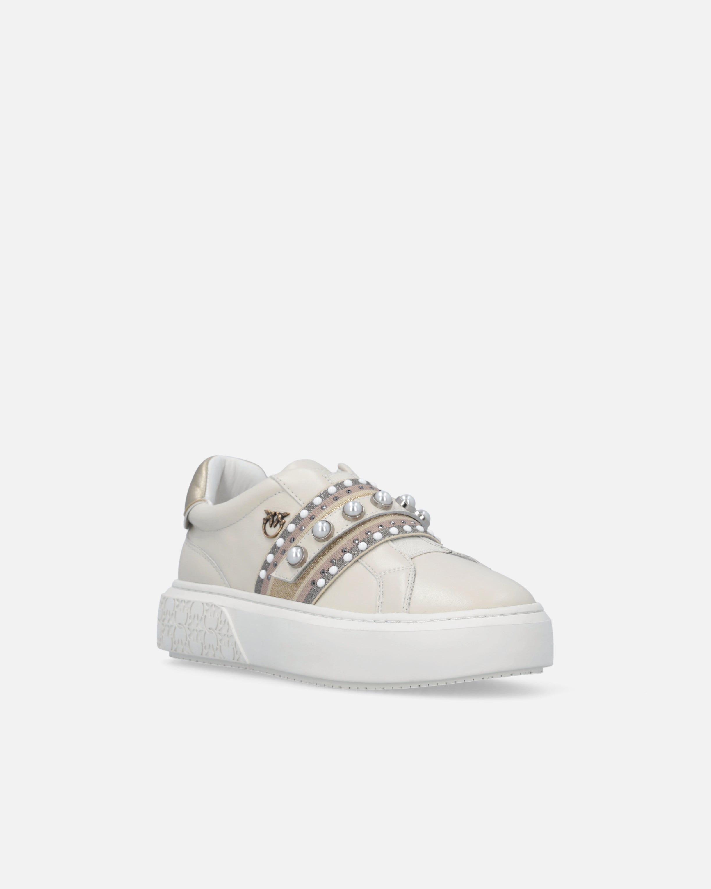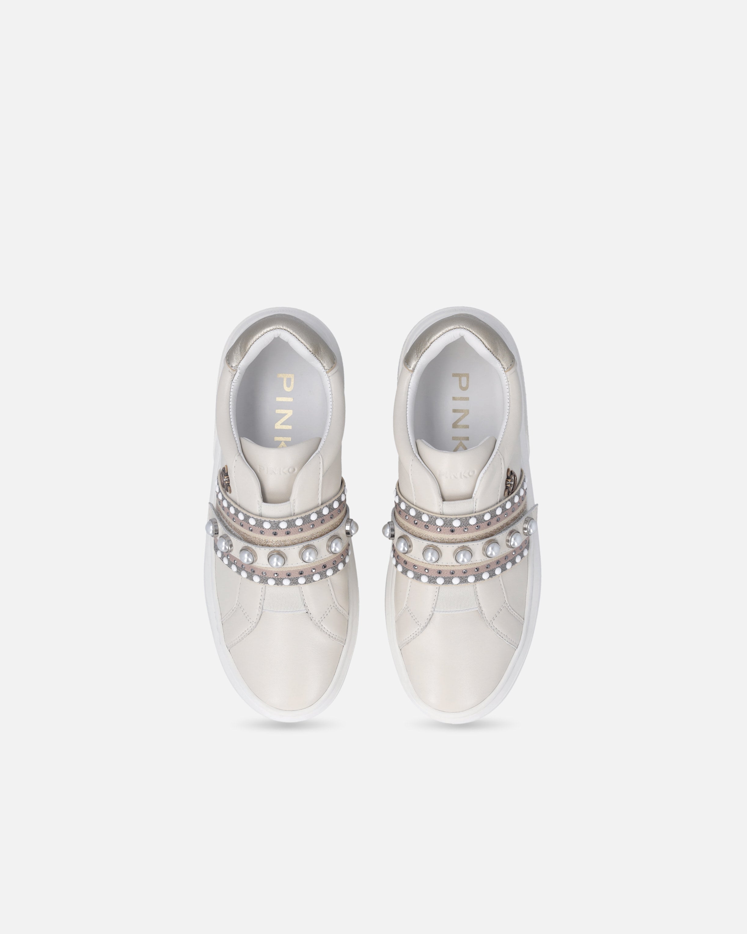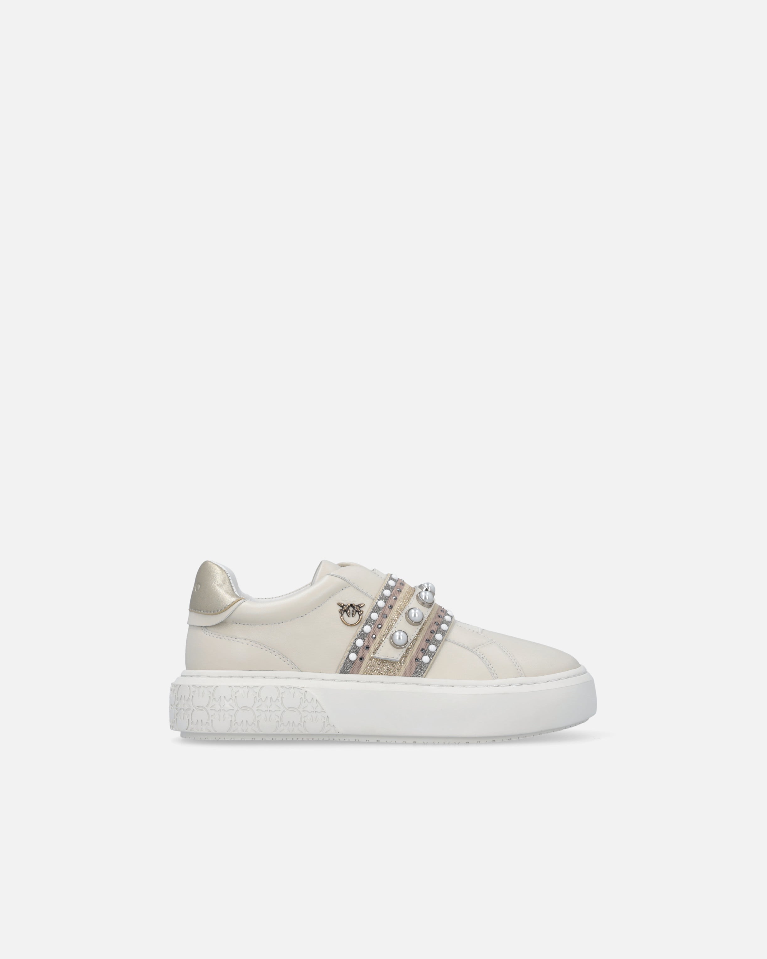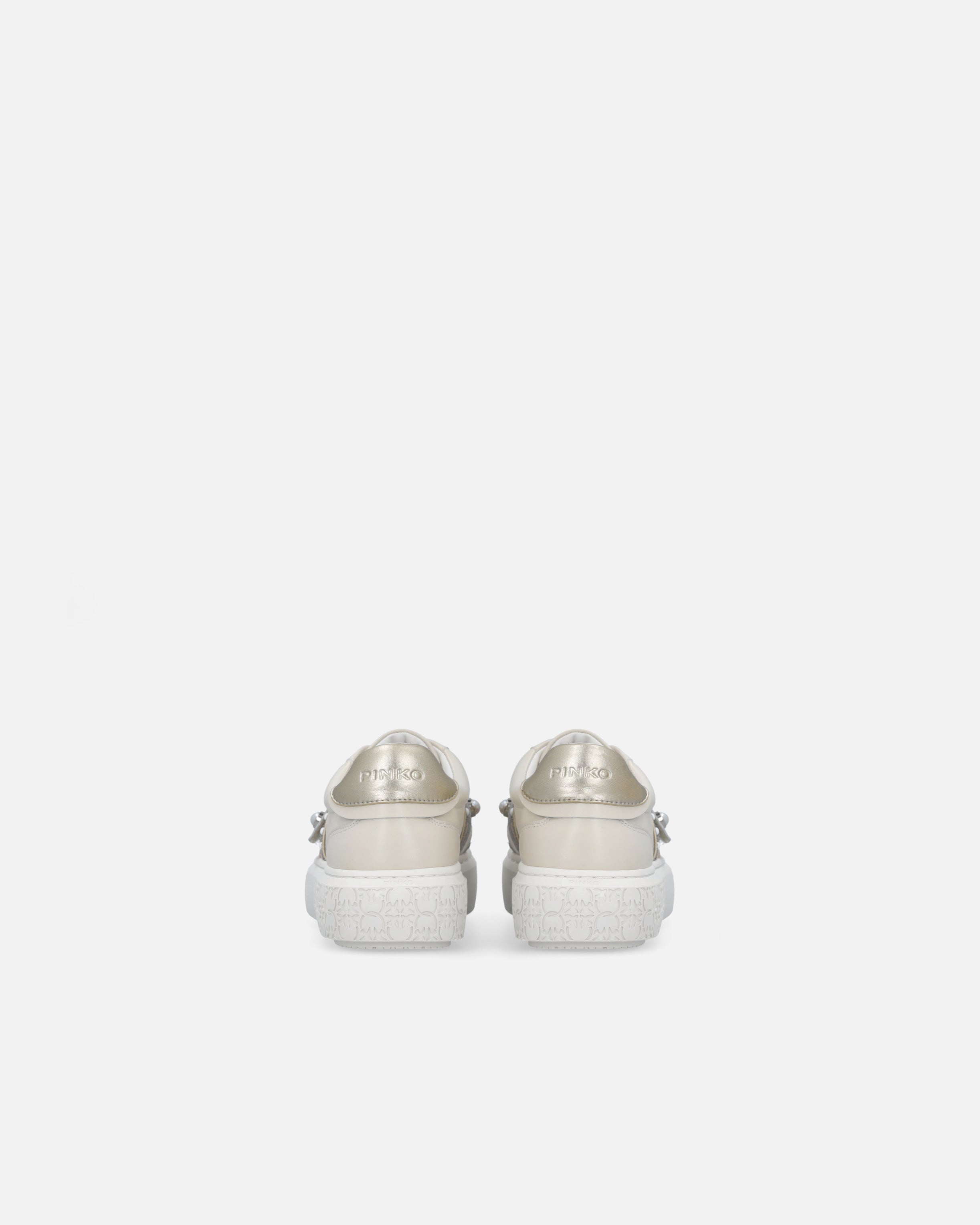 Sneakers modello slip-on realizzate in pelle effetto spalmato e dotate di suola platform in gomma alta 4,5 cm. Il punto focale della scarpa è rappresentato dalla banda superiore in tessuto rigato, impreziosita da dettagli gioiello e tocchi in filo metallizzato che donano luminosità. La tomaia è completata inoltre dalla piccola placca con logo Love Birds e dal logo lettering PINKO che spicca sulla linguetta, sul retro laminato e sulla soletta interna, mentre i lati della suola sono arricchiti dal monogramma con logo Love Birds. Queste sneakers sono destinate a diventare un caposaldo dei tuoi look casual da giorno e non solo, sei d'accordo?