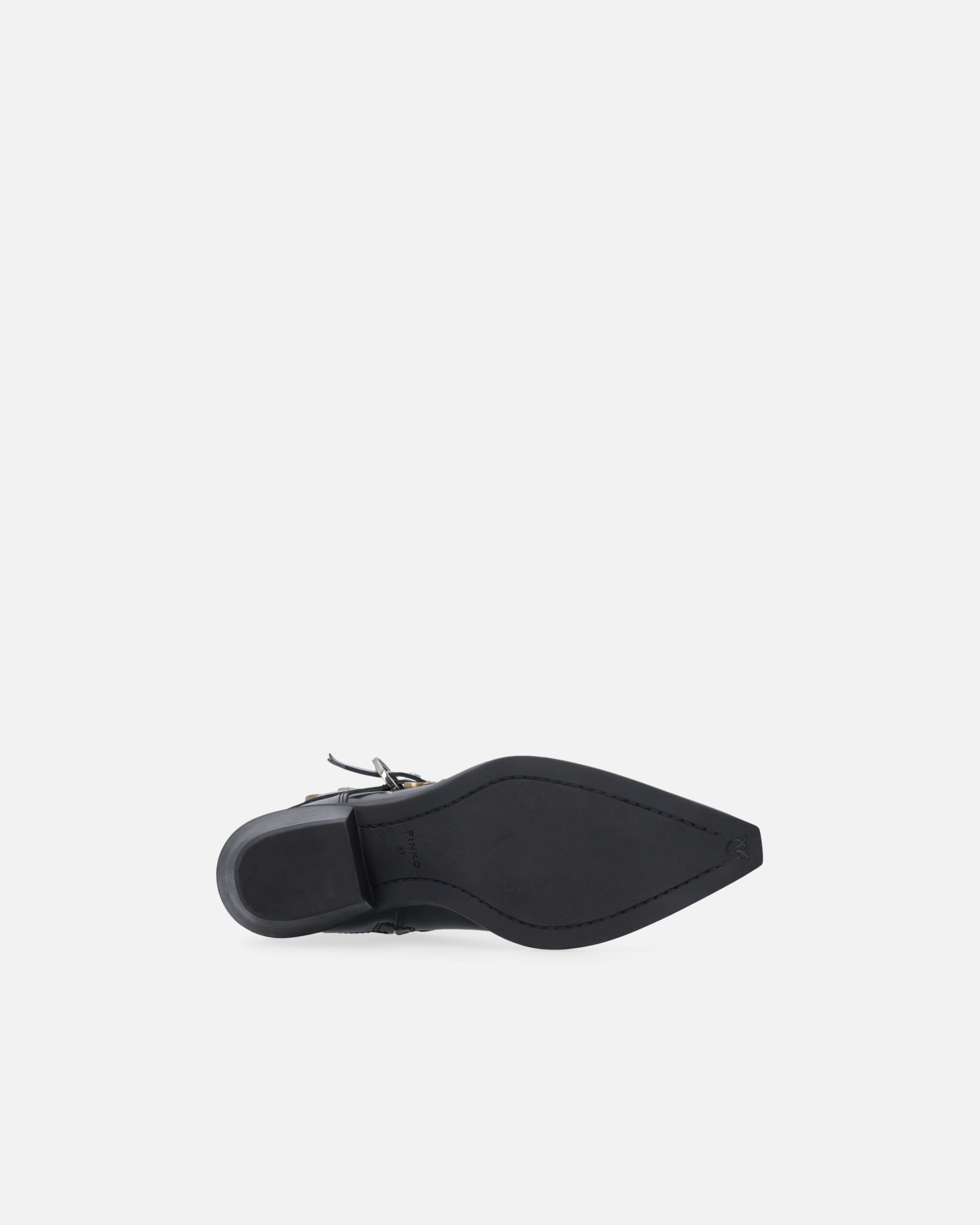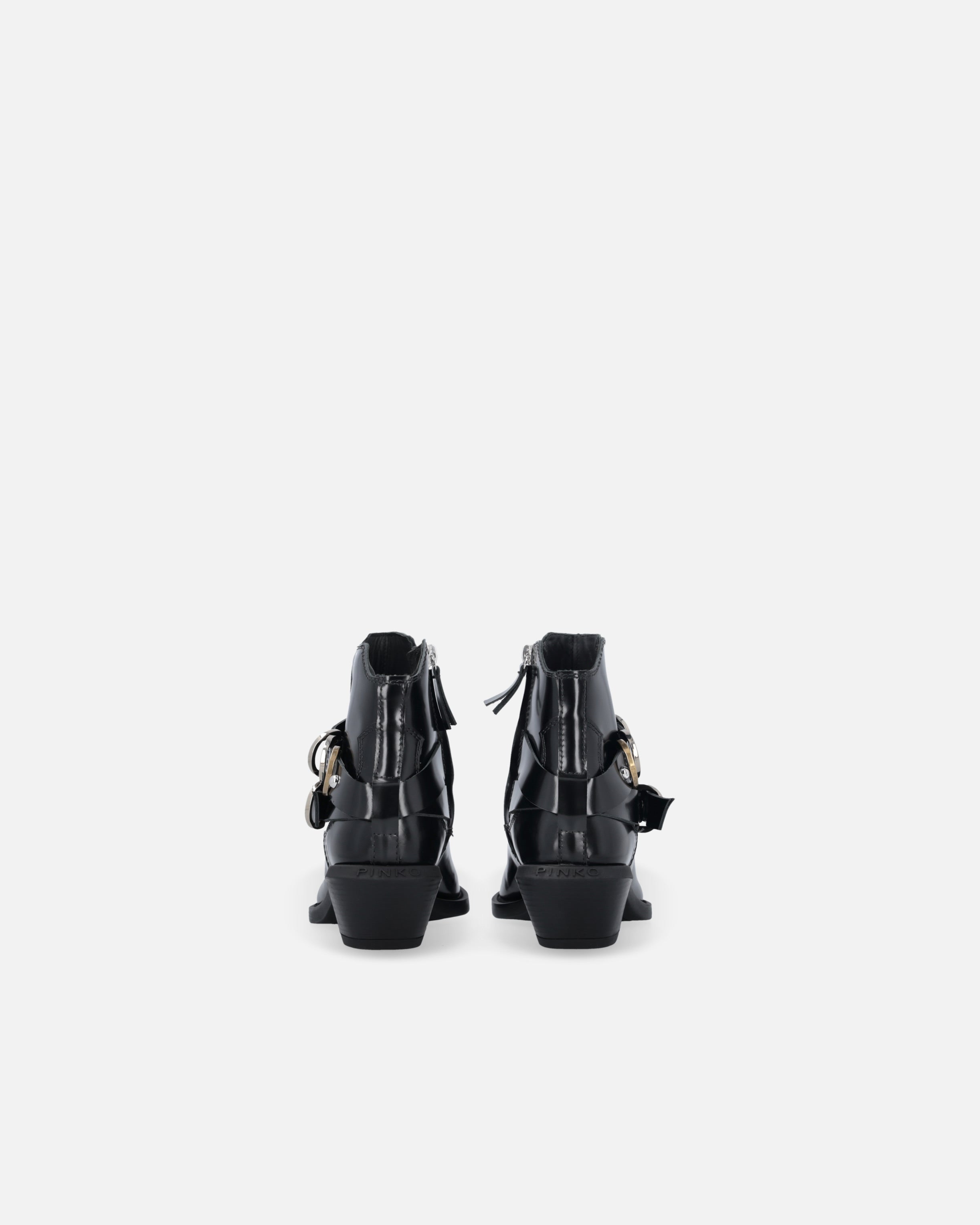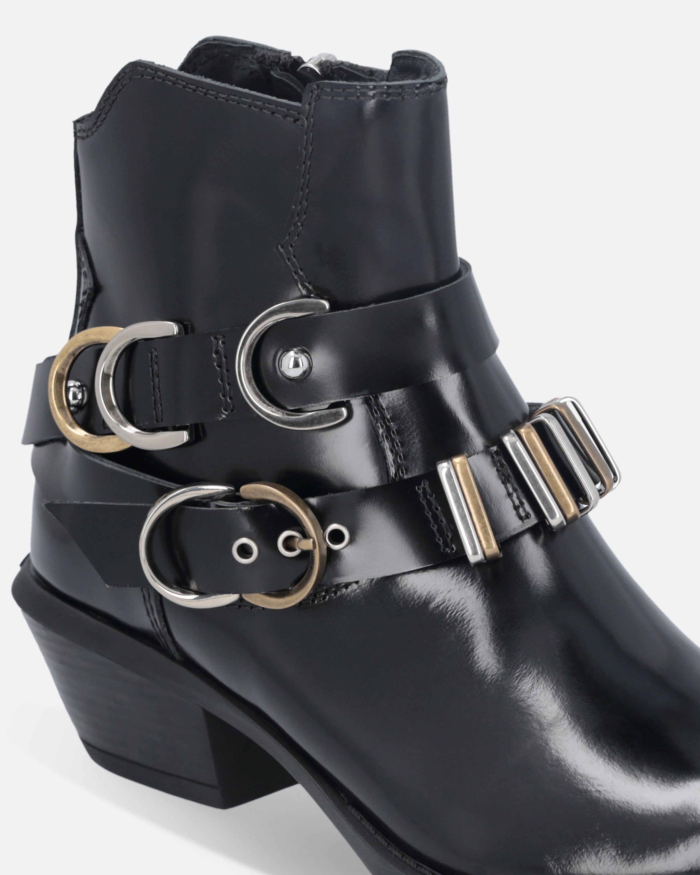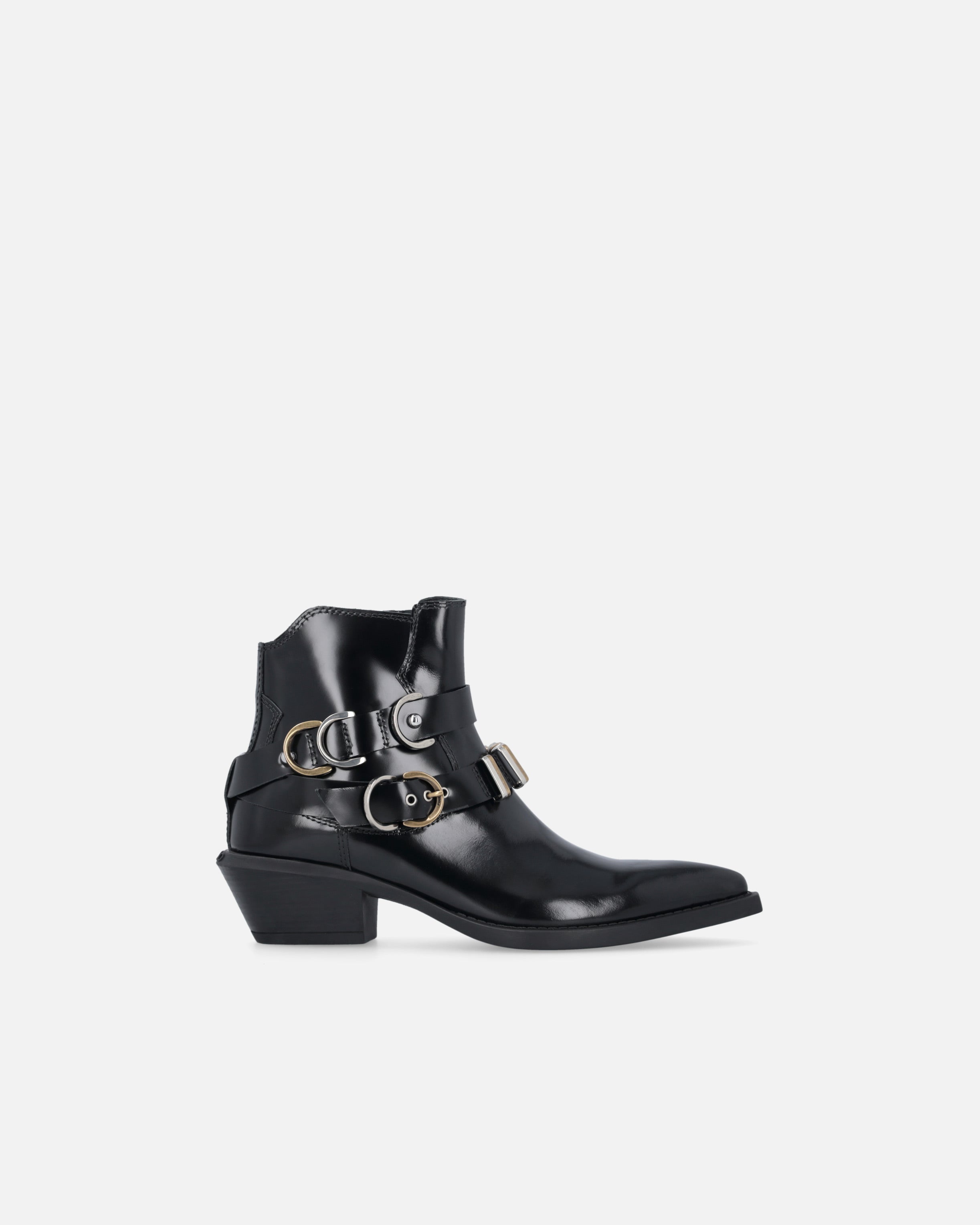 Stivaletto texano alla caviglia realizzato in pregiata pelle liscia, poggiato su un tacco largo alto 5 cm. Questo modello, dotato di due cinturini, è un tripudio di forme geometriche e mix di galvaniche: borchie e passanti di diverse altezze vengono sapientemente alternati creando un effetto dinamico. La suola in pura gomma garantisce eccellente isolamento termico, offrendo massimo comfort e durata. Sappiamo bene che sono i dettagli a fare la differenza: scegli questo modello per aggiungere un tocco di unicità ai tuoi look casual.