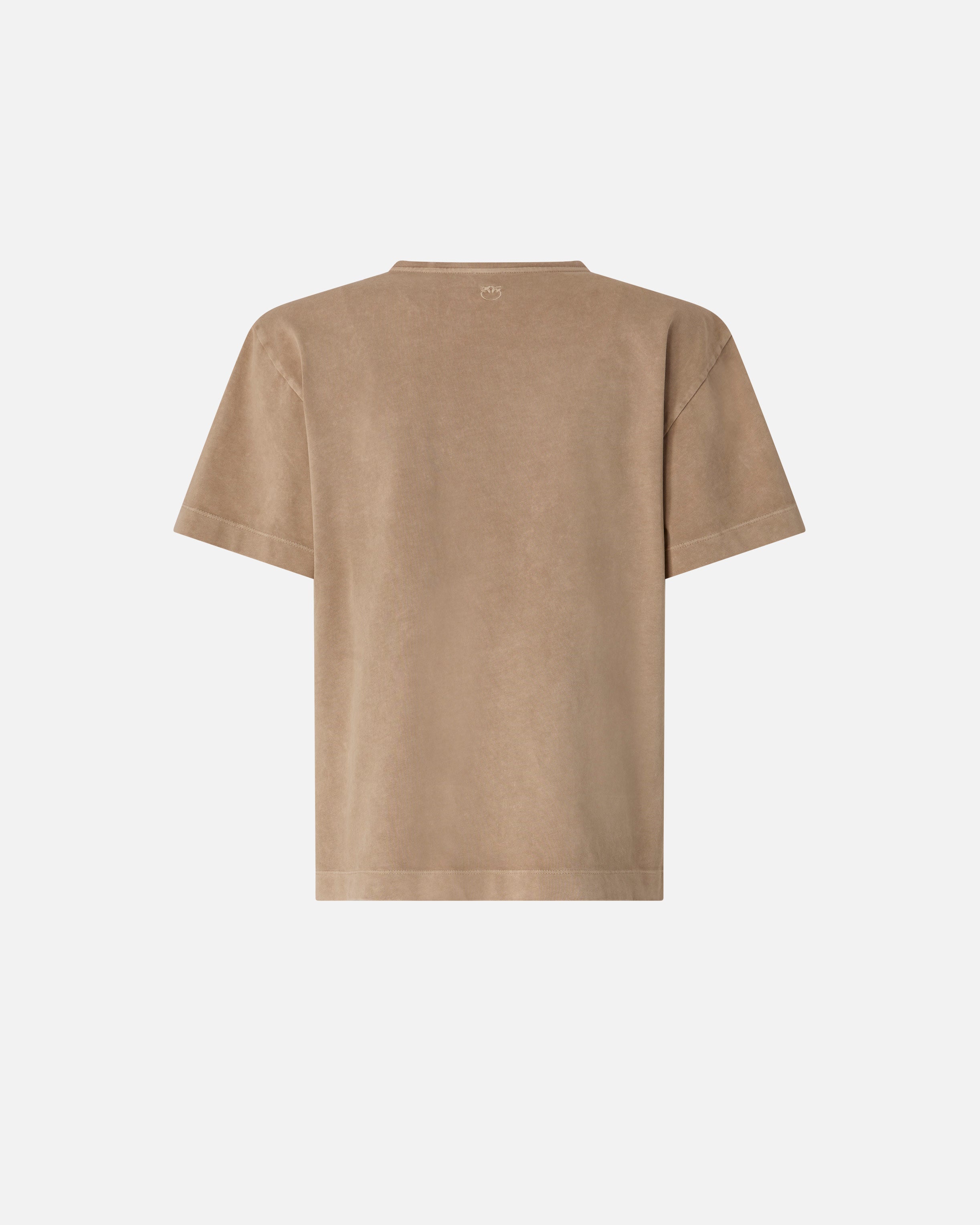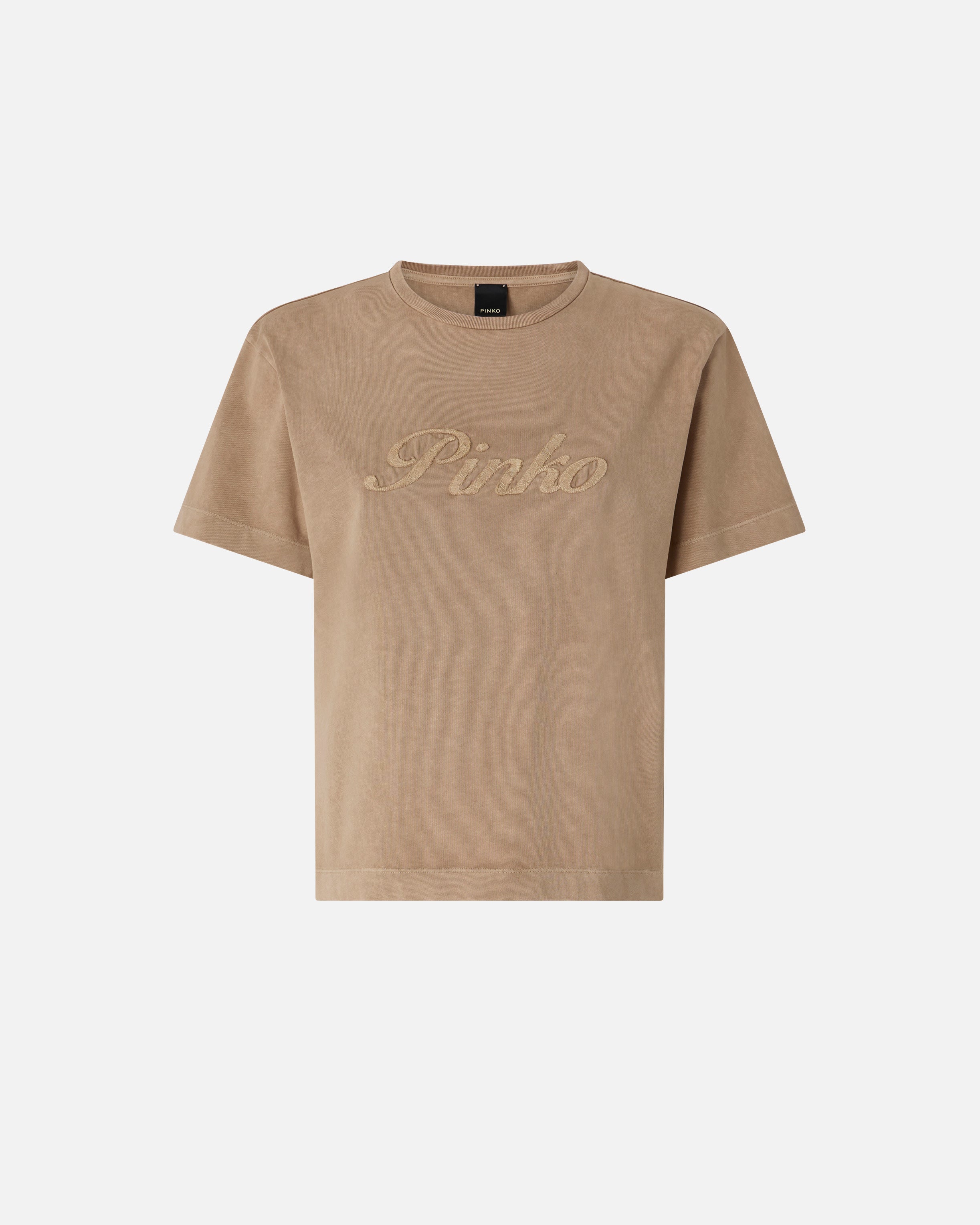 T-shirt girocollo a maniche corte realizzata in morbido jersey di cotone. Il capo è caratterizzato da un effetto leggermente marmorizzato all over e dal ricamo frontale in tono con logo lettering PINKO in versione distressed. Un modello essenziale del guardaroba femminile, perfetto per costruire look estivi casual e contemporanei.