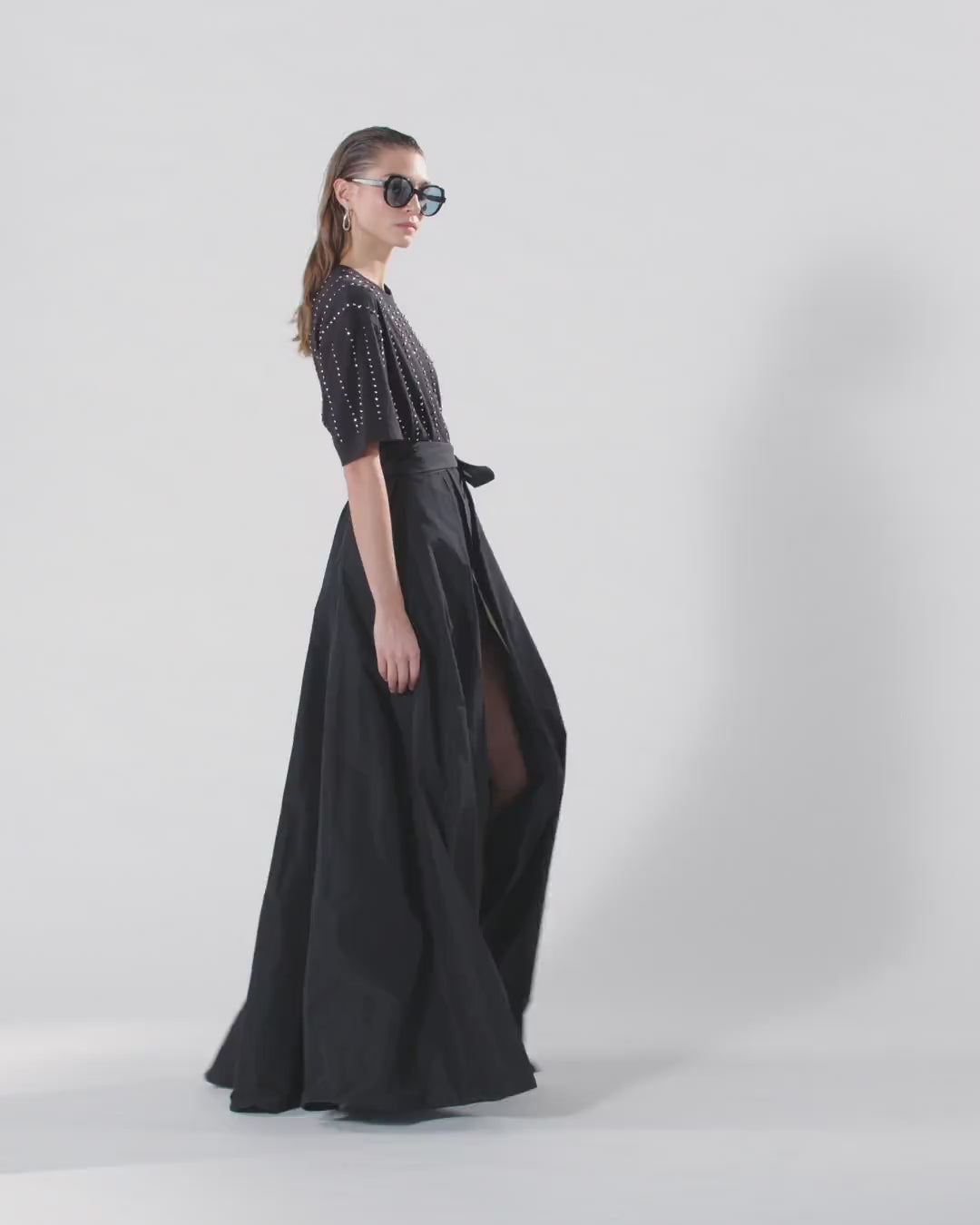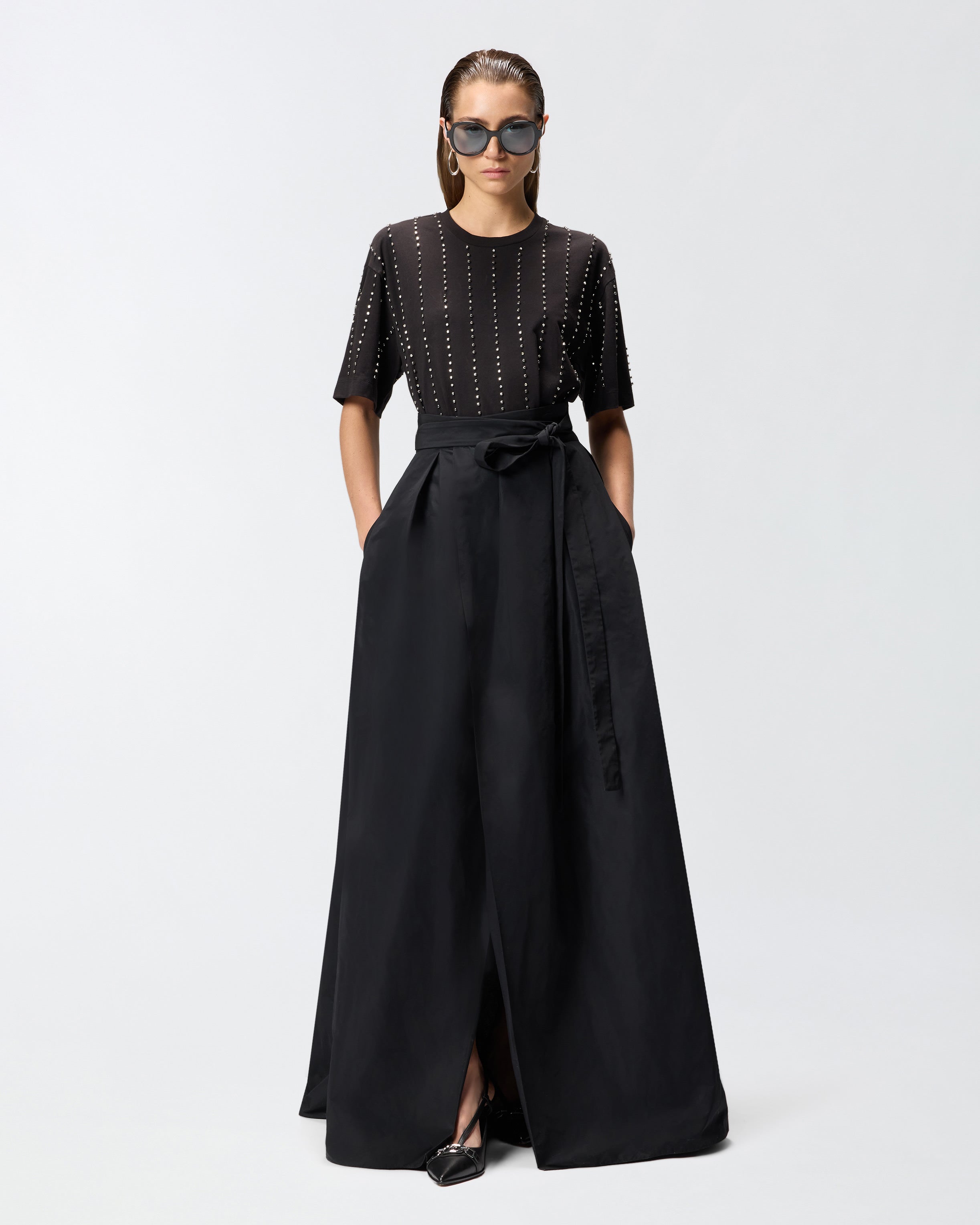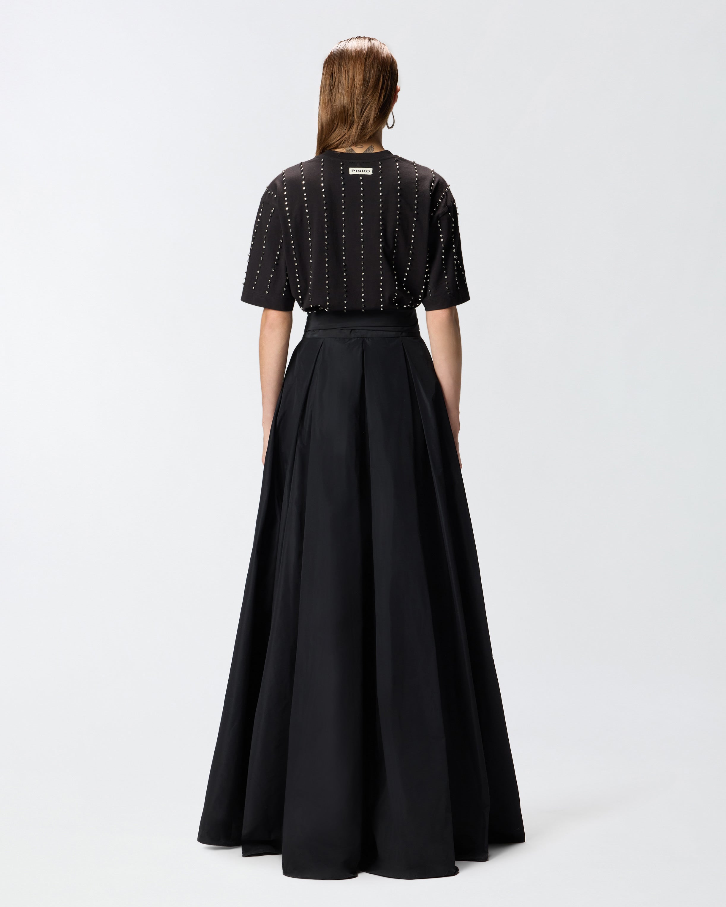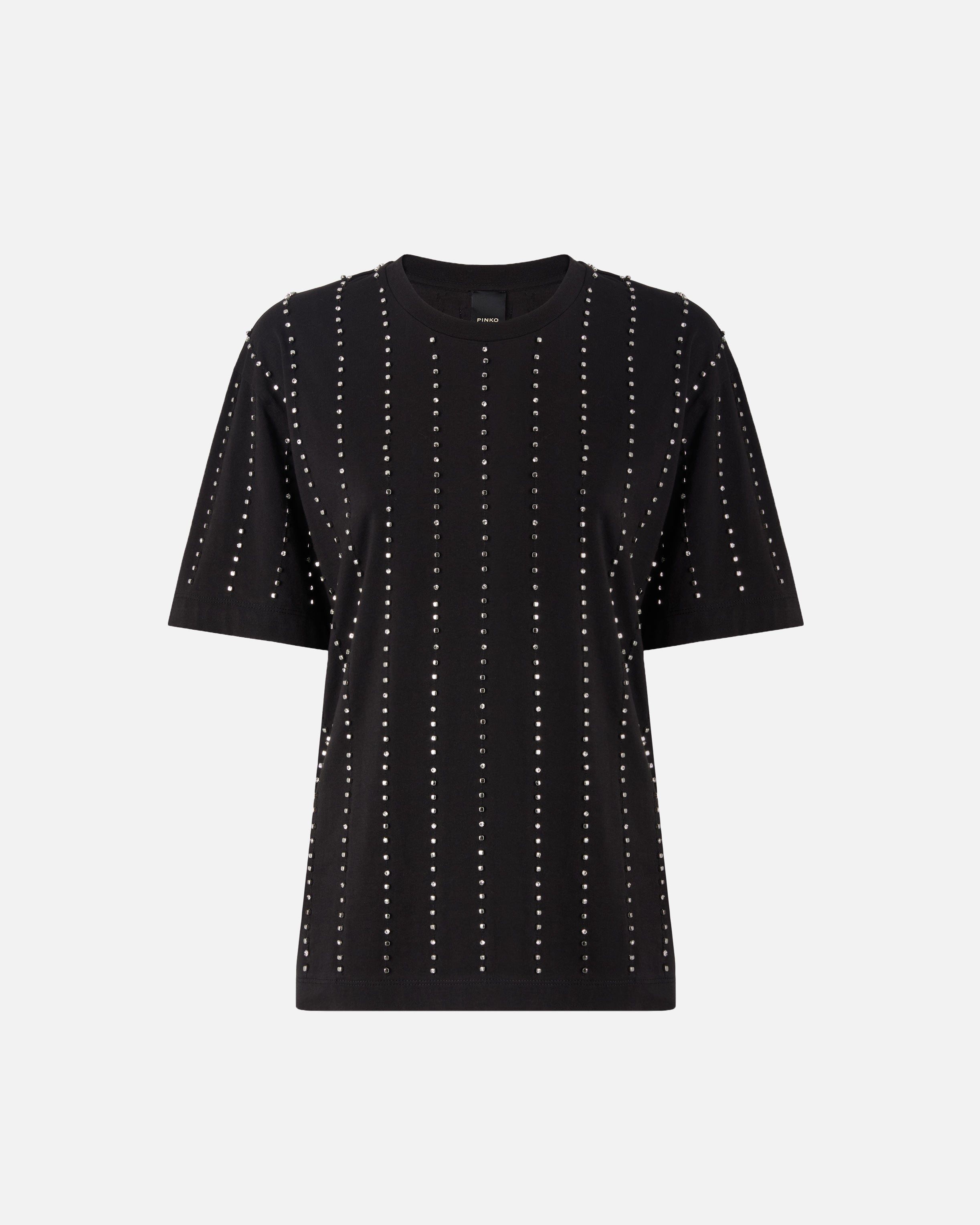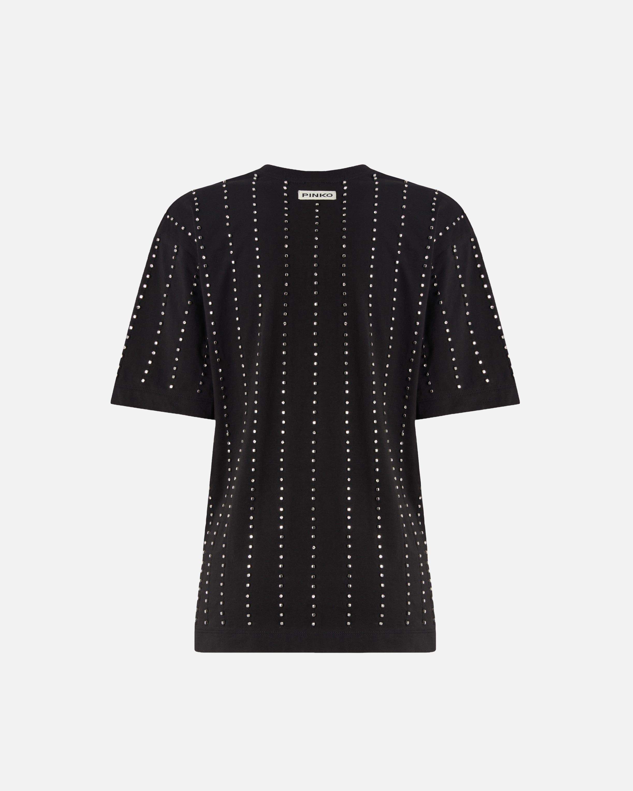 T-shirt girocollo a mezza manica in jersey di cotone. Il capo si presenta come un vero e proprio gioiello, grazie al particolare disegno a righe d'ispirazione gessato ottenuto grazie all'alternanza di piccoli elementi metallici a forma di cubetto e cristalli incastonati ricamati a mano. Il tocco finale è dato dall'etichetta con logo lettering PINKO sul retro. Grazie al design versatile ma elegante, è il sottogiacca perfetto abbinato a pantaloni sartoriali, ma anche a un paio di jeans speciali. - WILMA T-SHIRT