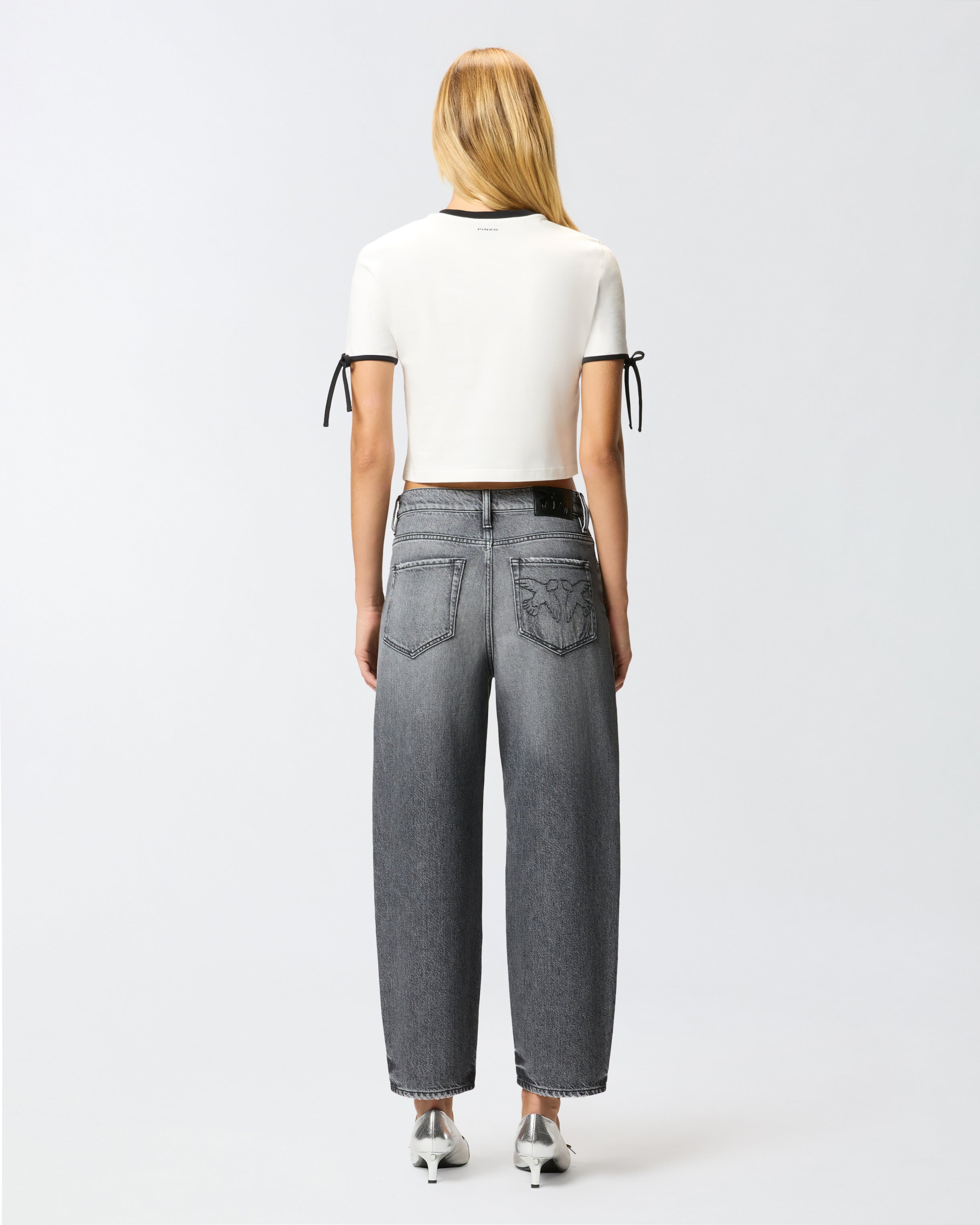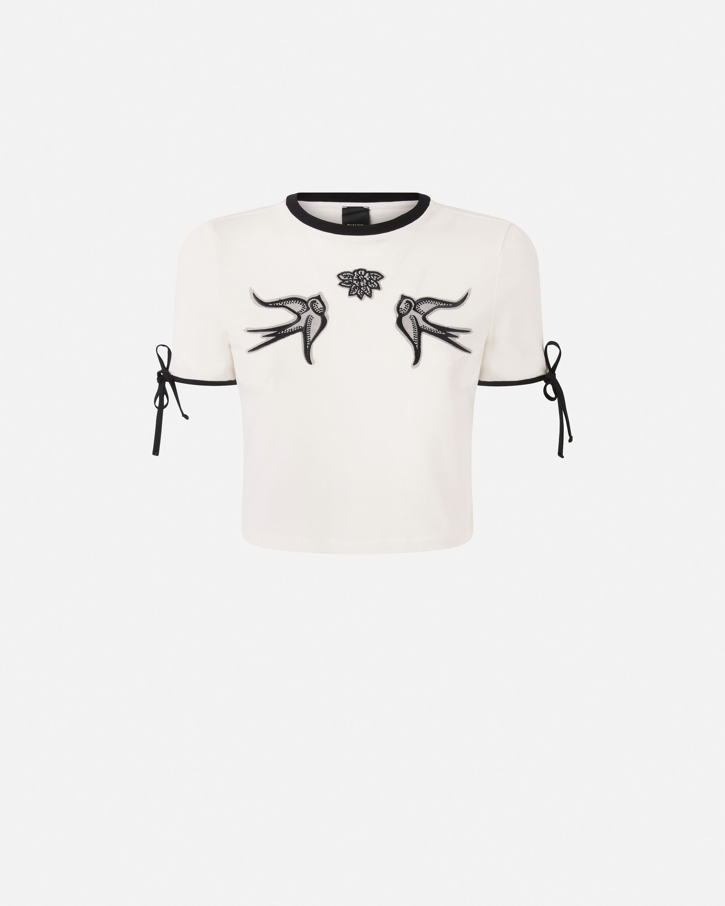 T-shirt cropped a maniche corte in jersey di puro cotone. Il davanti è caratterizzato dal ricamo con applicazione in micro-rete che raffigura il logo Love Birds. Il fondo manica è impreziosito da una chiusura a fiocco a contrasto, nella stessa tonalità del girocollo. Eleva l'eleganza e la femminilità di qualsiasi outfit grazie a questo top, che è il sottogiacca perfetto abbinato a pantaloni sartoriali, ma anche a un paio di jeans speciali.