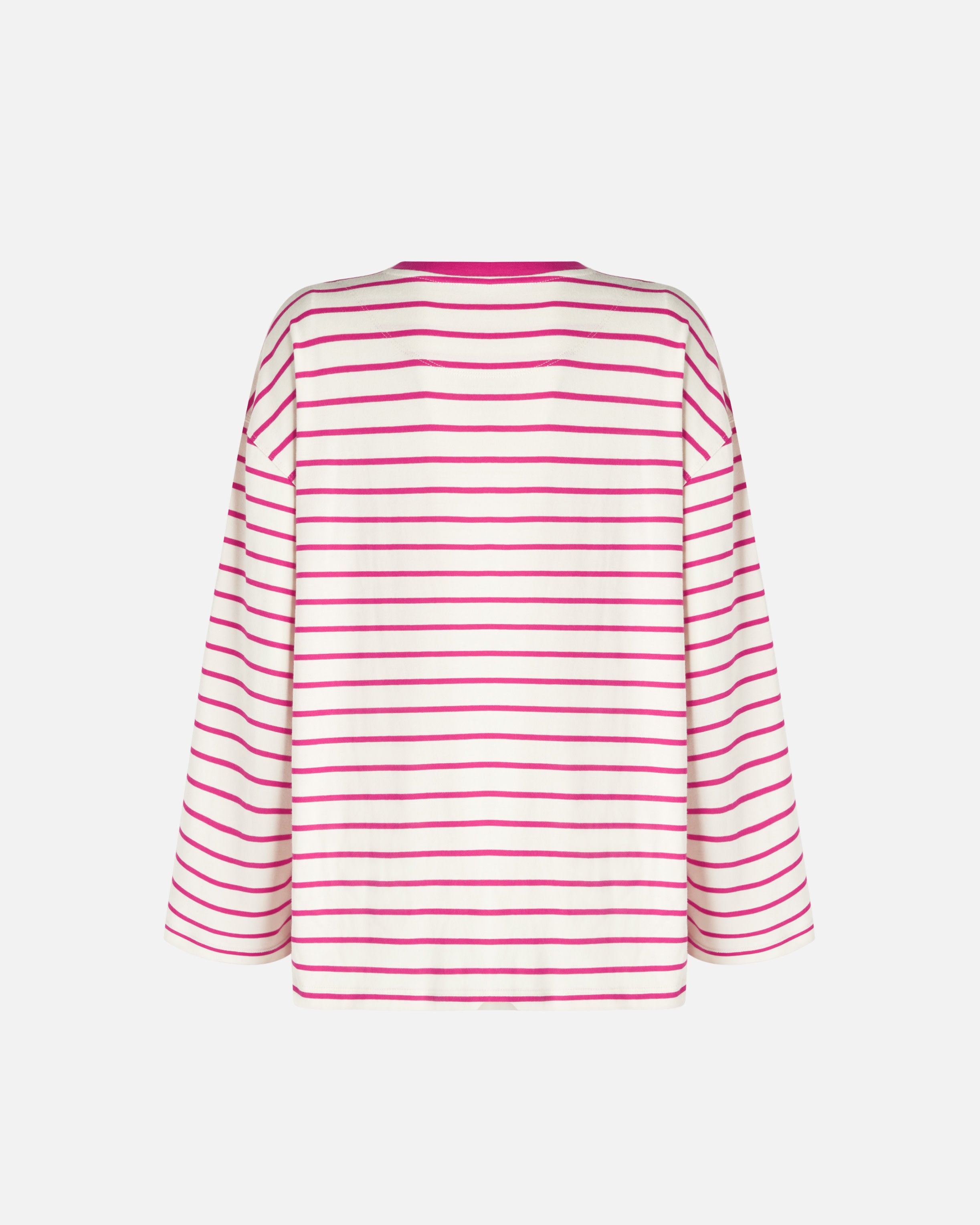 T-shirt a maniche lunghe in jersey di cotone rigato, caratterizzata da una vestibilità morbida e un taglio leggermente over. Il modello è personalizzato dalla stampa sfumata “PINKOMANIA” sul davanti, che interpreta con ironia e carattere l’attitude energica e pop del brand. Il collo, rifinito in contrasto, completa il design dal mood contemporaneo e disinvolto, perfetto da abbinare a denim o minigonne per un look easy ma distintivo. Indossa questa maglia e lasciati trasportare dall'effetto PINKOMANIA!