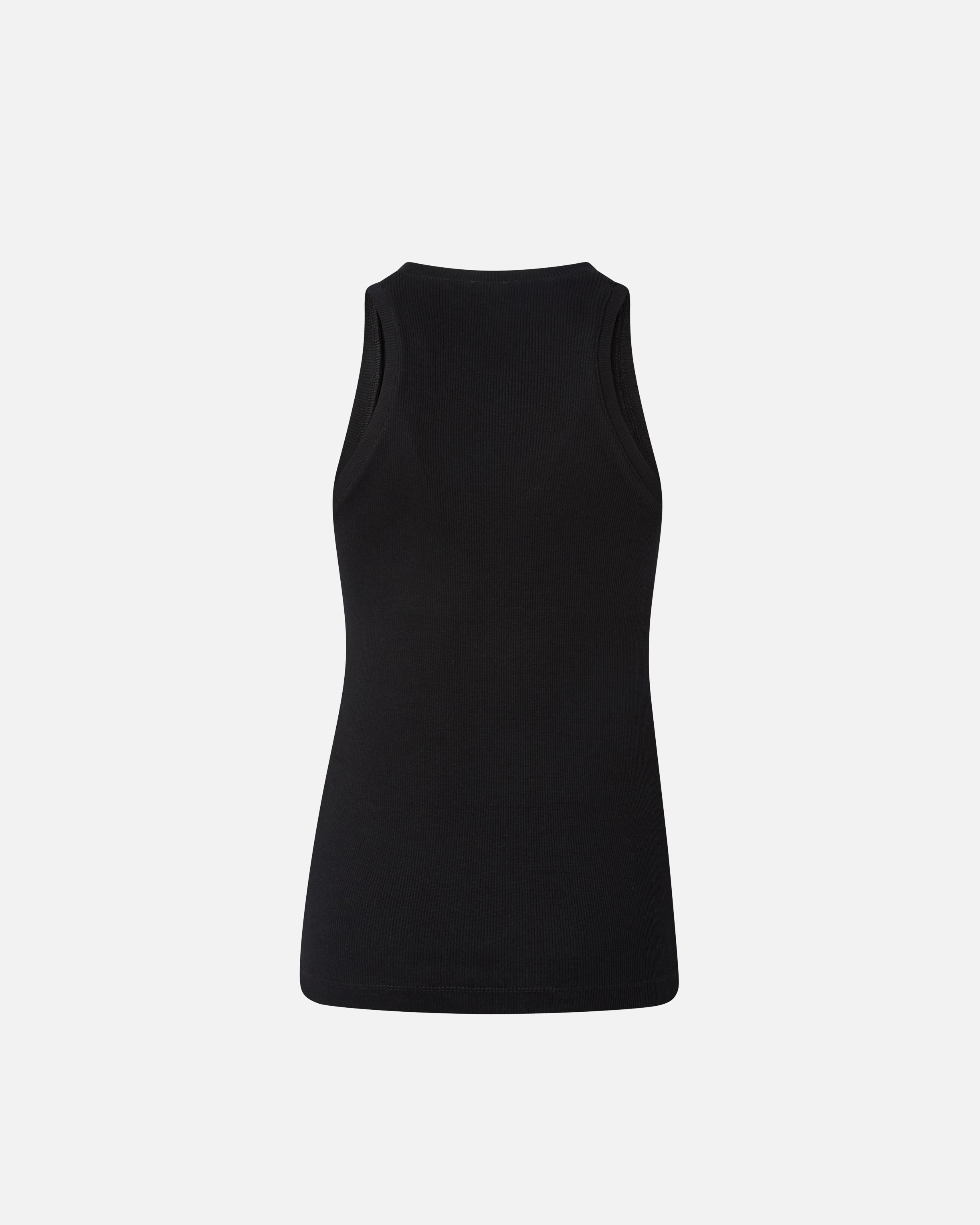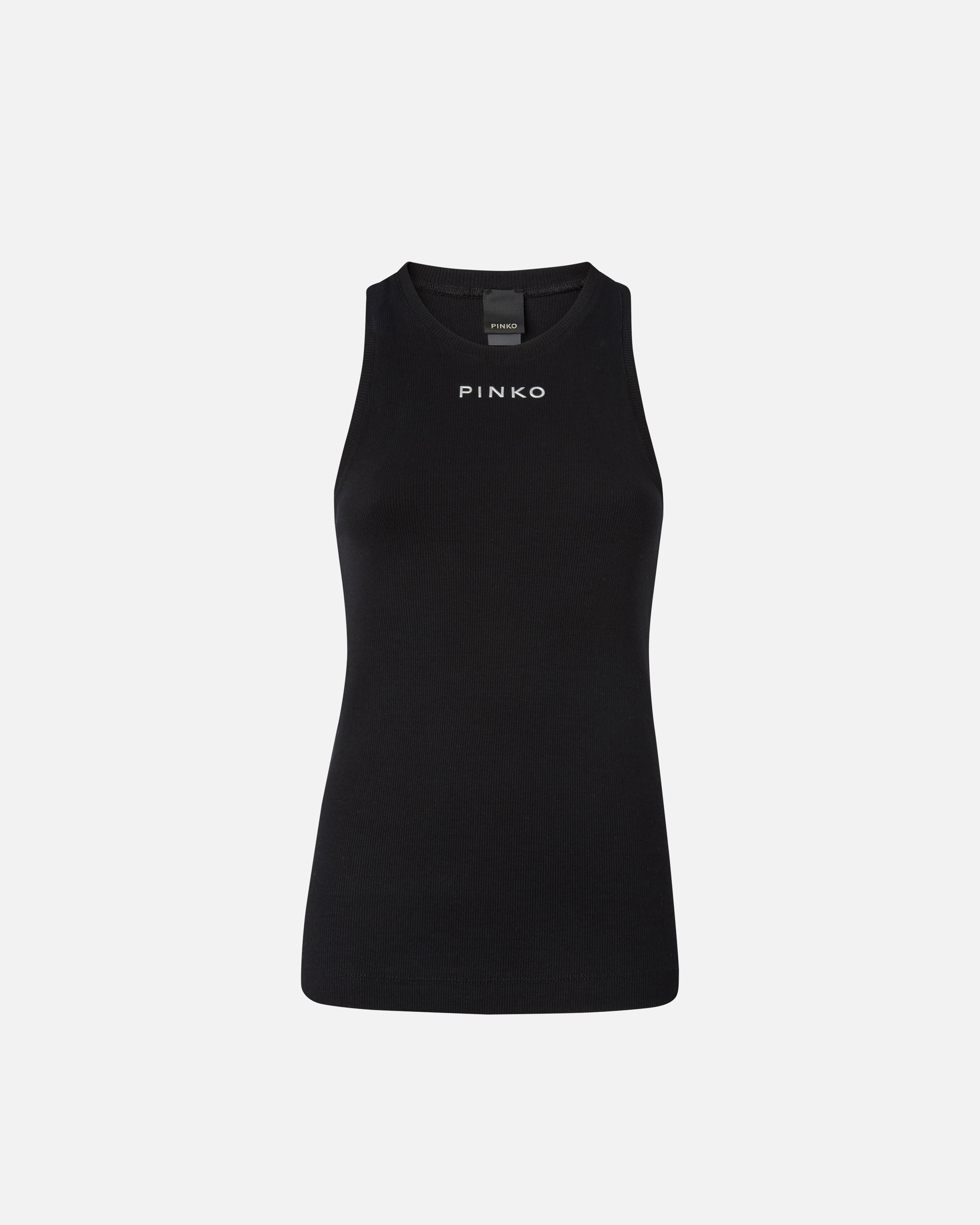Tank top senza maniche in jersey di cotone stretch con scollo a vogatore e ricamo logo lettering PINKO davanti. La canotta a costine è un capo basico del guardaroba, per costruire look primaverili quotidiani funzionali e femminili al tempo stesso.