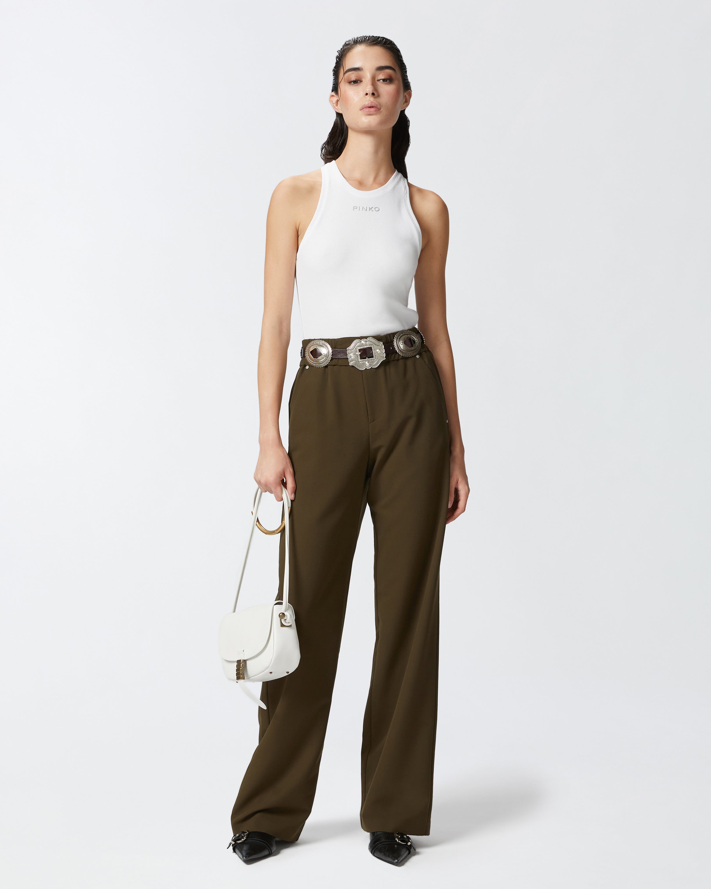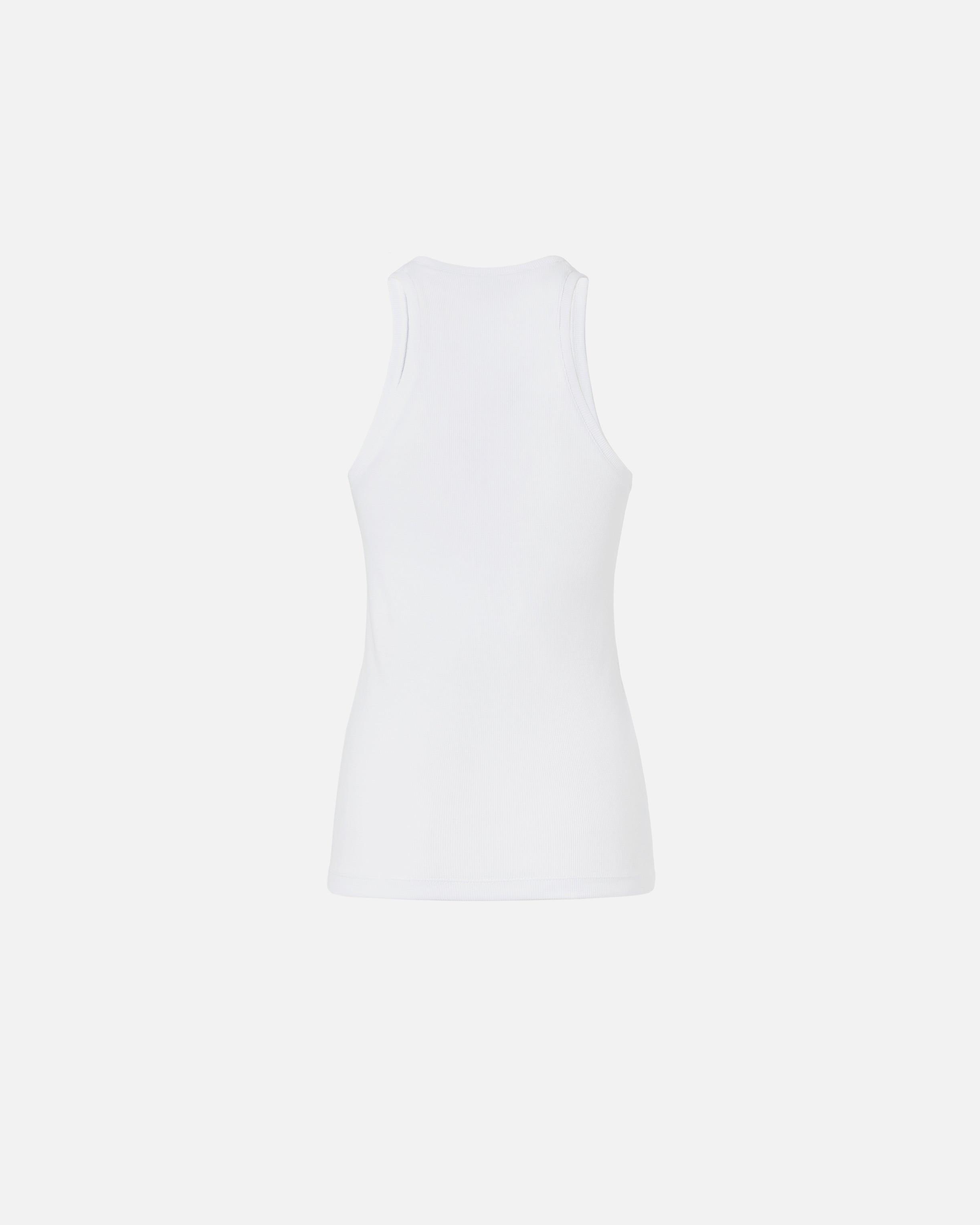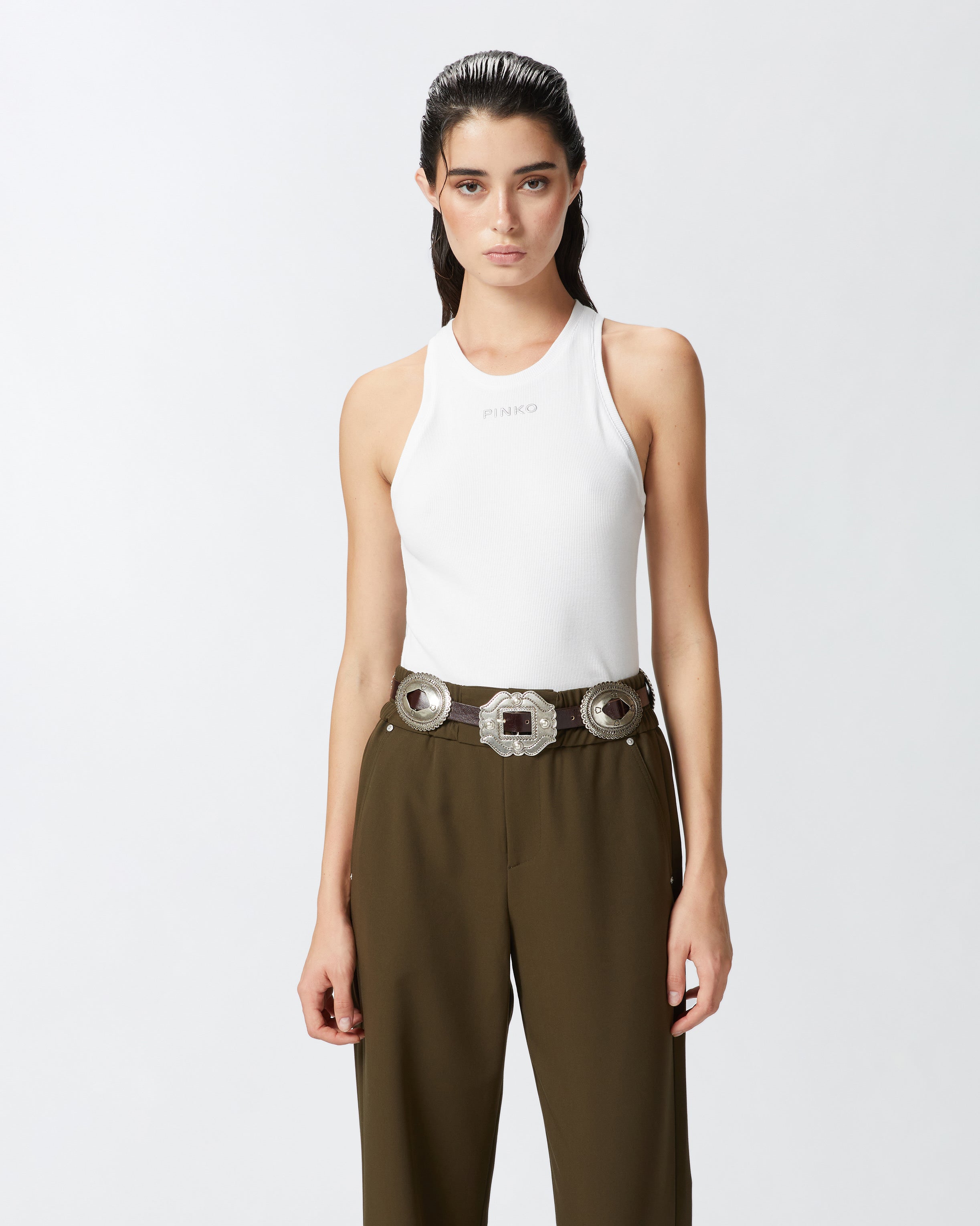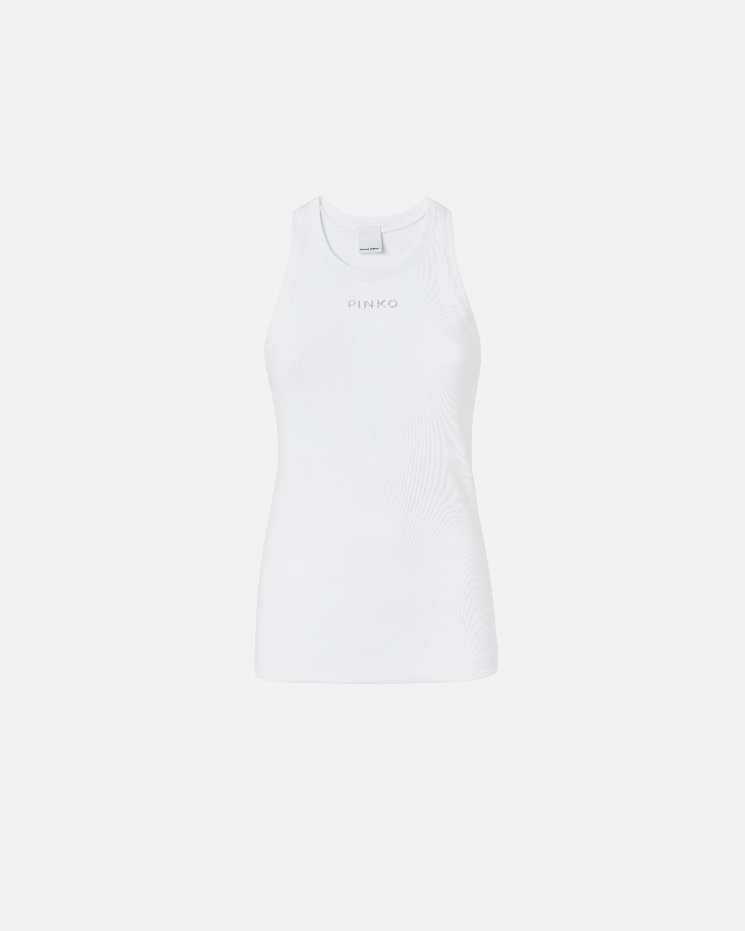 Top aderente senza maniche dalla silhouette a canottiera con scollo vogatore sul retro in maglia di cotone stretch lavorata a costine, personalizzata con mini logo PINKO davanti al centro.