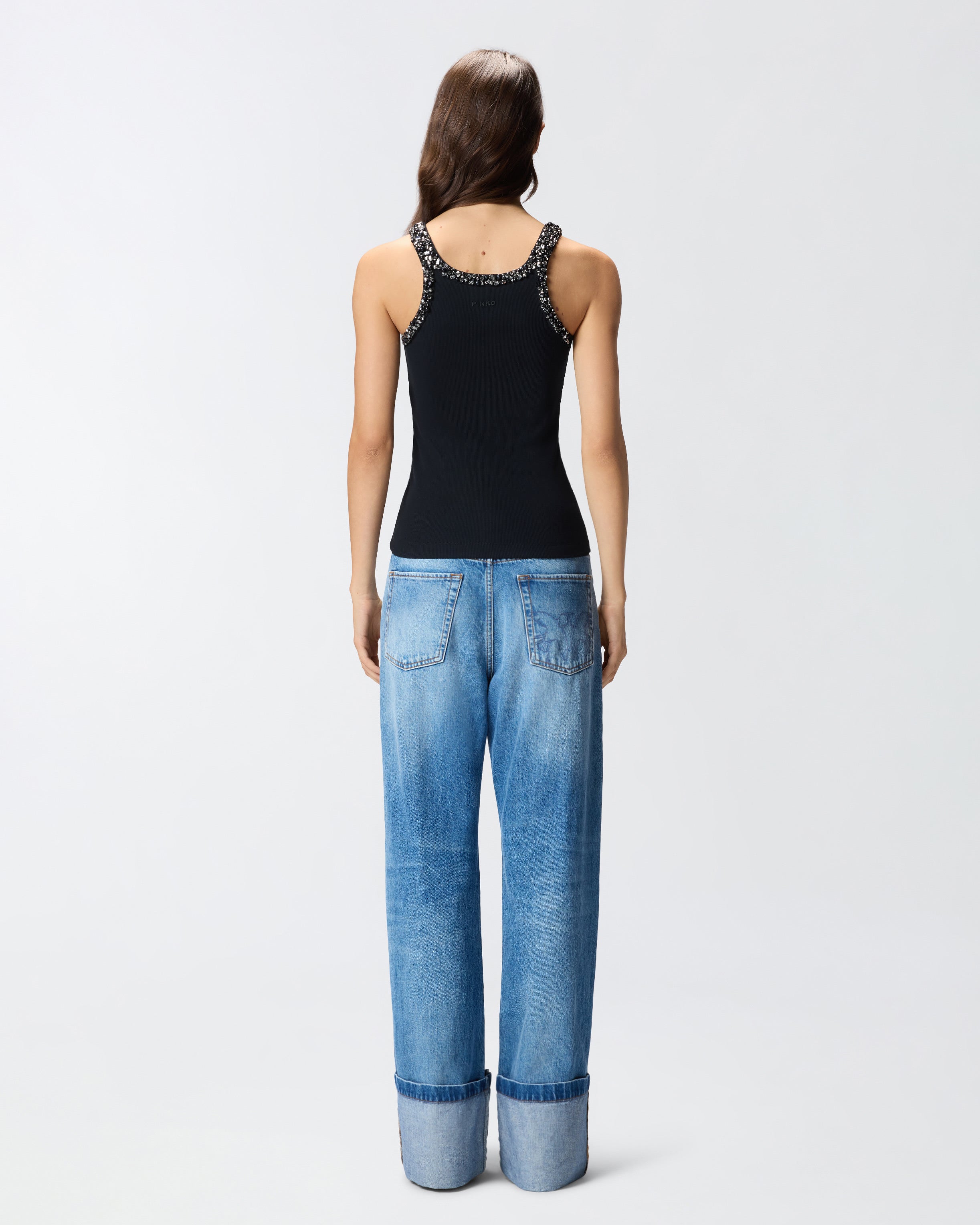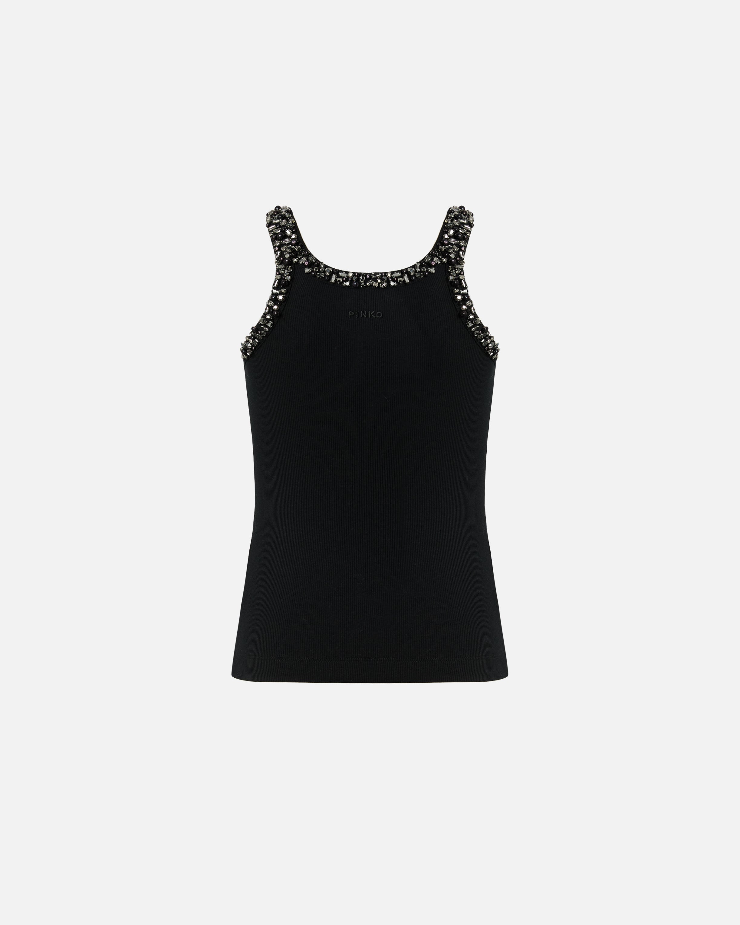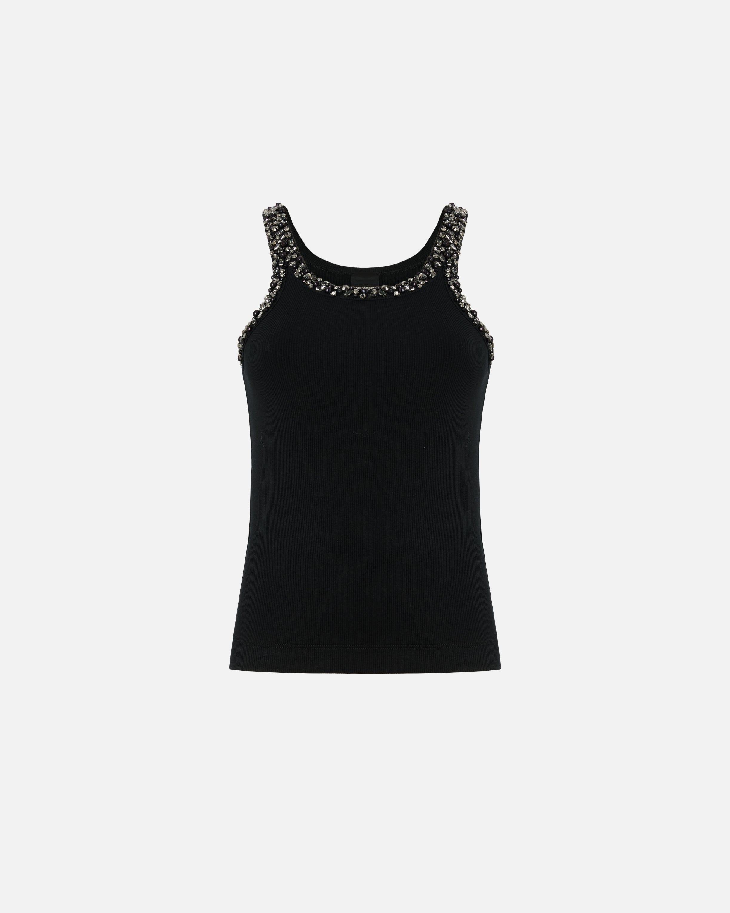 Top a canotta realizzato in jersey di cotone lavorato a costine. Le spalline e le scollature davanti e dietro sono ricoperte di cristalli, strass e dettagli in vetro sapientemente ricamati a mano che donano luce e preziosità al capo. Eleva l'eleganza e la femminilità di qualsiasi outfit grazie a questo top, che è il sottogiacca perfetto abbinato a pantaloni sartoriali, ma anche a un paio di jeans speciali.