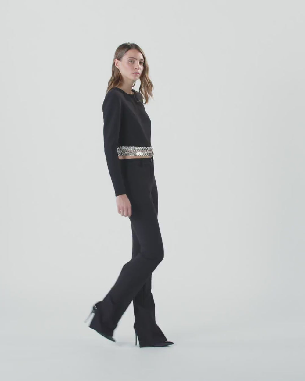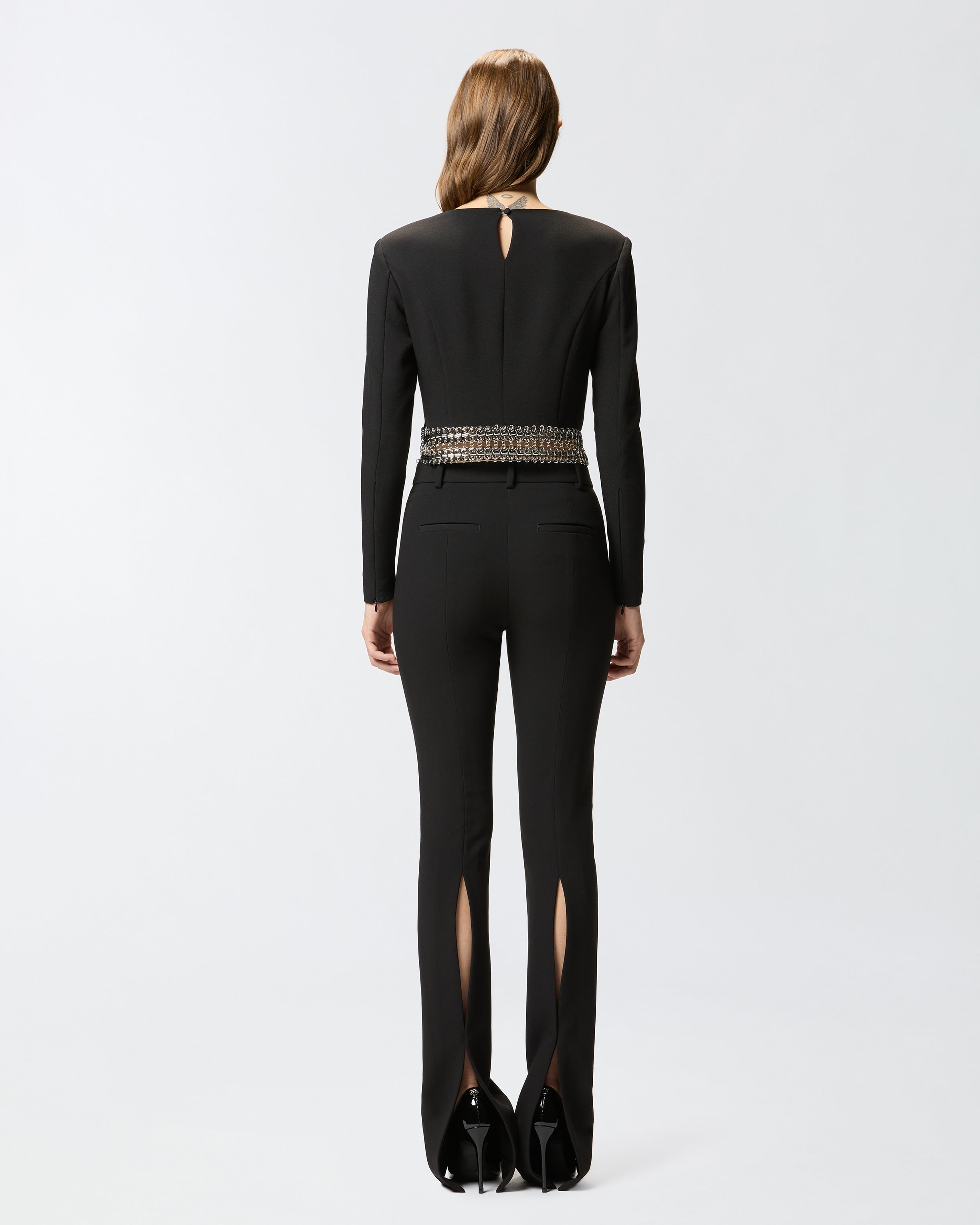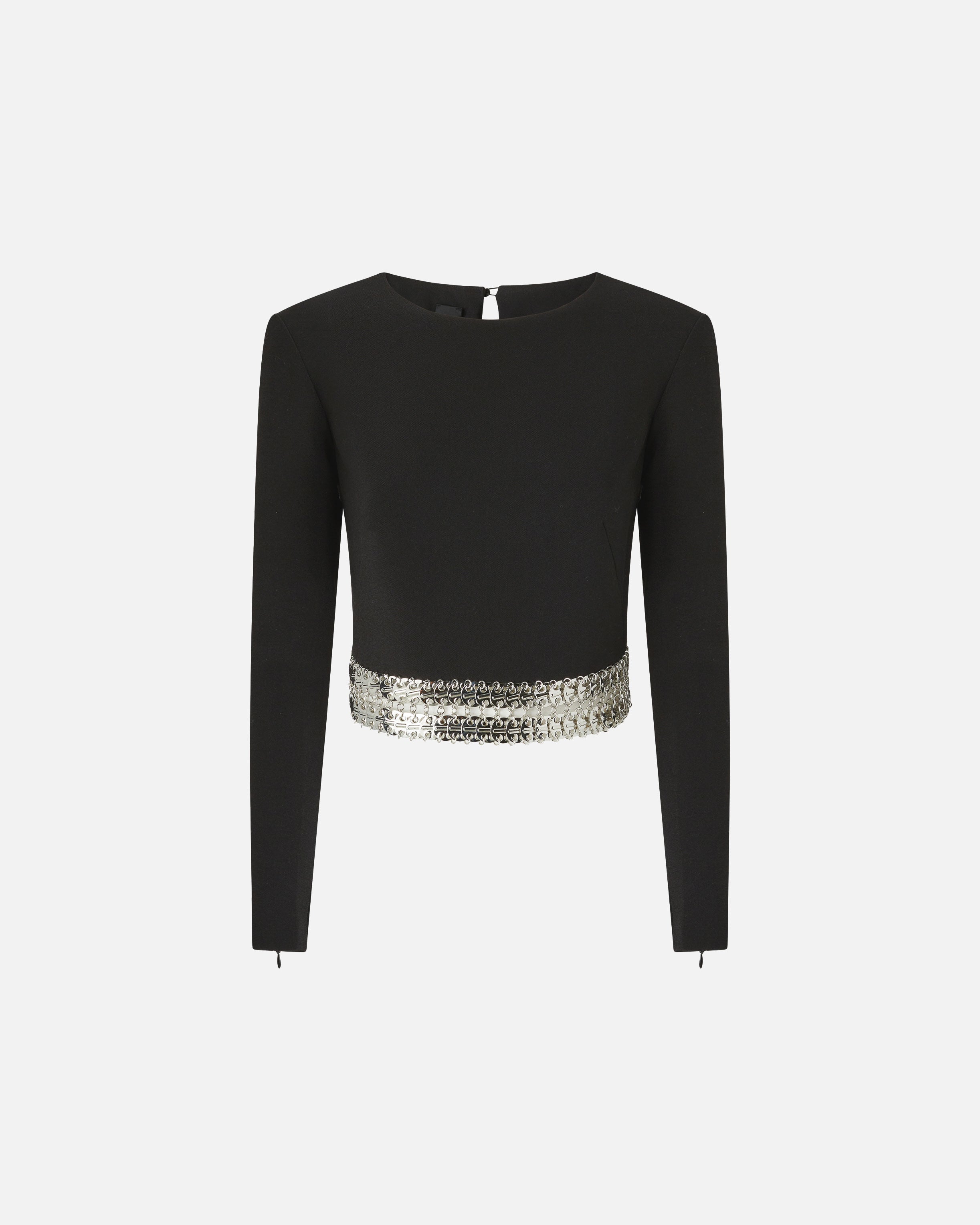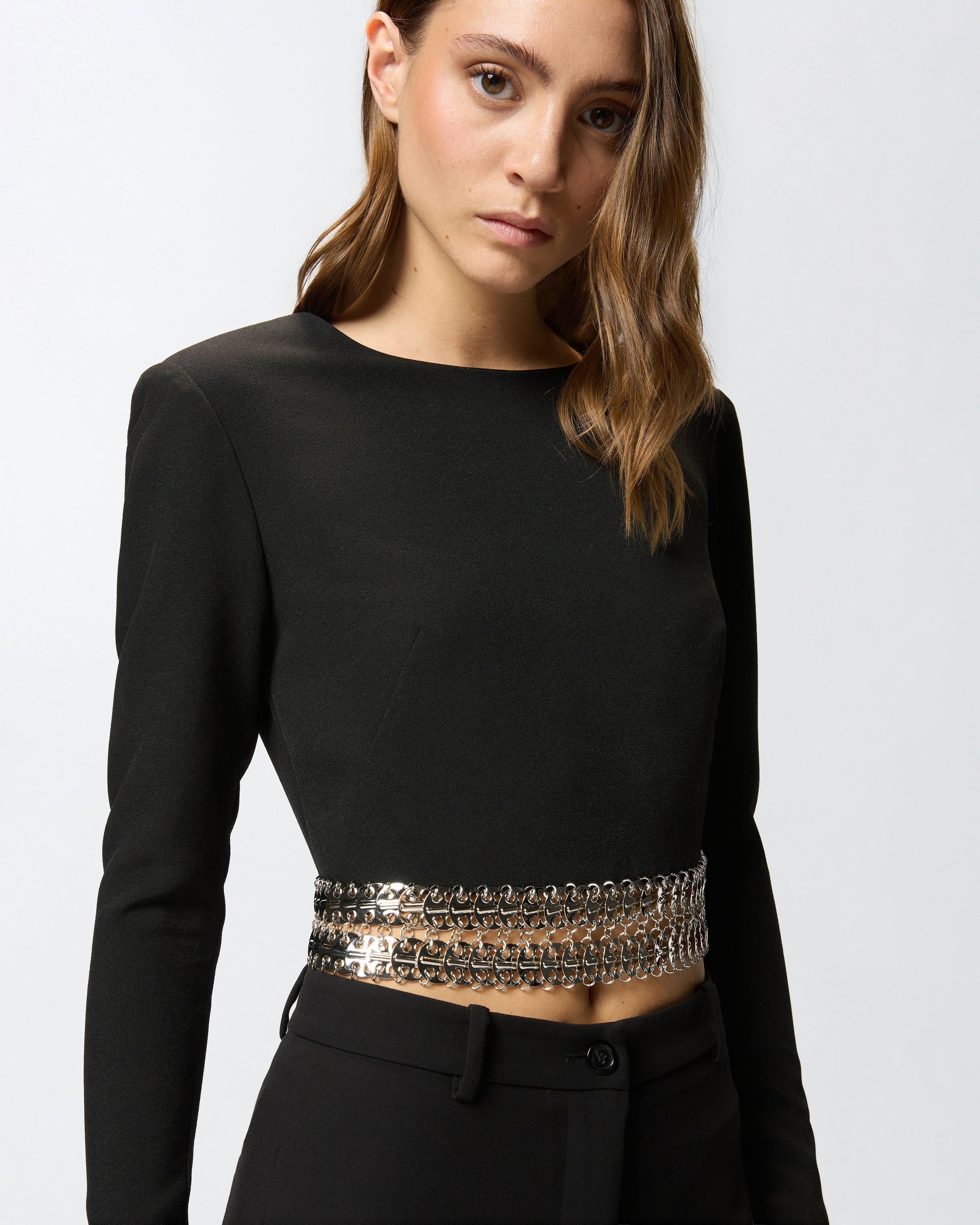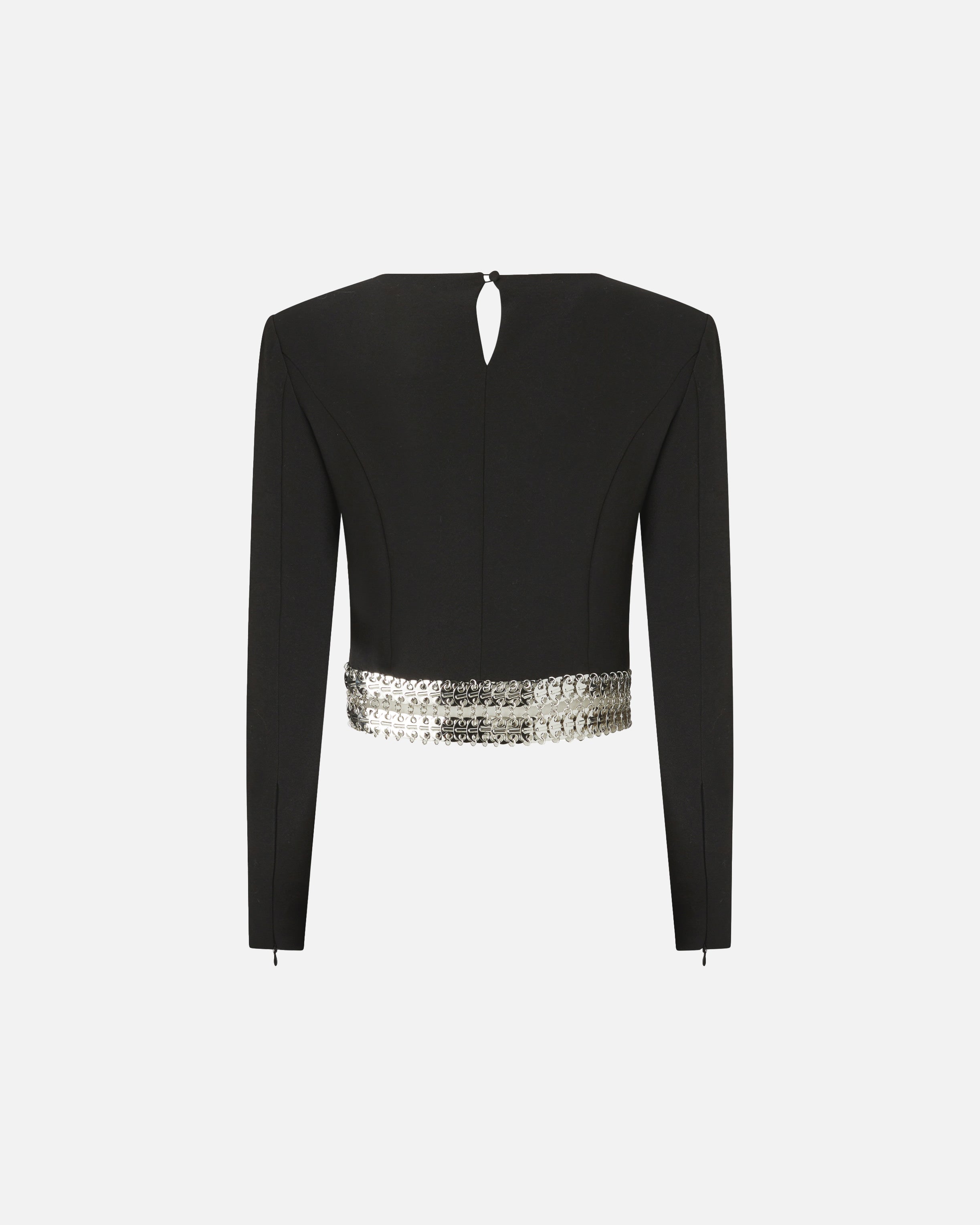 Top a maniche lunghe in crêpe di misto viscosa con chiusura a goccia con bottone sul retro e zip sui polsini per personalizzare il design. Il retro del modello presenta cuciture in lunghezza dallo stile classico e sartoriale, mentre le decorazioni a catena ricamate sul fondo completano il design con un tocco originale e sensuale. Fai brillare i tuoi look serali con questo capo tanto semplice quanto raffinato.