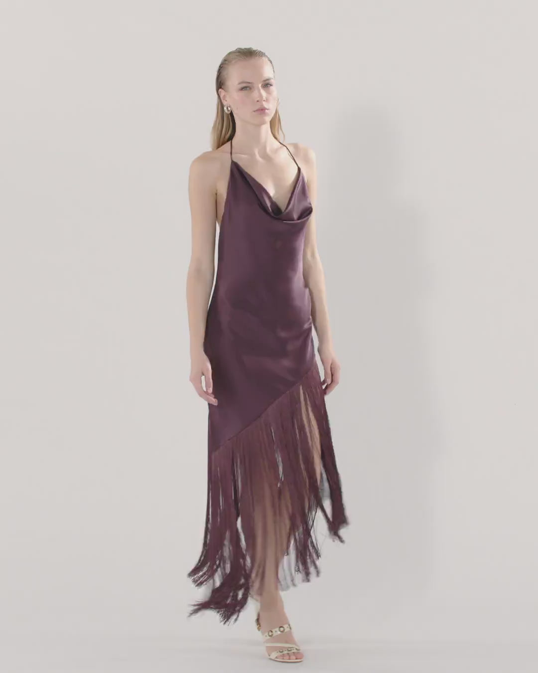 Top senza maniche dalla silhouette aderente ma scivolata, realizzato in un lucente e setoso satin e caratterizzato da un particolare design lungo con orlo asimmetrico. Il capo presenta un morbido scollo drappeggiato con sottili nastrini da annodare dietro il collo e parte della schiena scoperta, ed è arricchito da lunghe e fitte frange sul fondo che ondeggeranno a ogni tuo passo. Grazie alla mano liscia ed elegante del tessuto e al carattere glamour e teatrale della decorazione, questo top è perfetto per trasformarti nella regina indiscussa di party esclusivi e occasioni speciali.